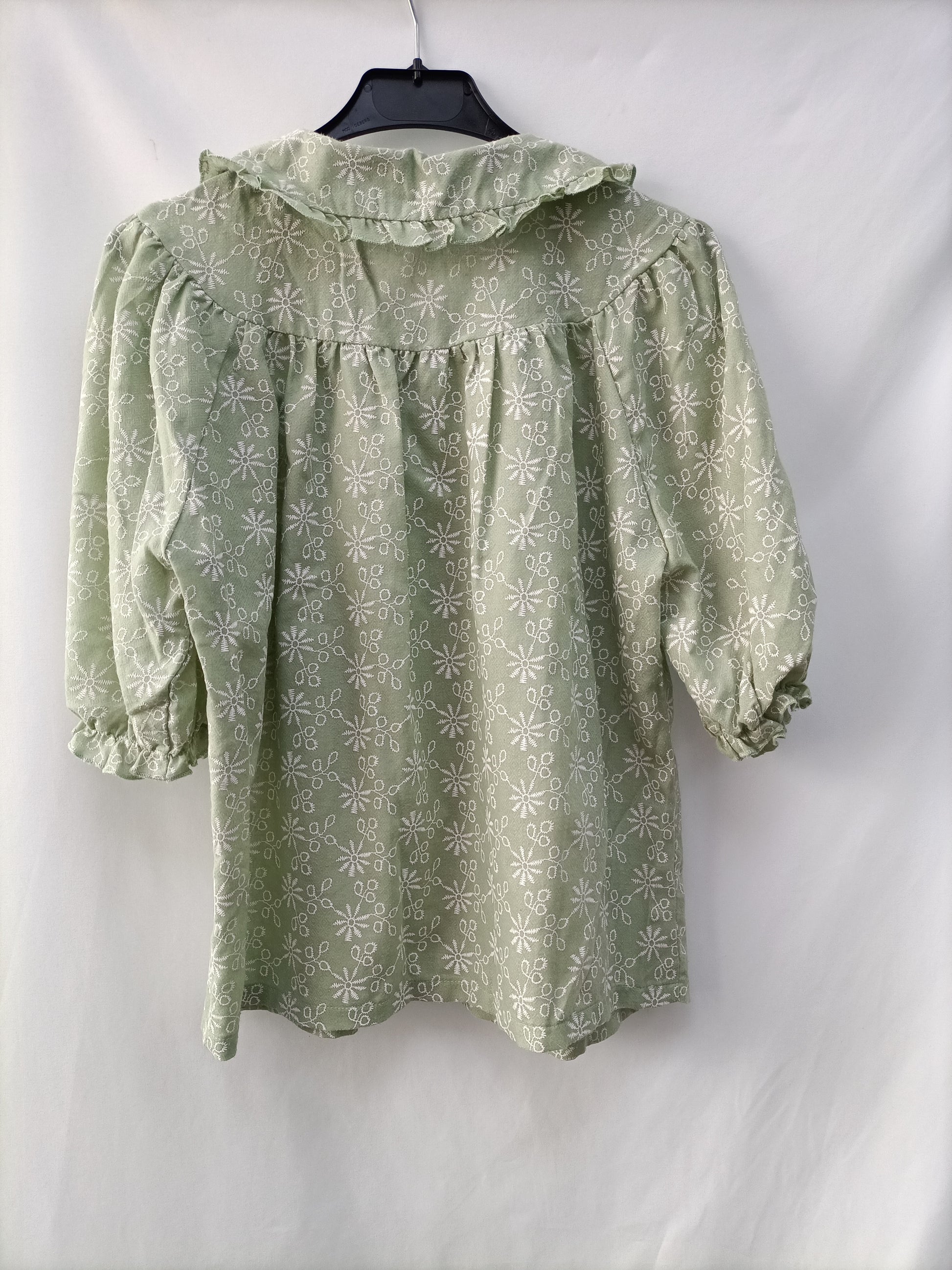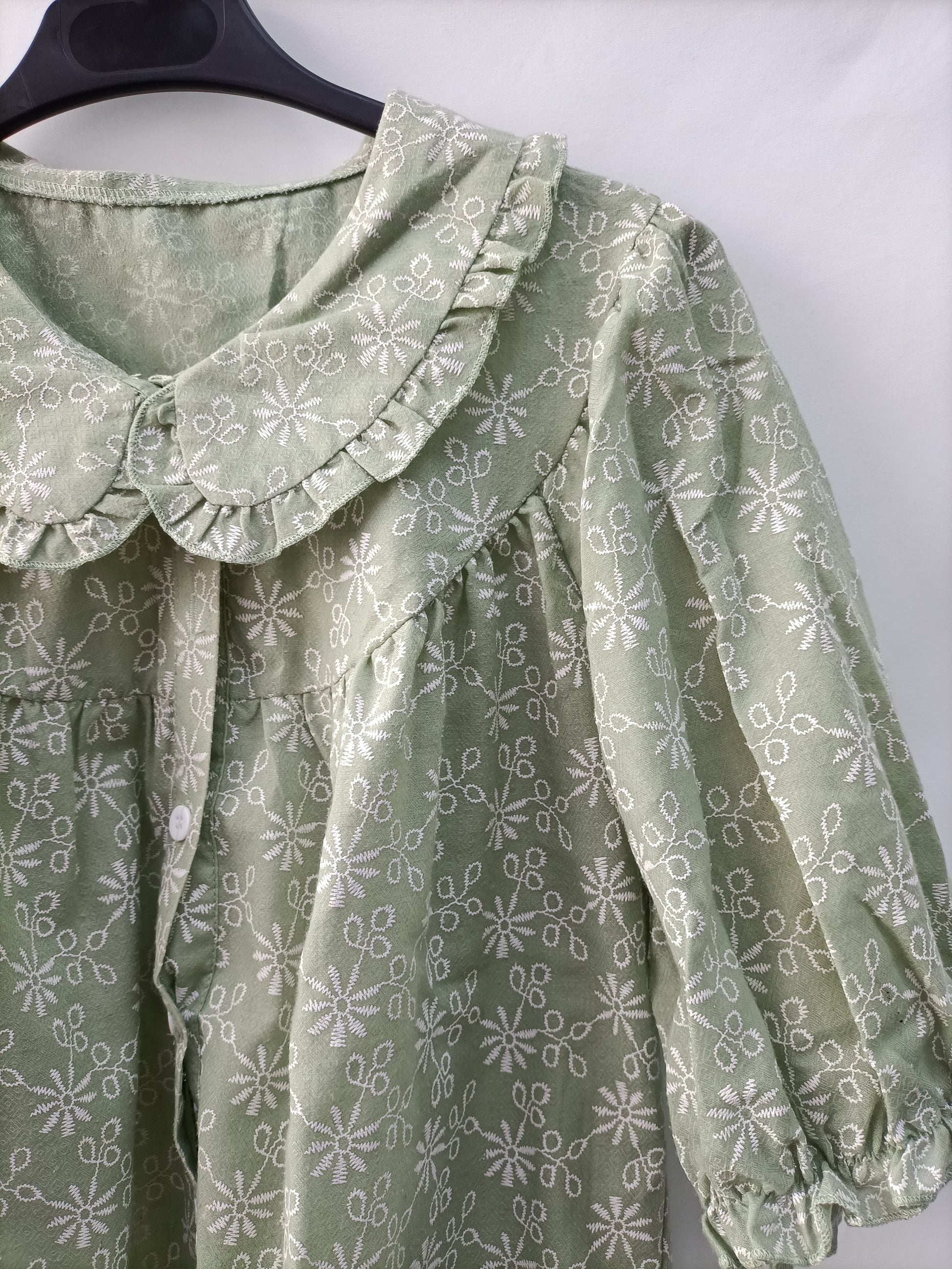 Blusa verde pastel bordados en blanco y cuello bebé. De sisa a siss 57 cm Largo 56 cm