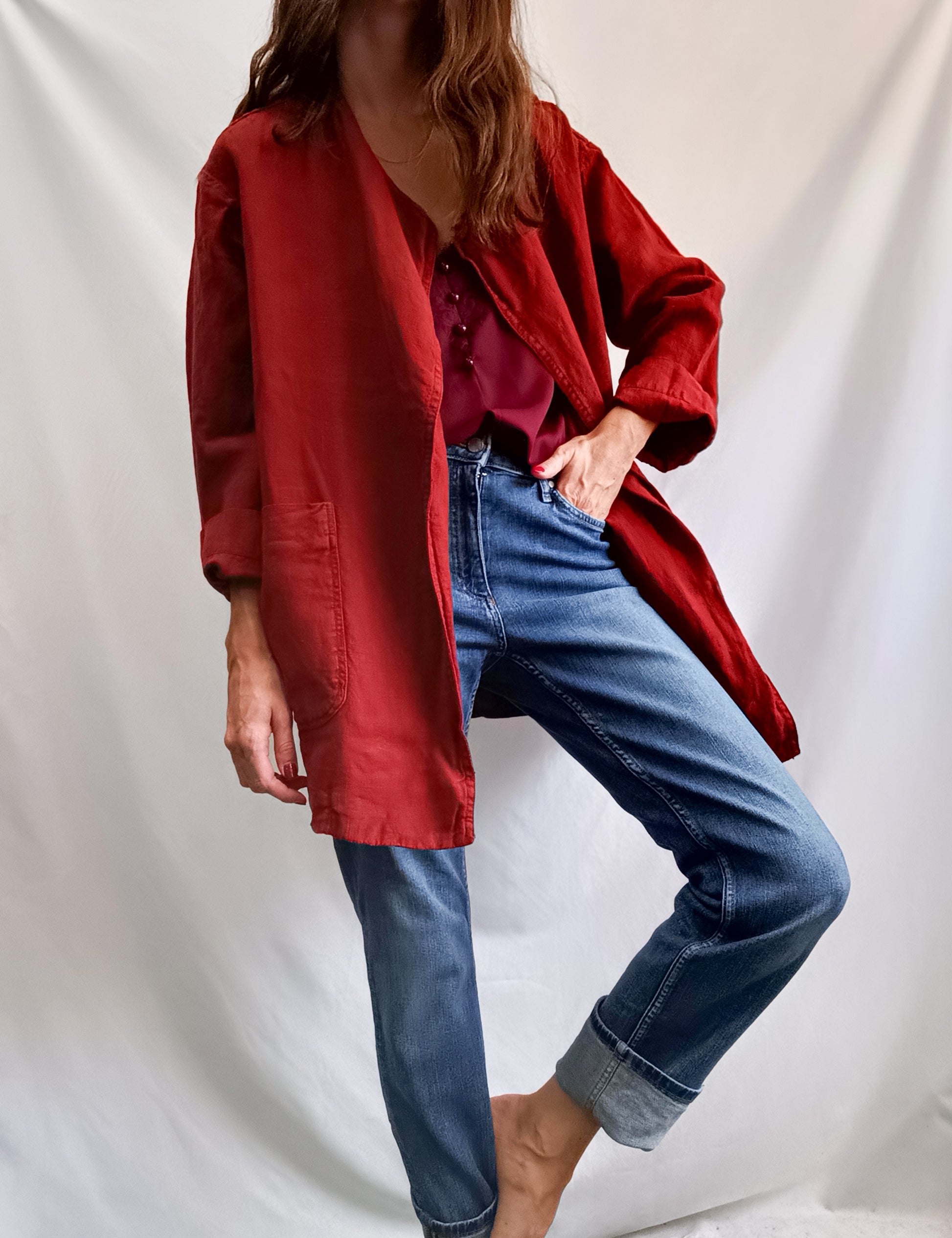 chaqueta de lino burdeos. Oversized. Largo 76 cm