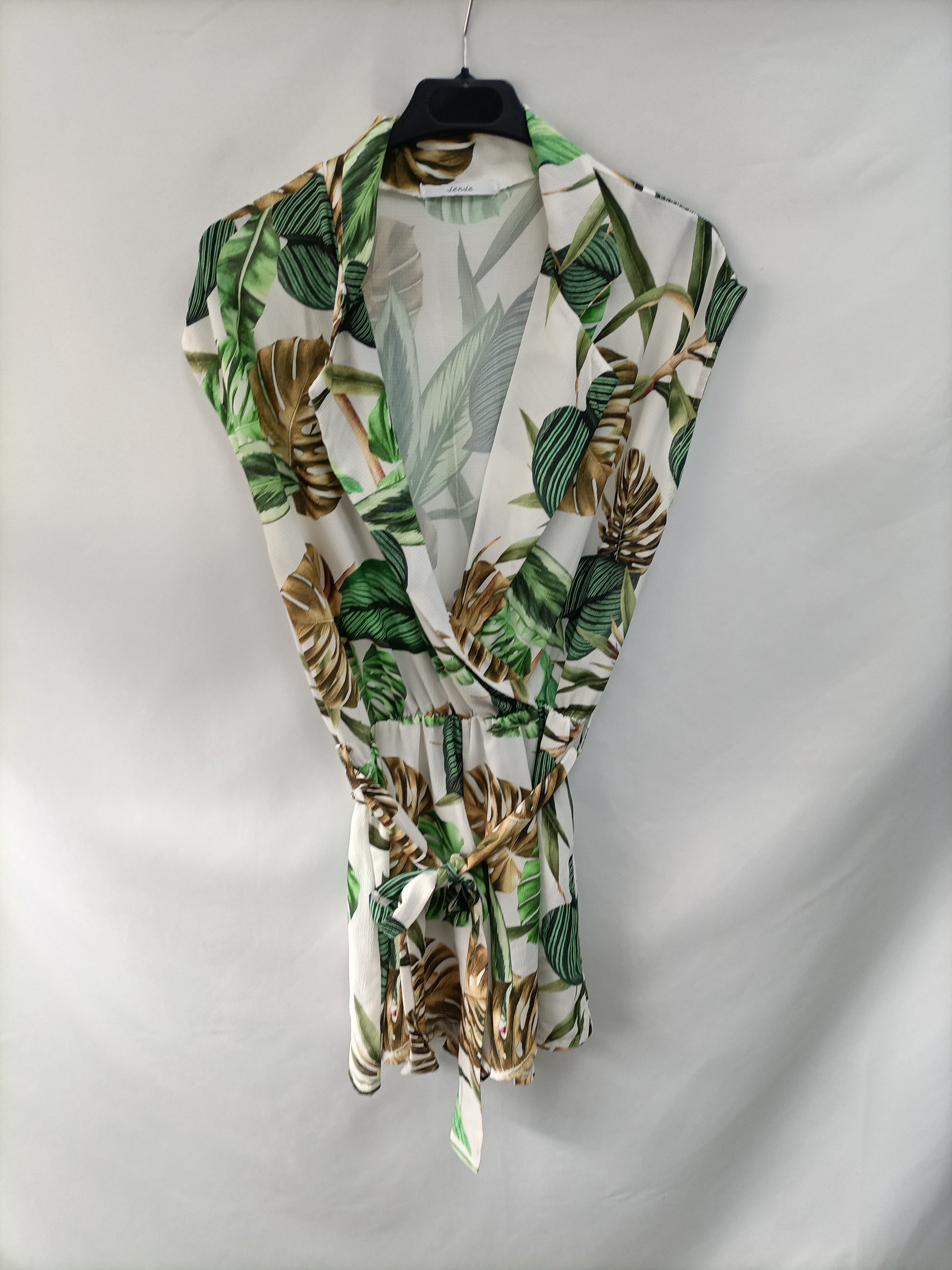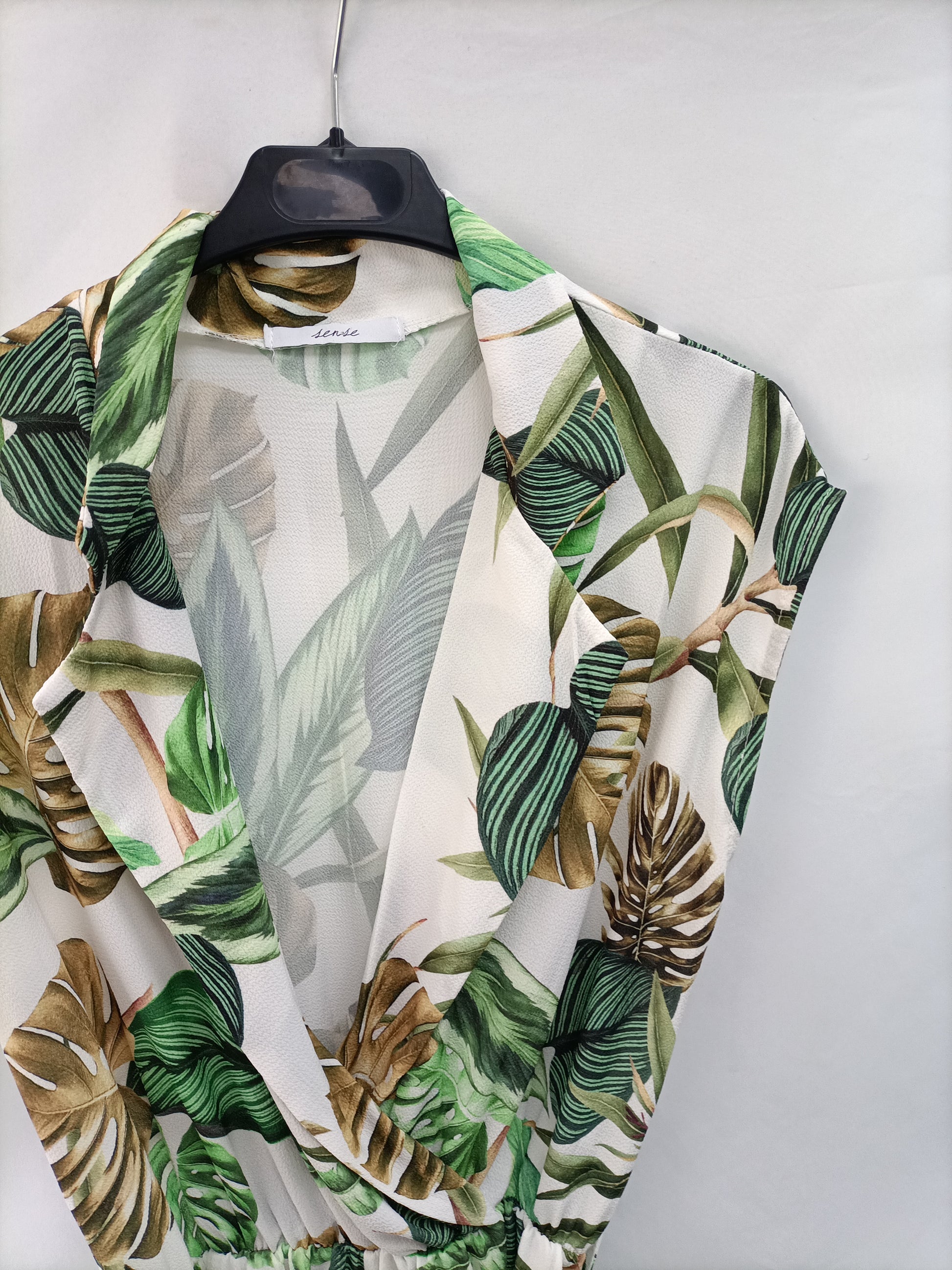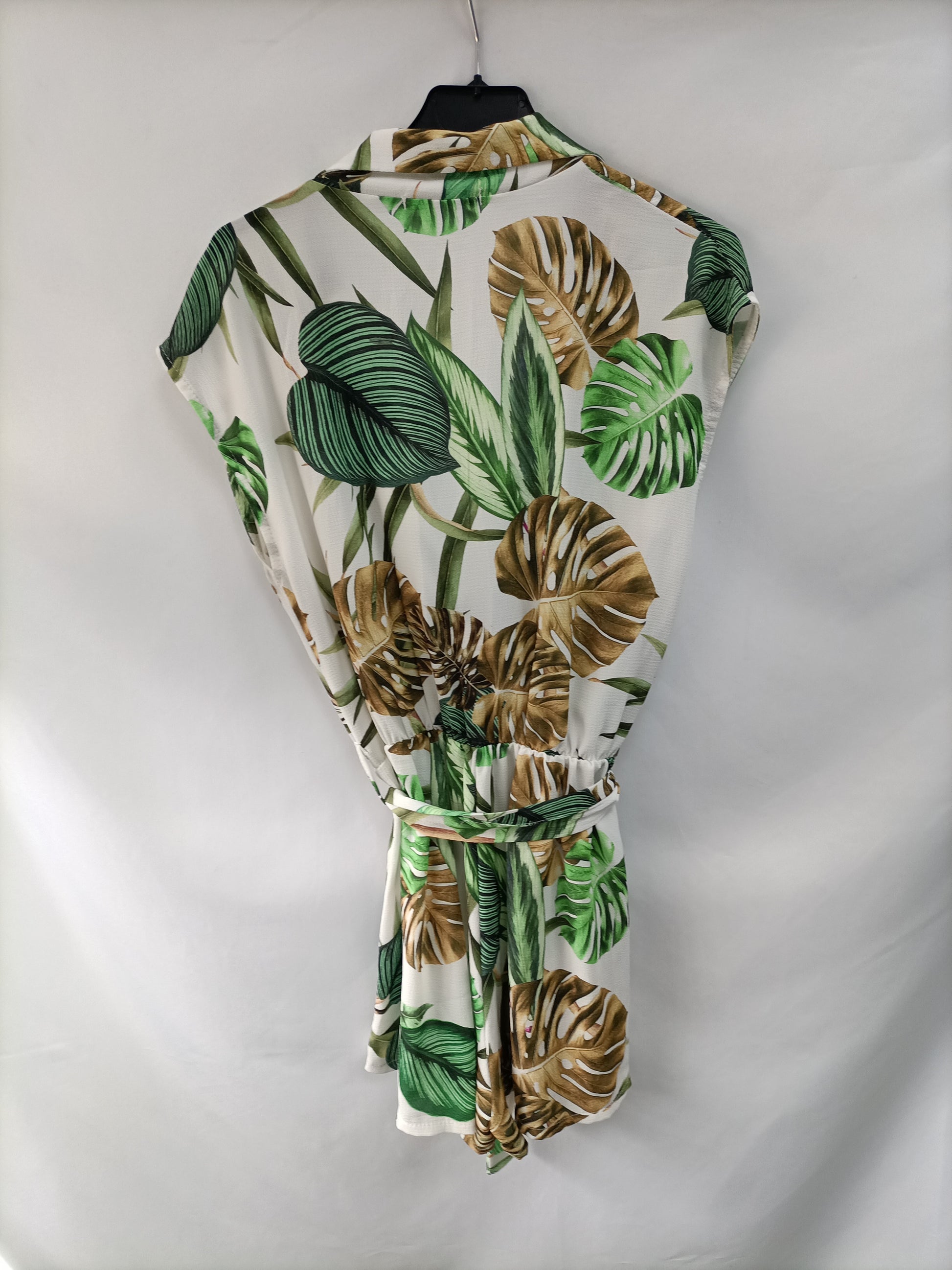 Mono blanco con estampado de hojas. Cintura elástica con lazada. Evite amplio. largo 84 cm