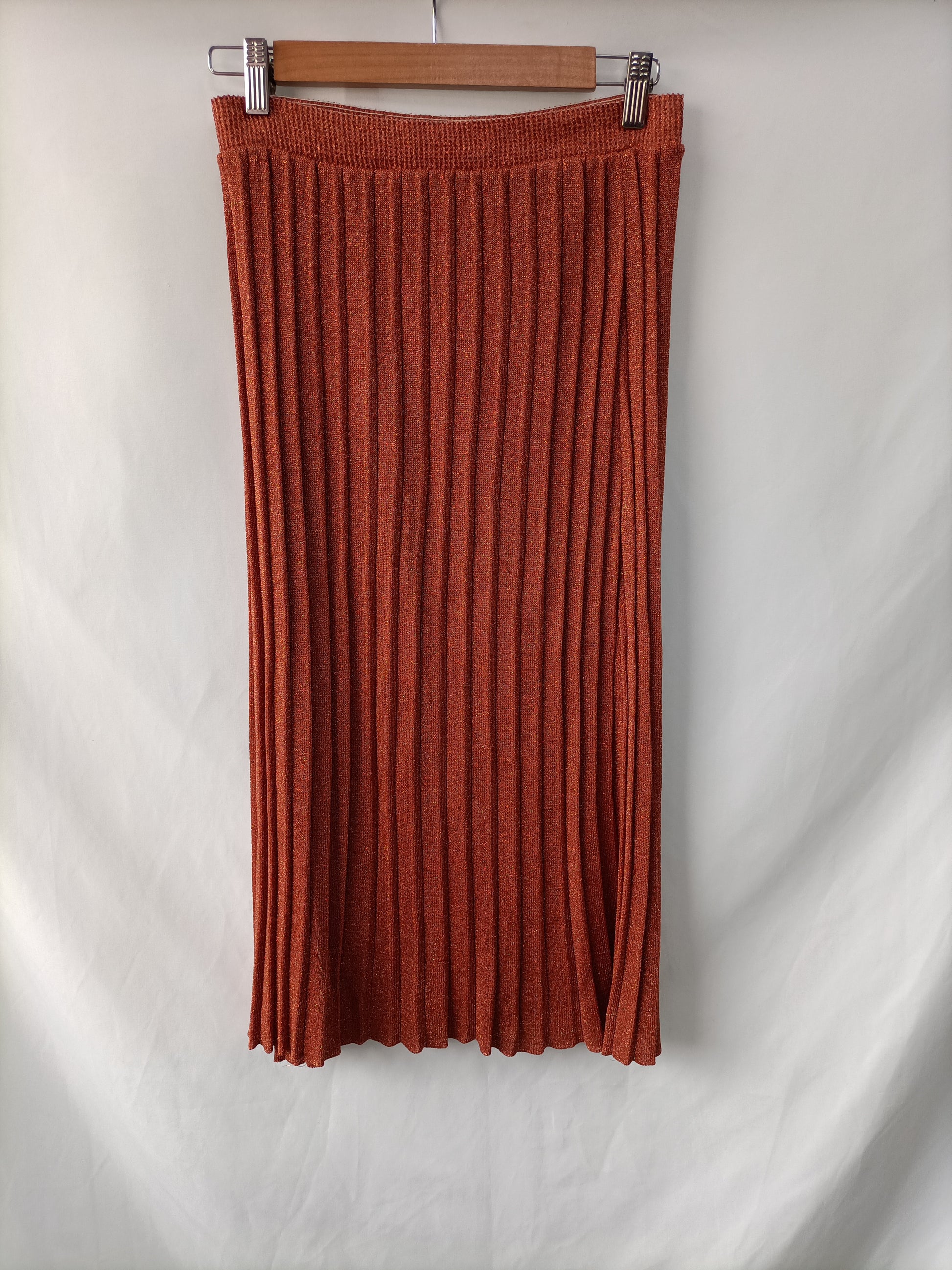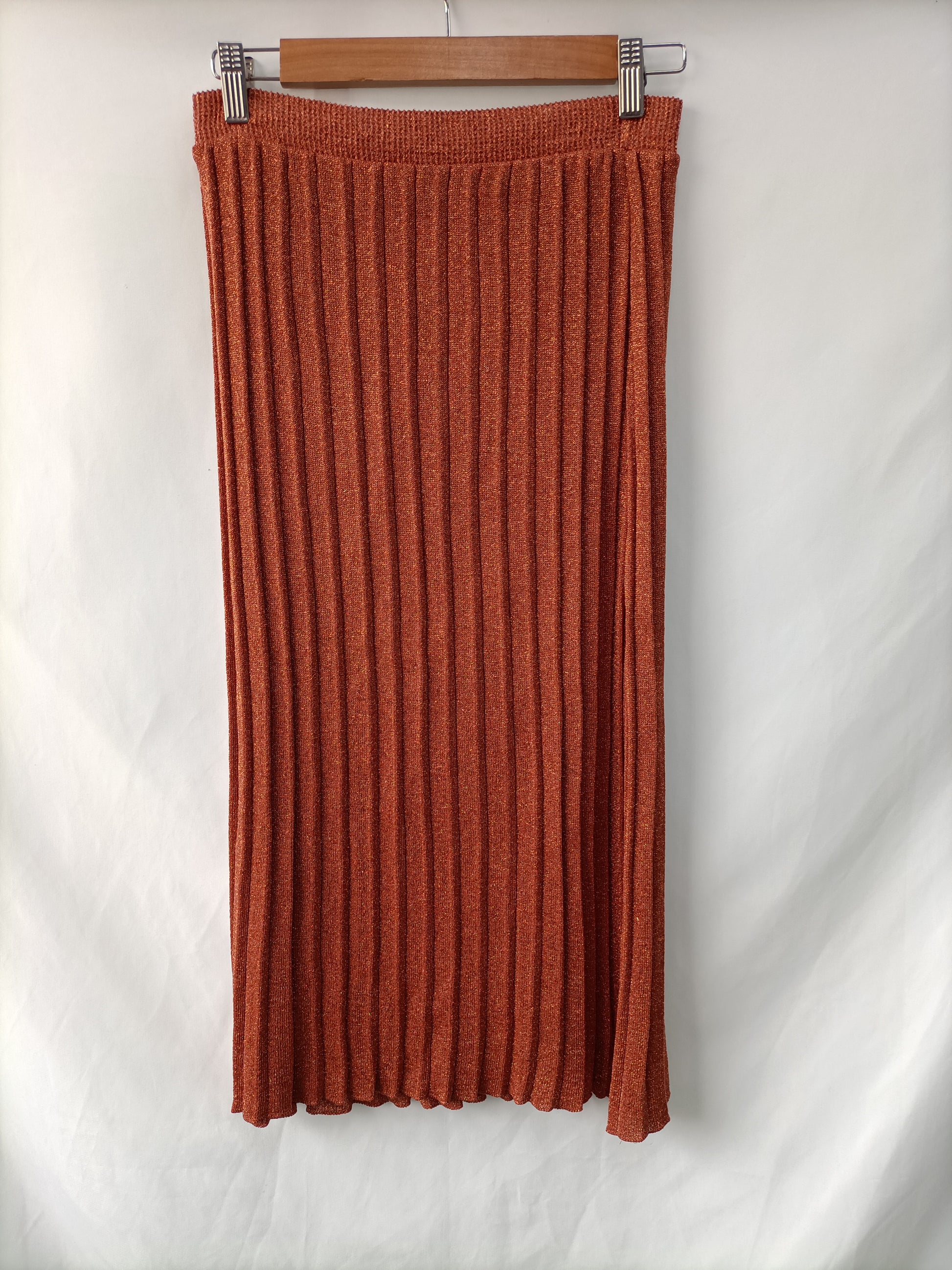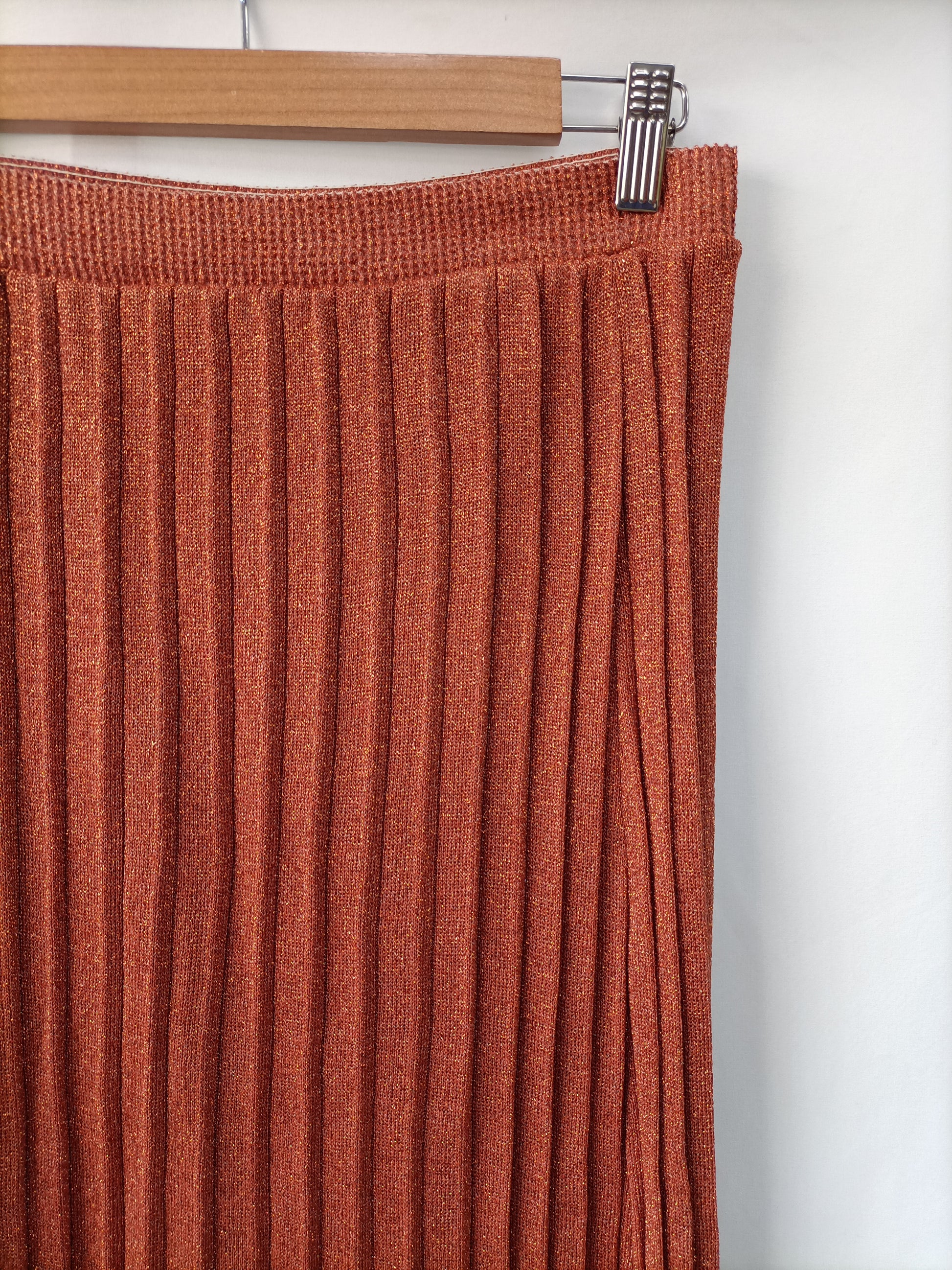 Falda midi de punto color teja con detalle de hilos metalicos. elástica y fluida. largo 78 cm
