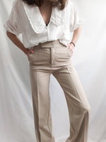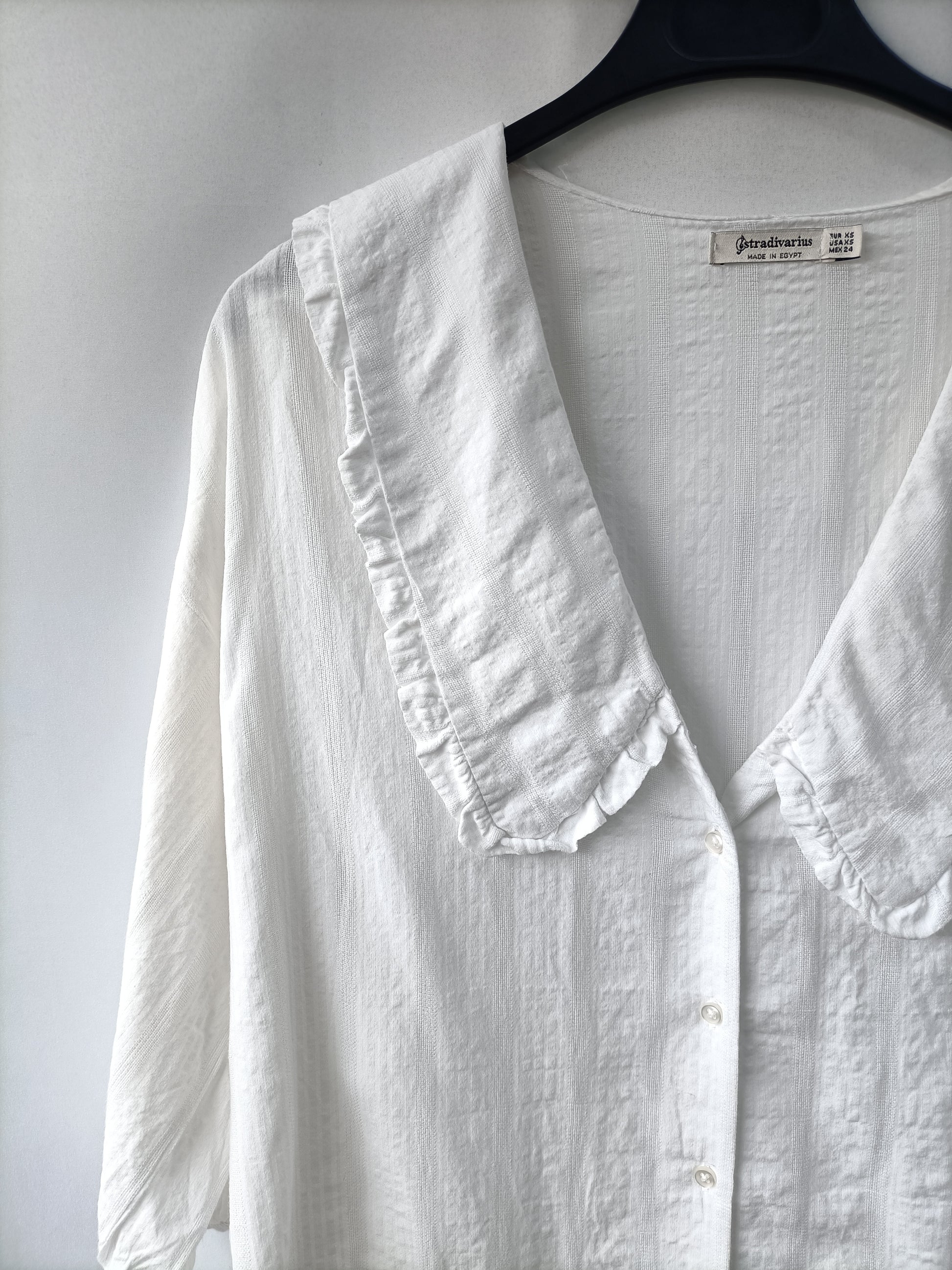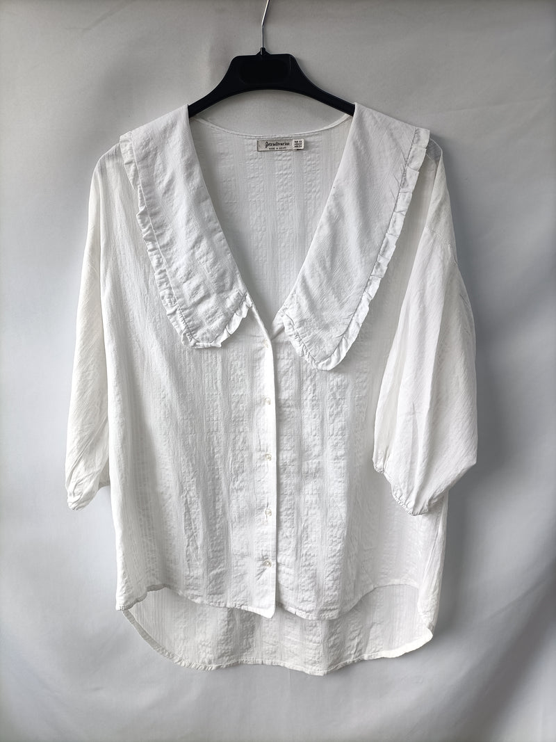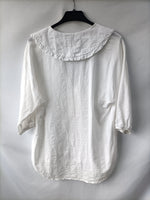 Blusa blanca fluida de tejido con textura y cuello bebé amplio. Mangas 3/4 con elástico. De sisa a sisa 52 cm Largo 72 cm