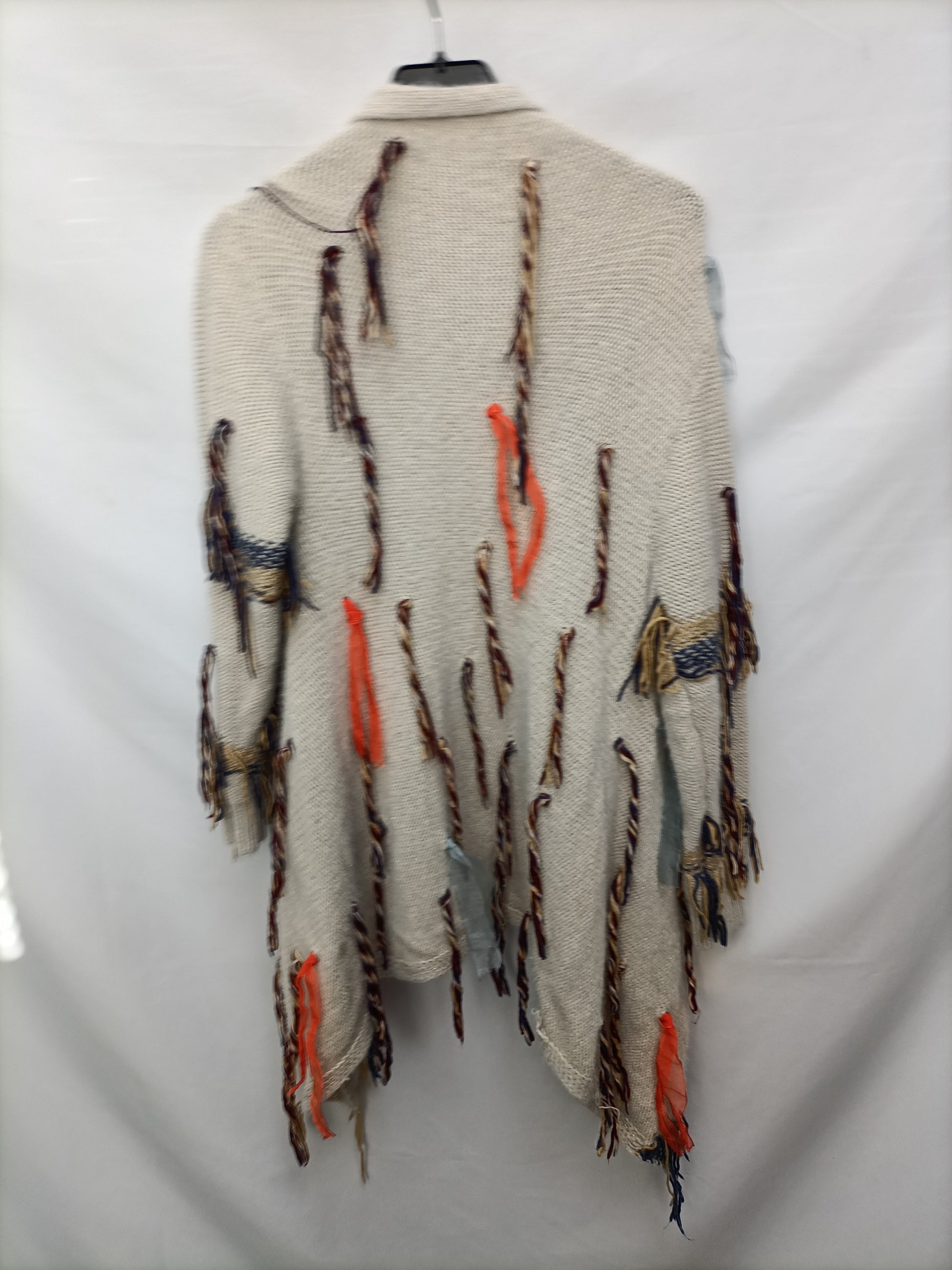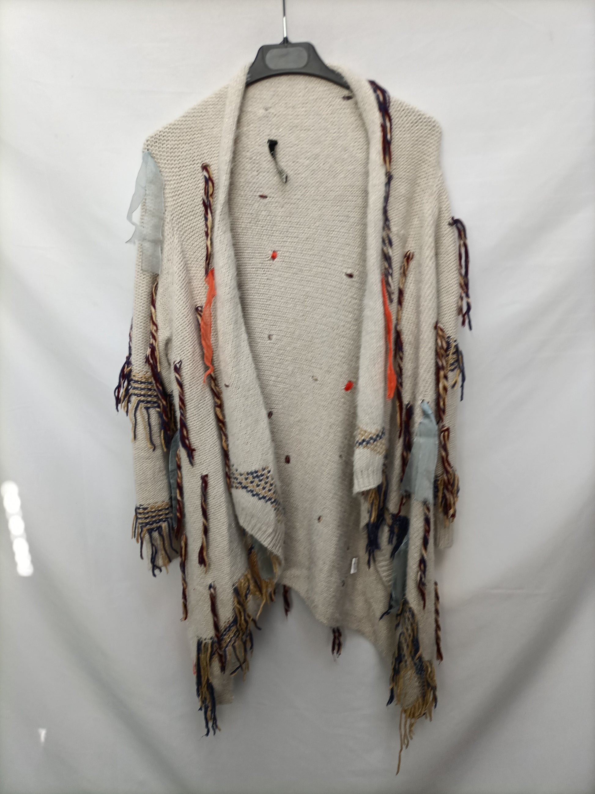 Cárdigan beige con detalle denlszado de diferentes tipo . Estilo oversized. No se abrocha. Elastico. Largo 76 cm