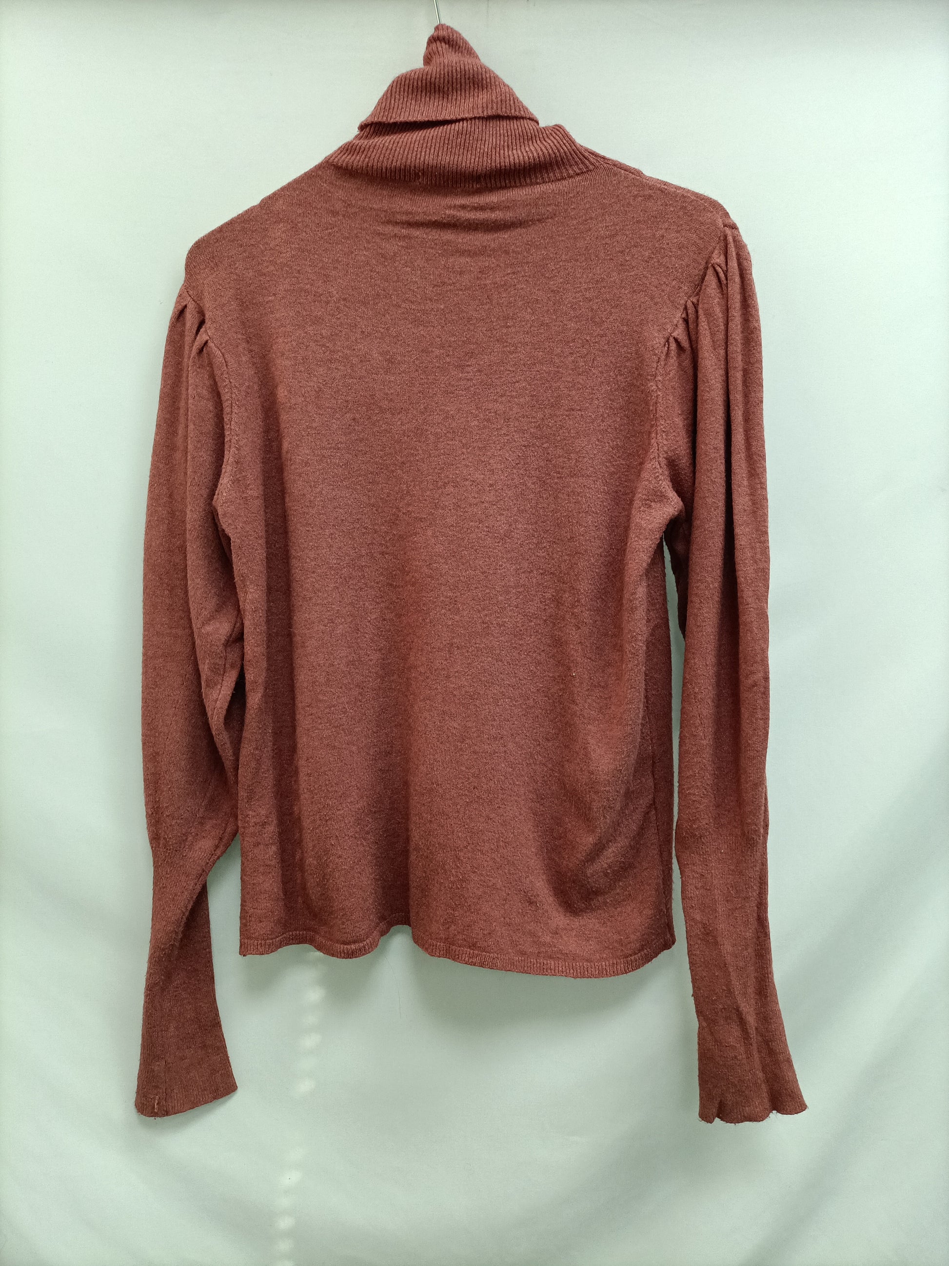 Jersey de cuello alto rosa oscuro casi teja con las mangas ligeramente Abullonadas. Largo 60 cm