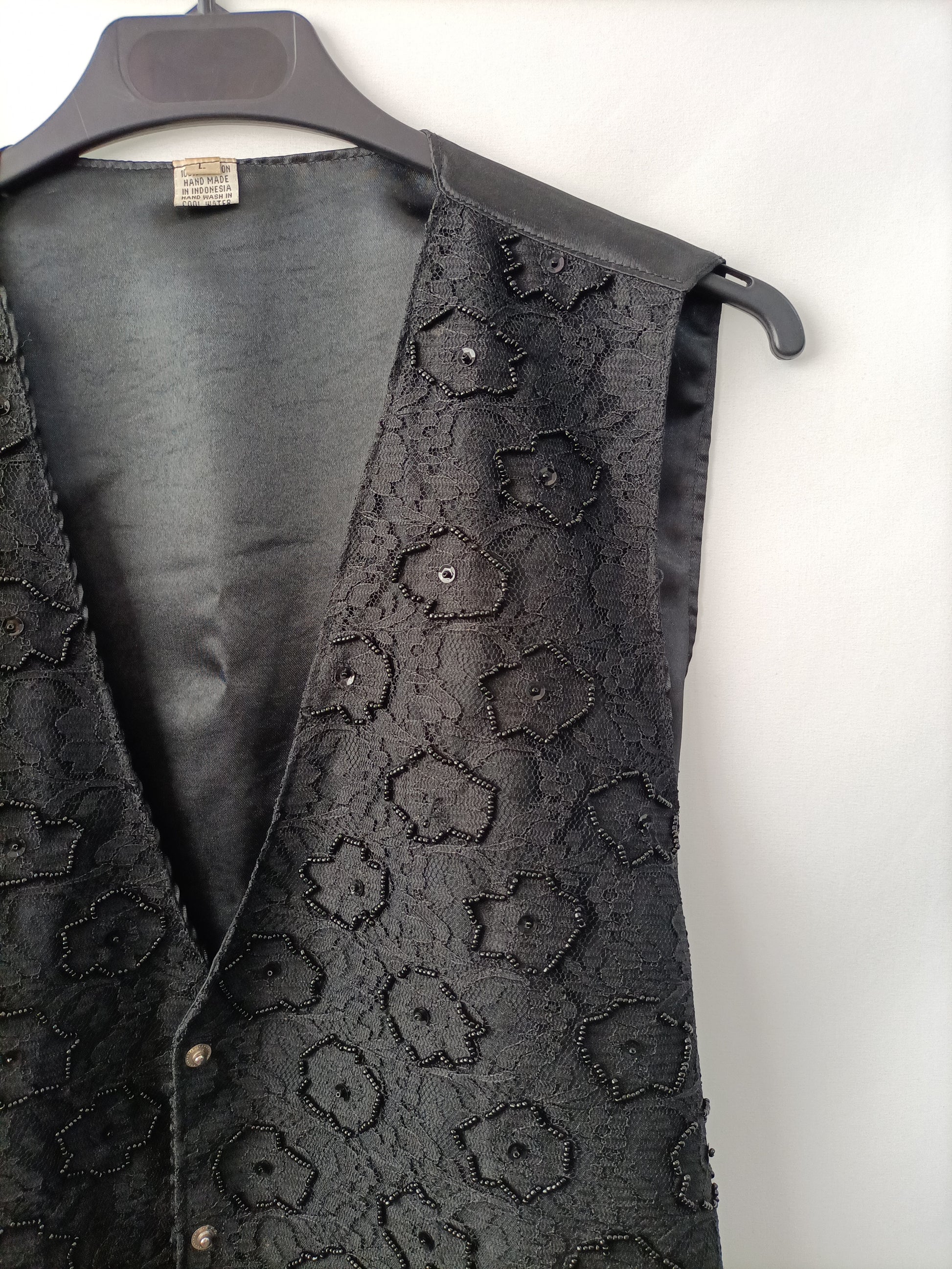 chaleco negro estilo vintage con pedrería. De sisa a sisa 52 cm largo 46 cm.