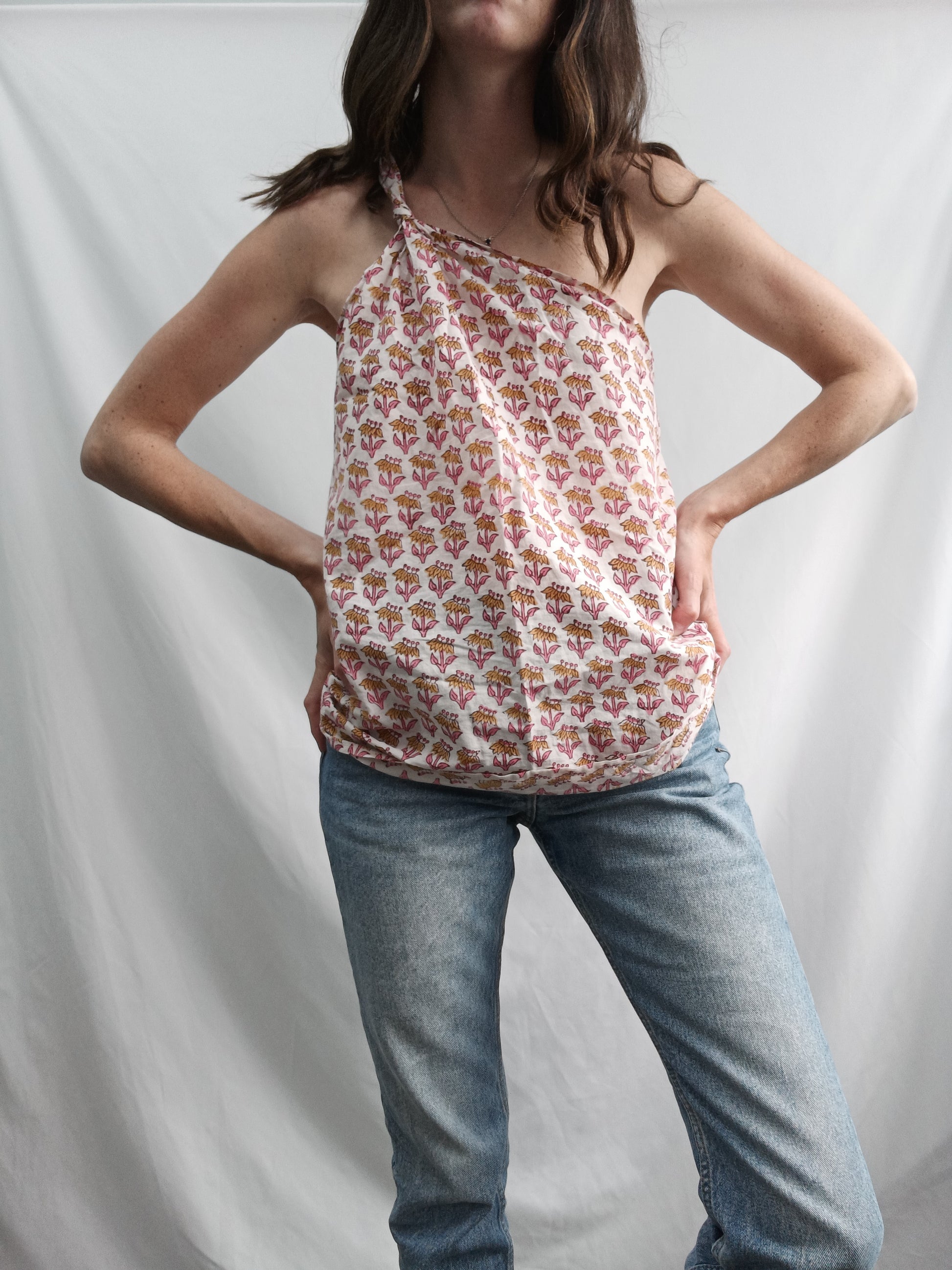 Blusa blanca con ofed en tono rosa de escote asimétrico. Largo 42 cm