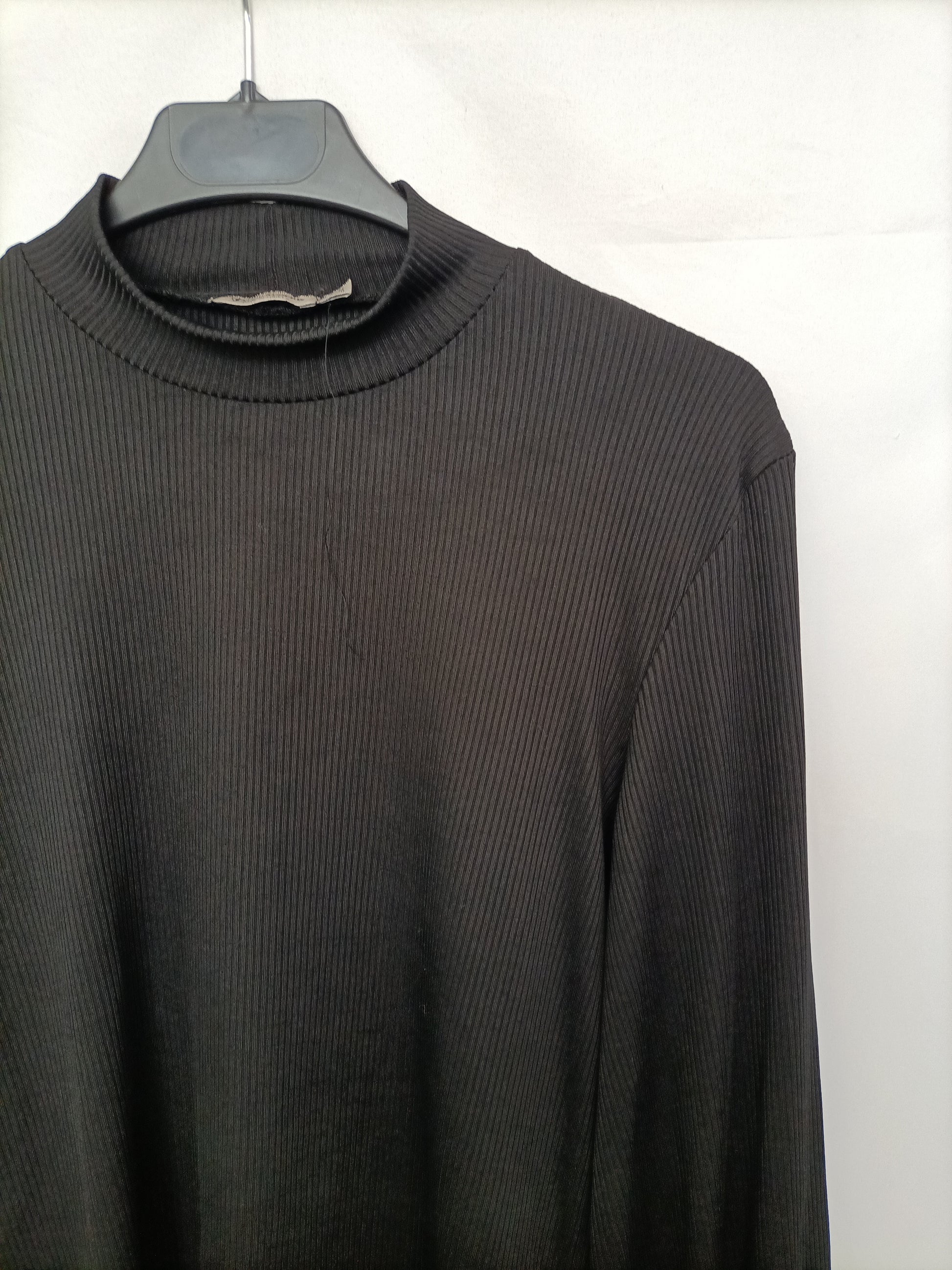 Top negro fluido de tejido de canalé elástico. Cuello perkins y mangas ligeramente abullonadas. Largo 60 cm