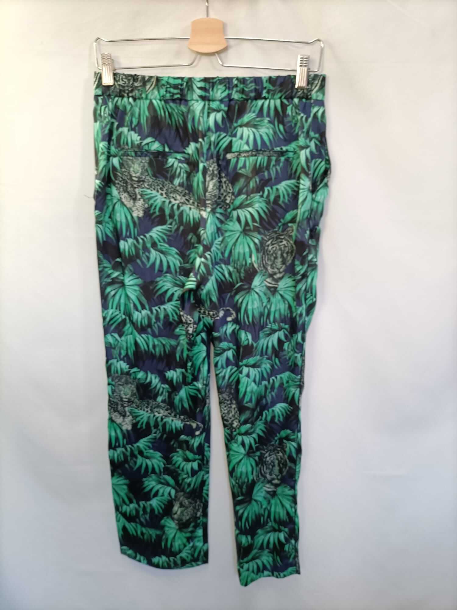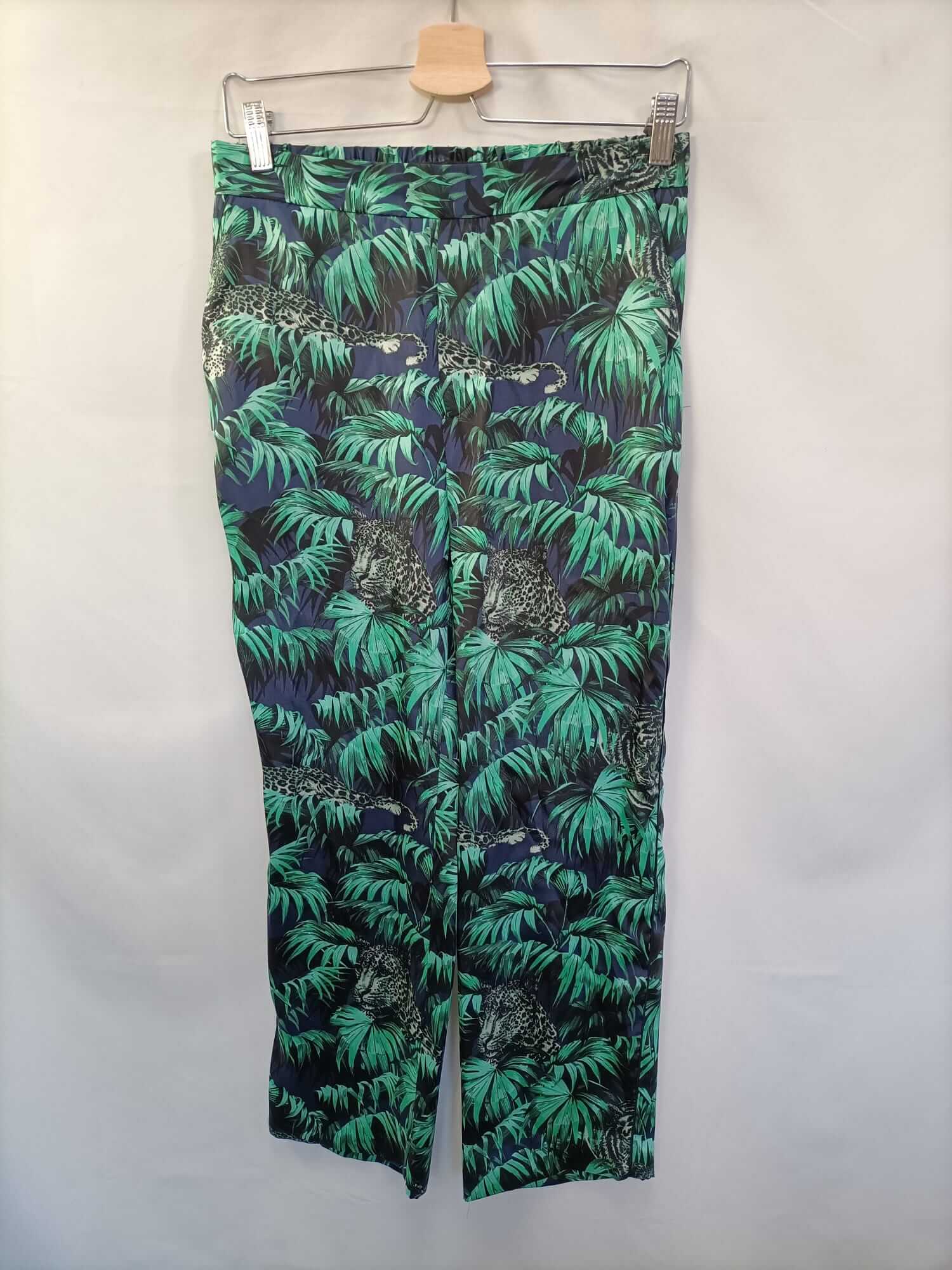 Zara. S. Pantalón fluido azul con estampado de selva en verde con tigres. Finito. Cintura elástica. Largo 95 cm