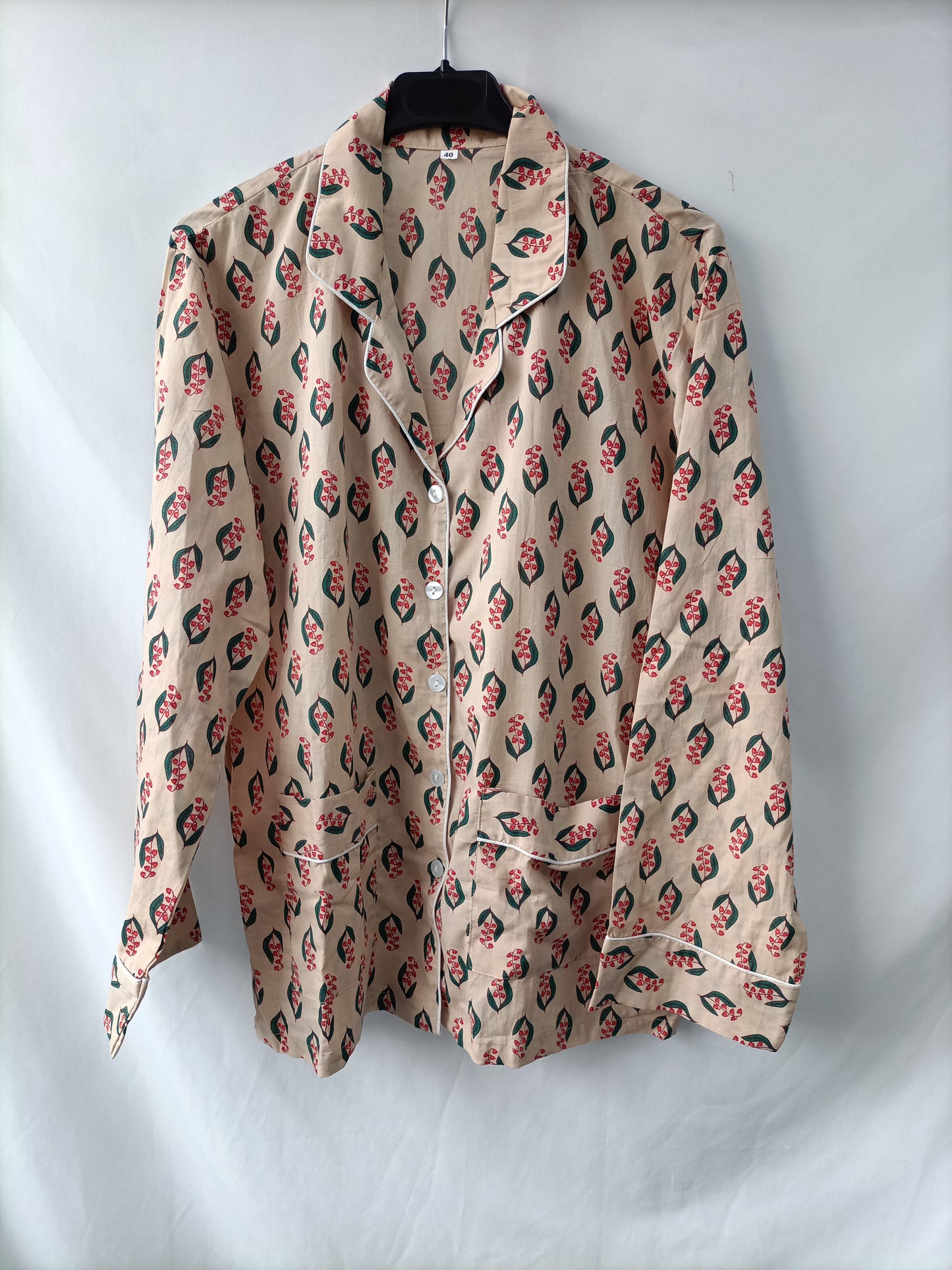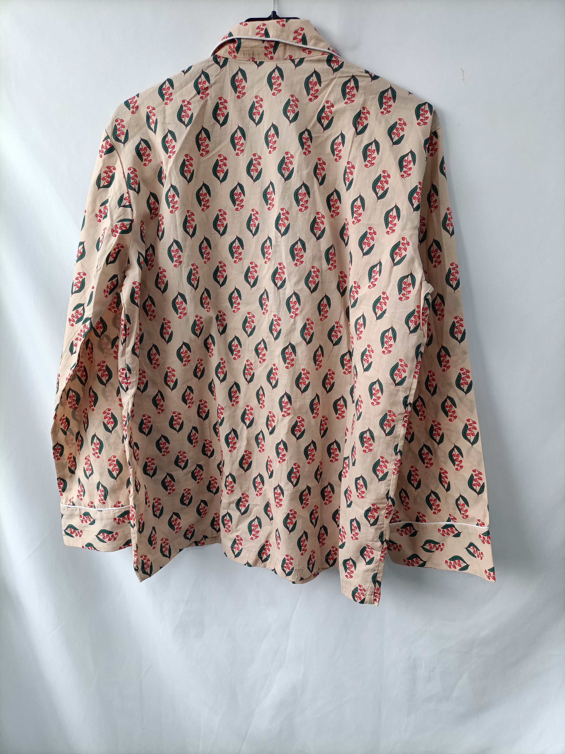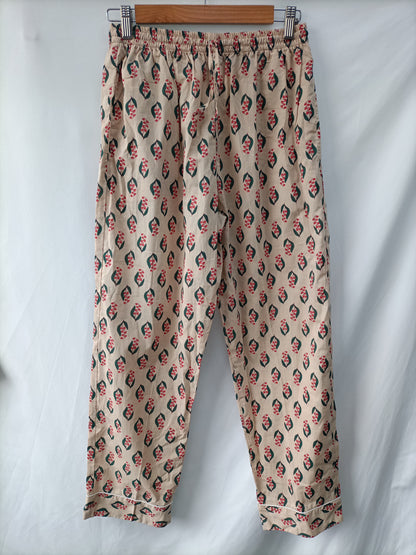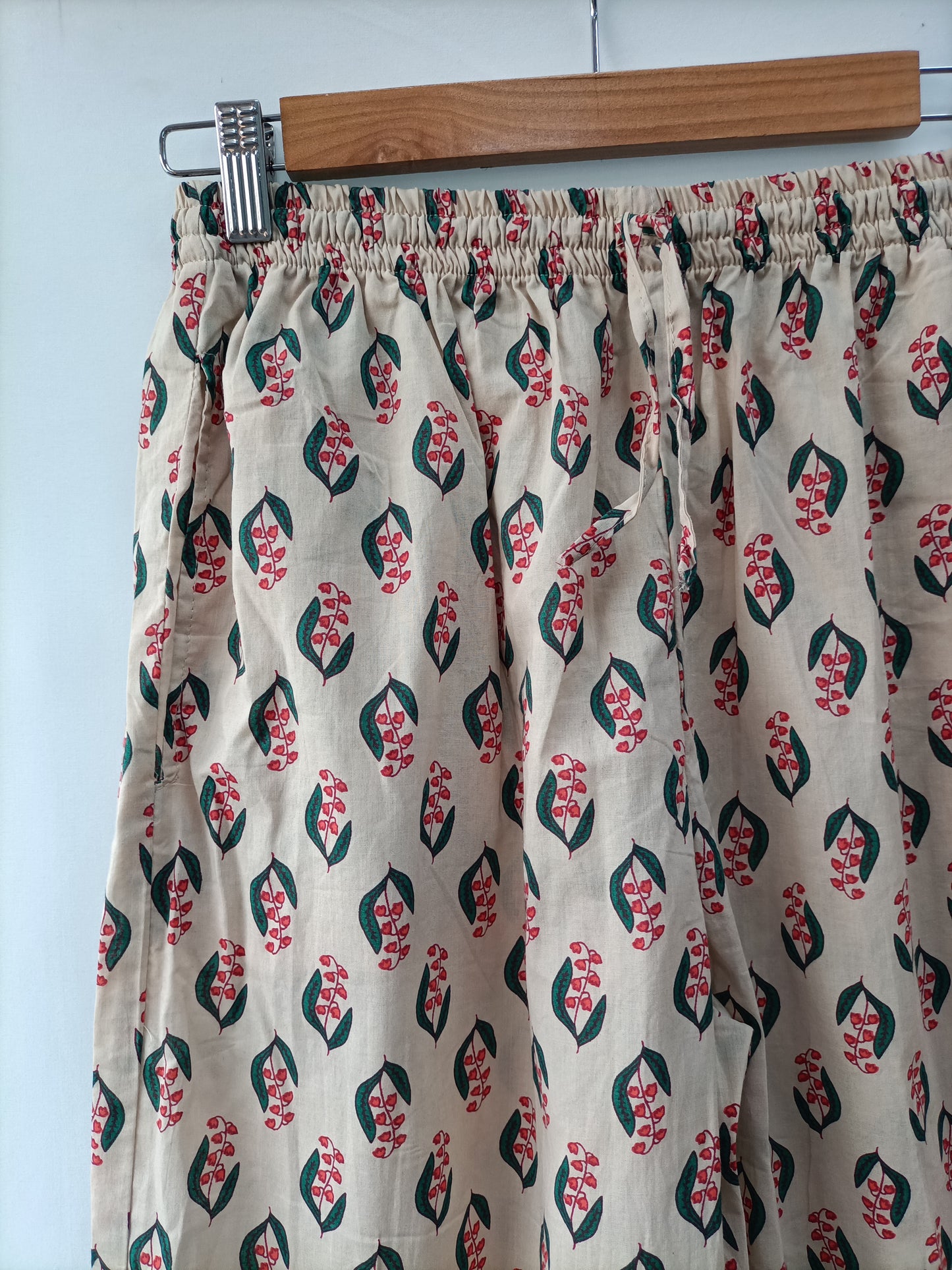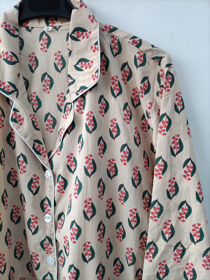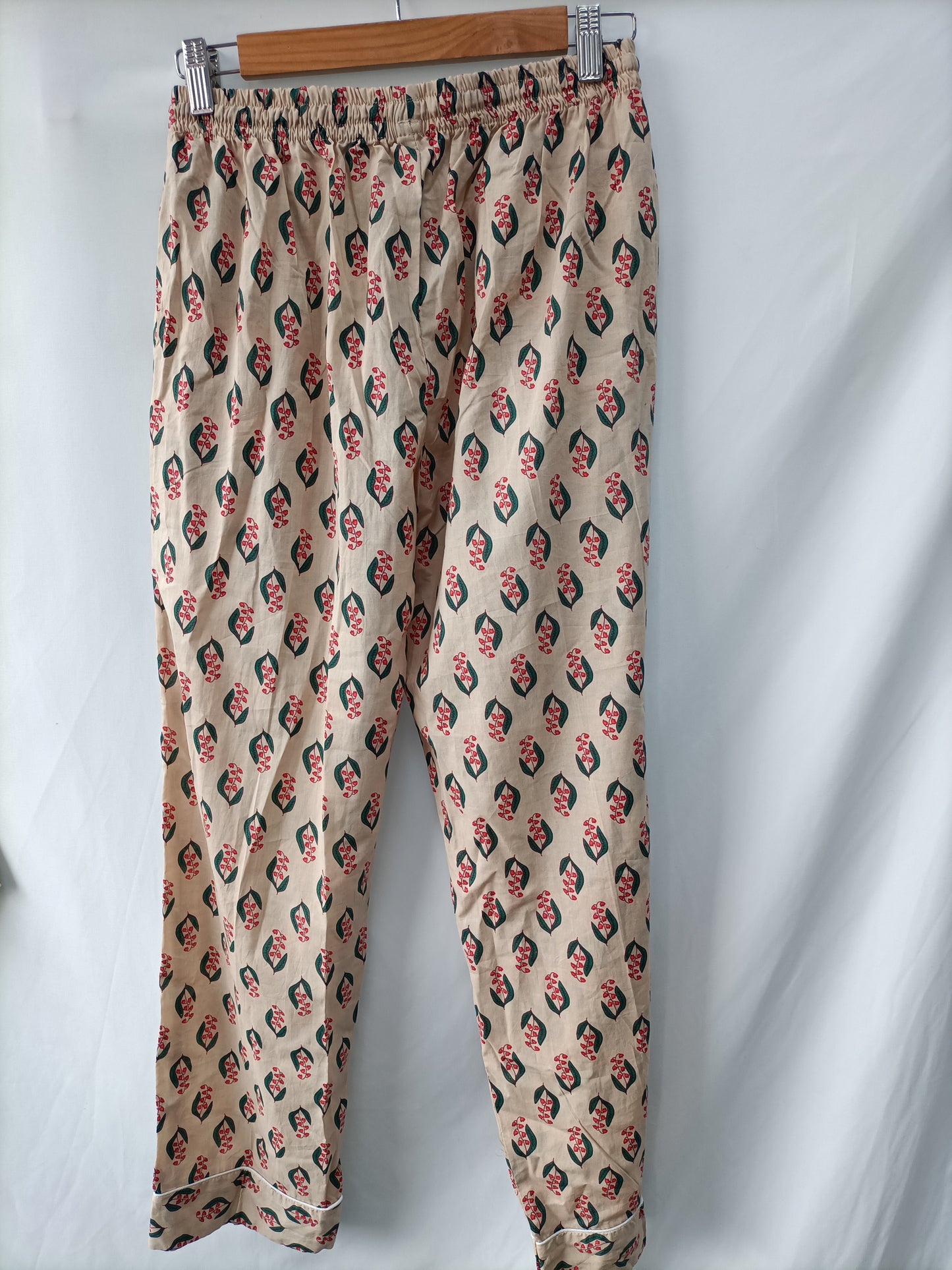 Total look beige con flores en tono rojo estilo pijamero. Parte de arriba fluida no elástica. Pantalón ancho con cintura elástica.