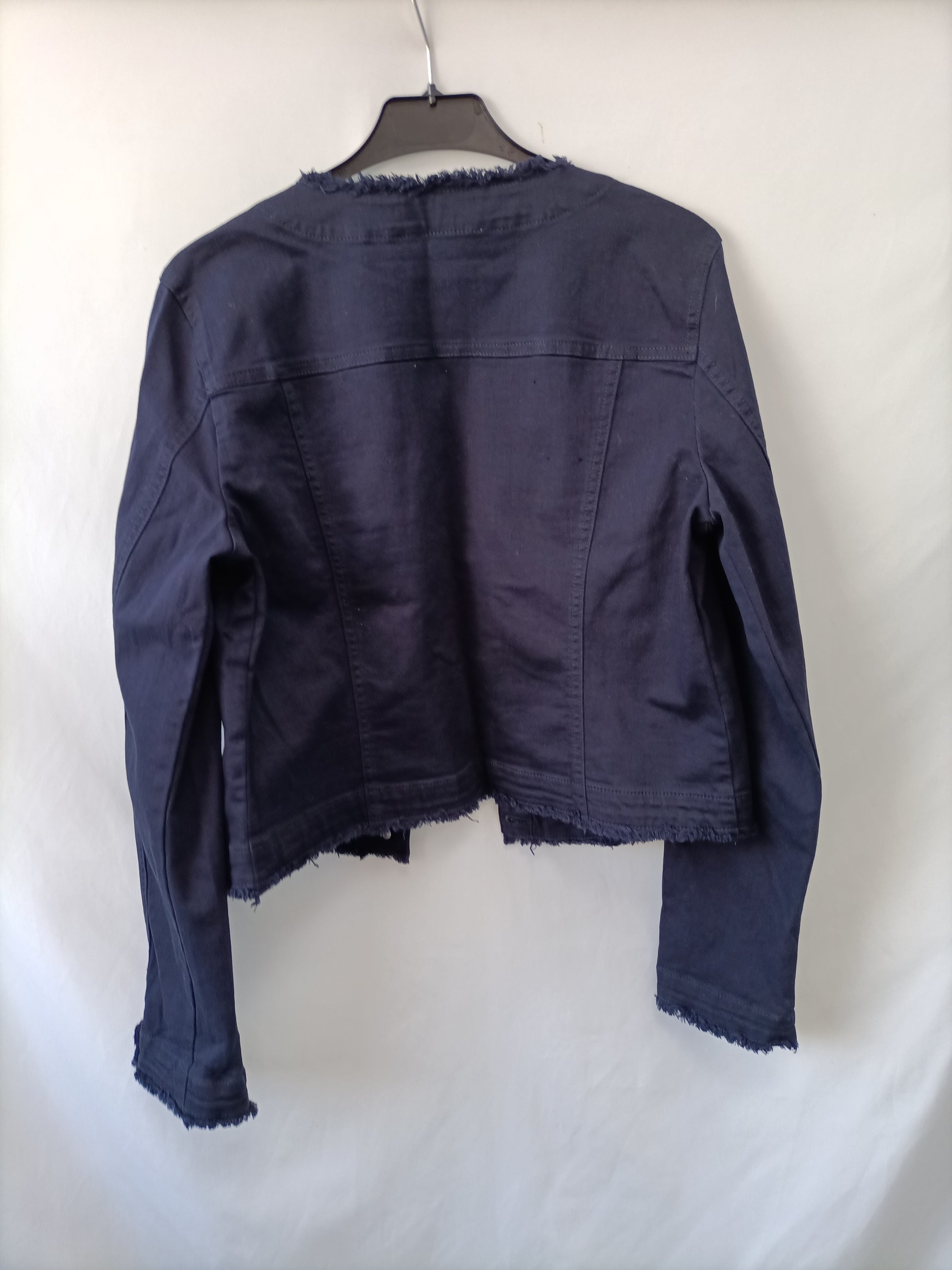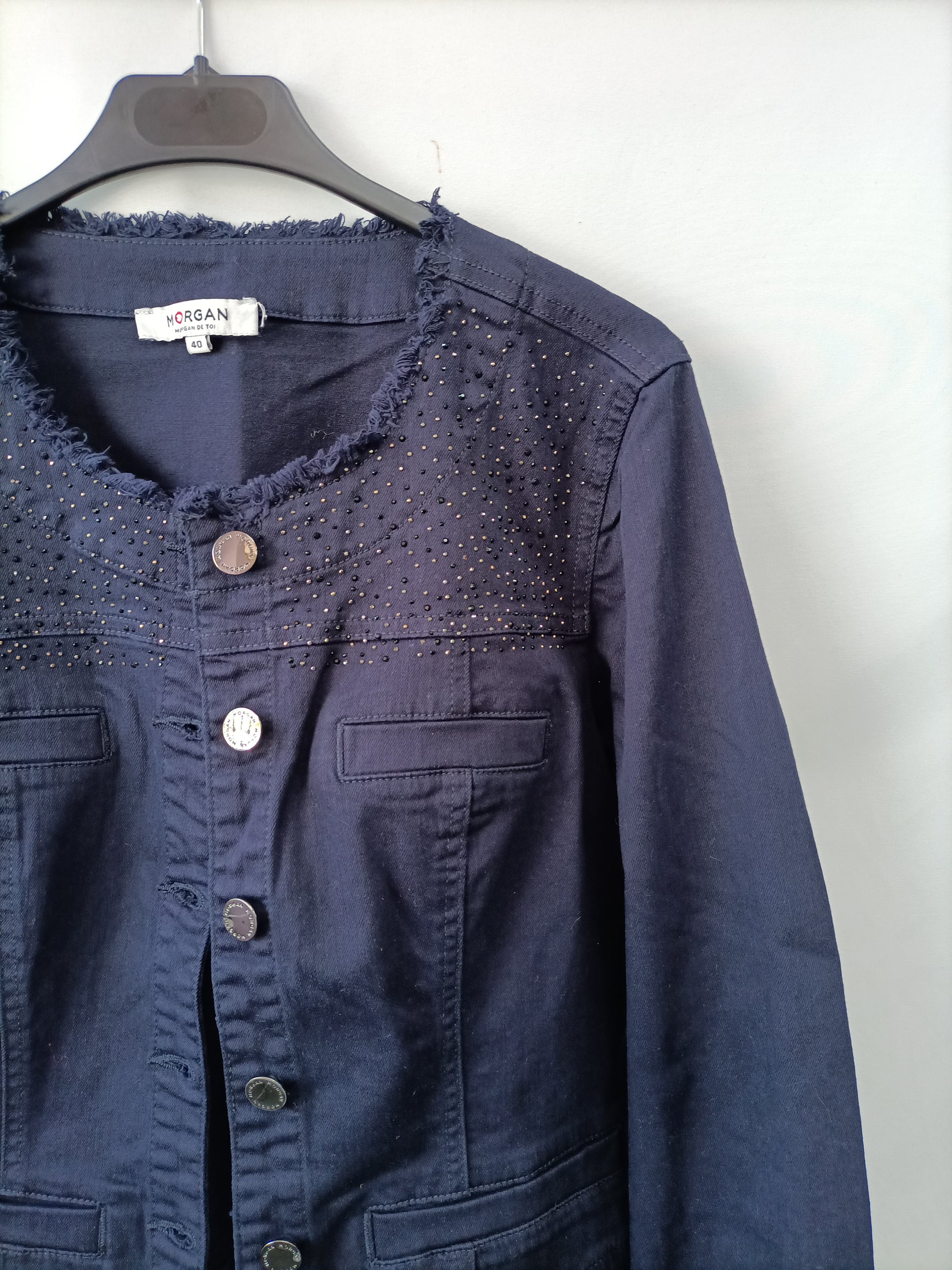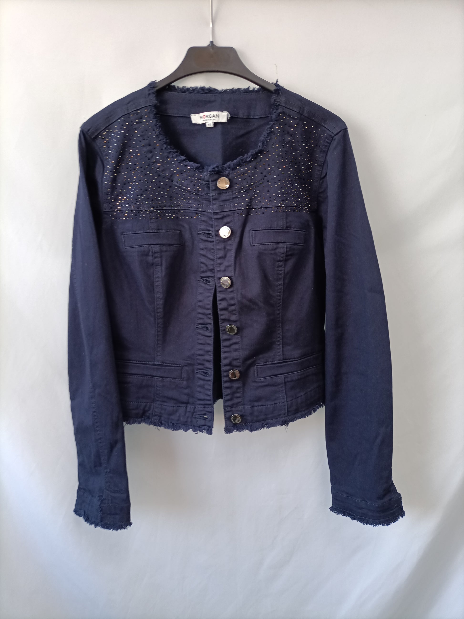 Cazadora denim azul con detalles de pedrería. De sisa a sisa 46 cm largo 49 cm