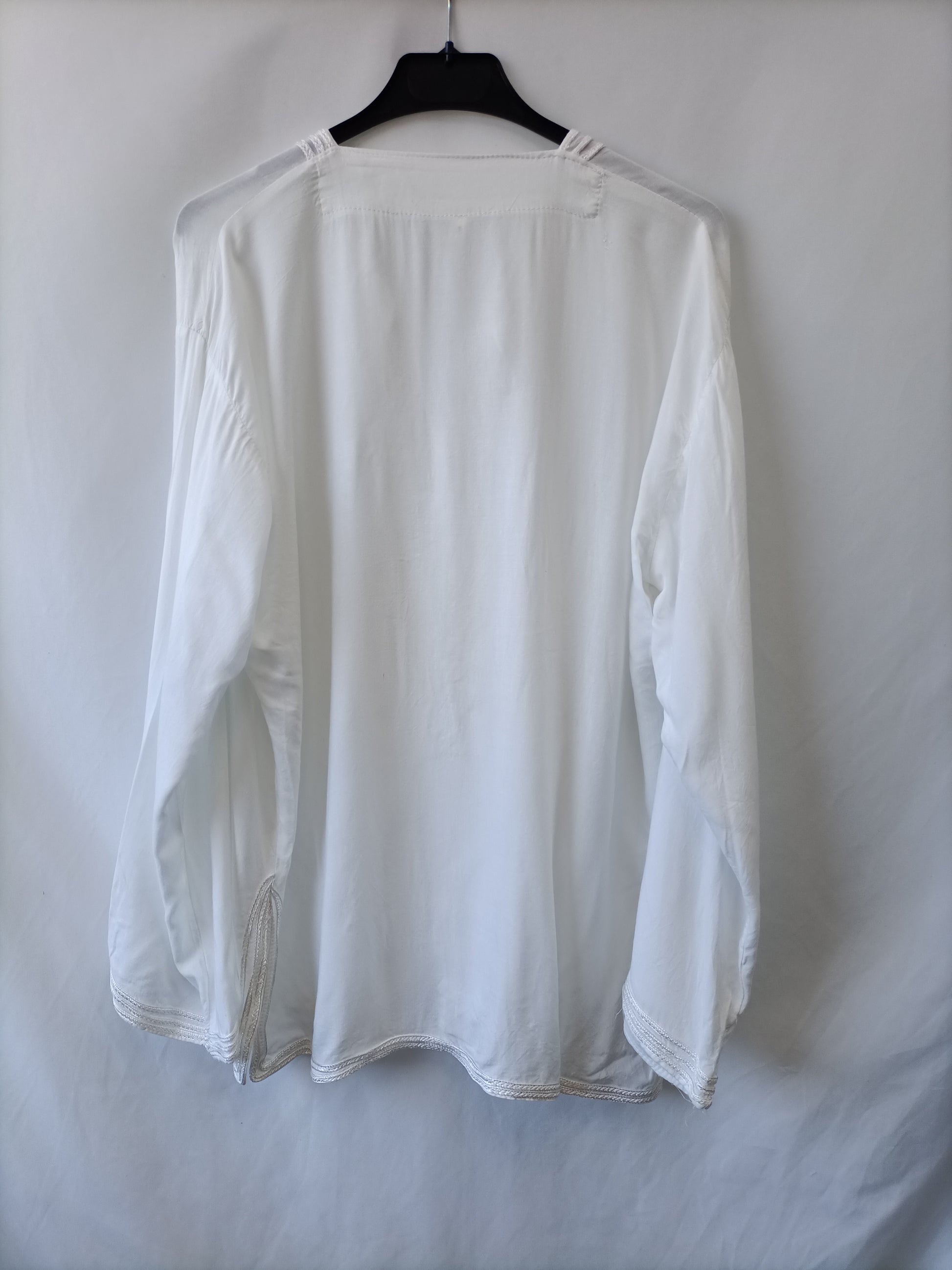 Blusa fluida blanco con botones de adorno de colores. No elástica. De sisa a sisa 6 cm largo 72 cm