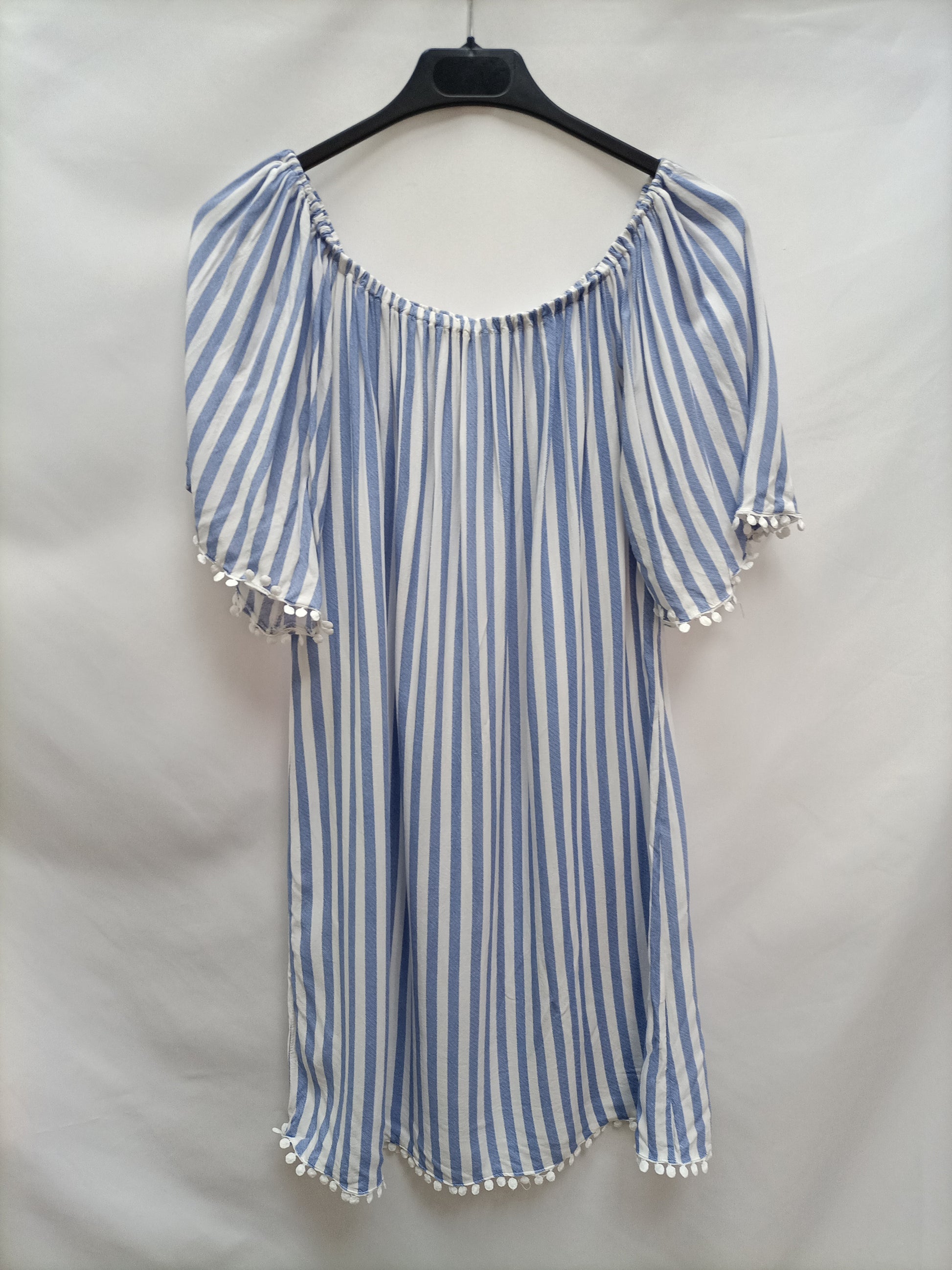 Vestí corto de rayas azul y blanco con el escote elástico estilo barco. No elástico. De sisa a sisa 50 cm largo 73 cm