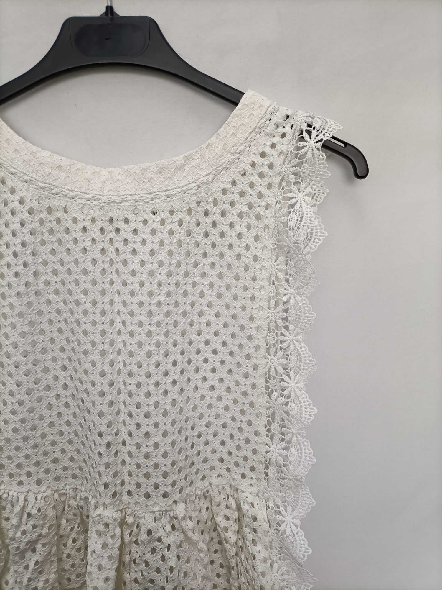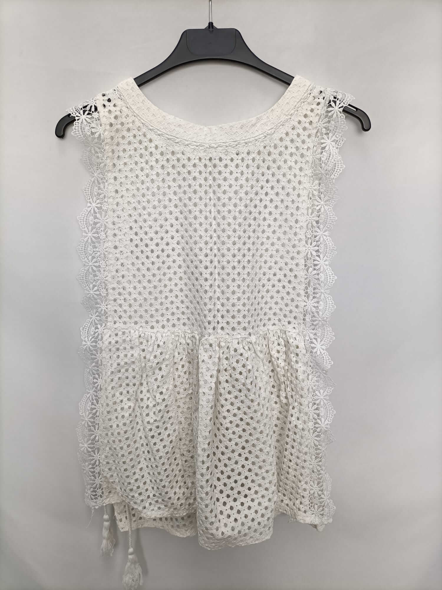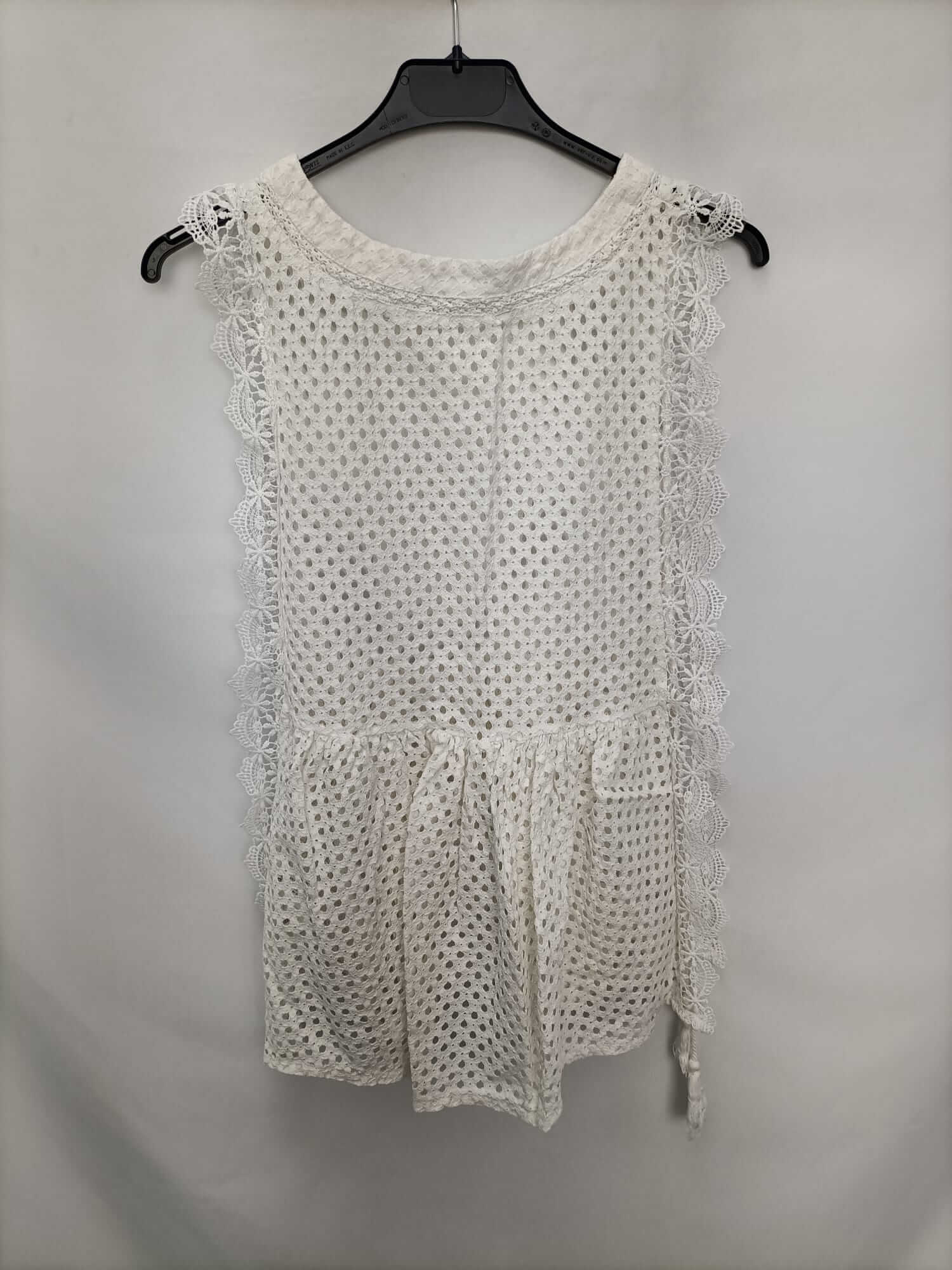 Felties. m. Top de punto troquelado blanco roto con detalle de encaje. Abierto por el lateral se cierra con lazada. Largo 60 cm