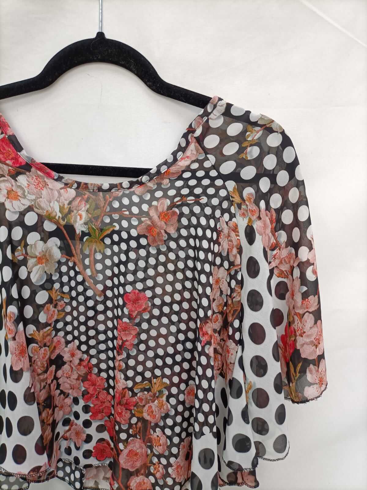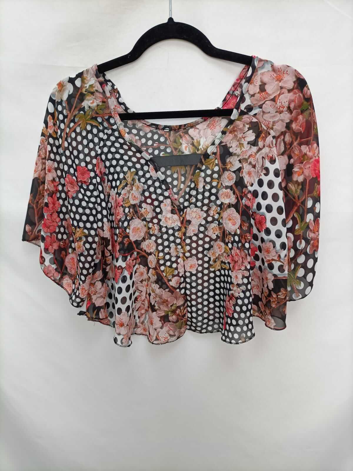 Otras. Tu (s/m). Top estilo capa de lunares y flores fluido con la espalda baja. Semitransparente. Largo 49 cm