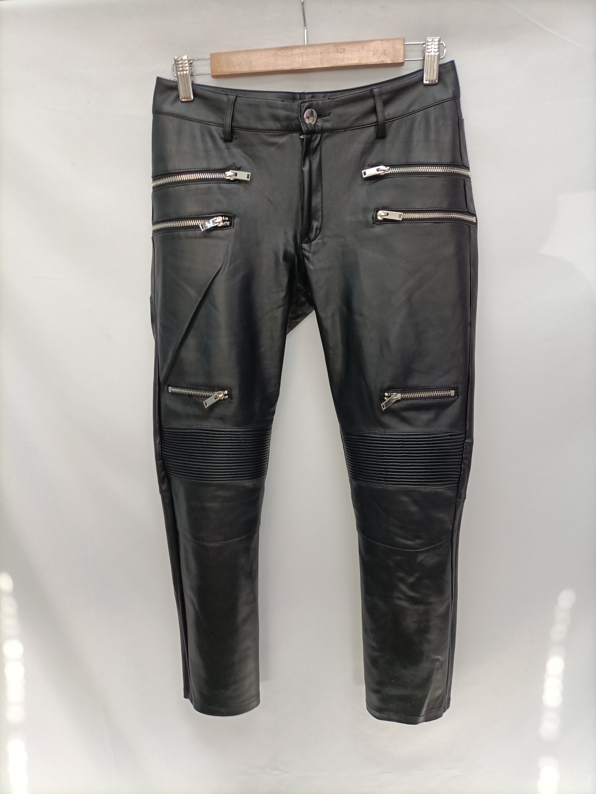 Pantalón negro de tejido efecto piel con detalle de cremallera y "rodilleras" plisadas. Cintura 38 cm Largo 88 cm