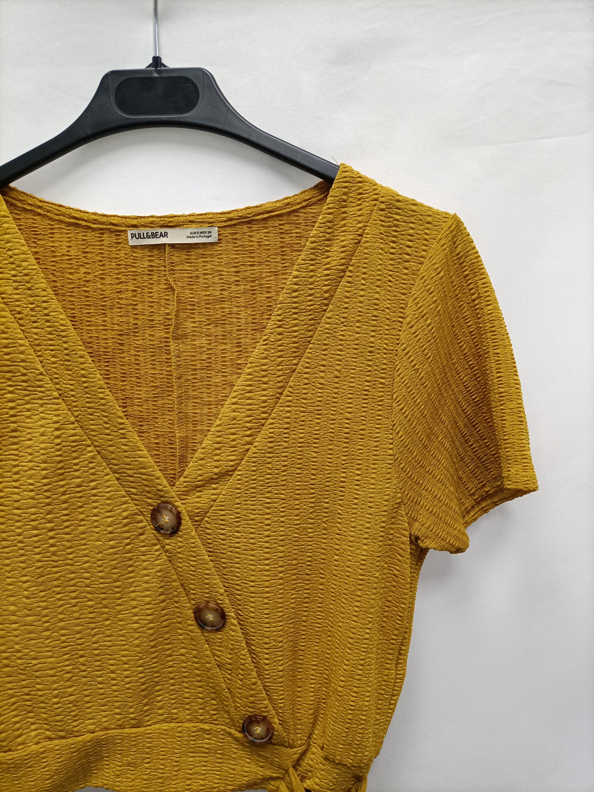Top mostaza cruzado con detalle de botones y lazada lateral. Elástico. Largo 42 cm