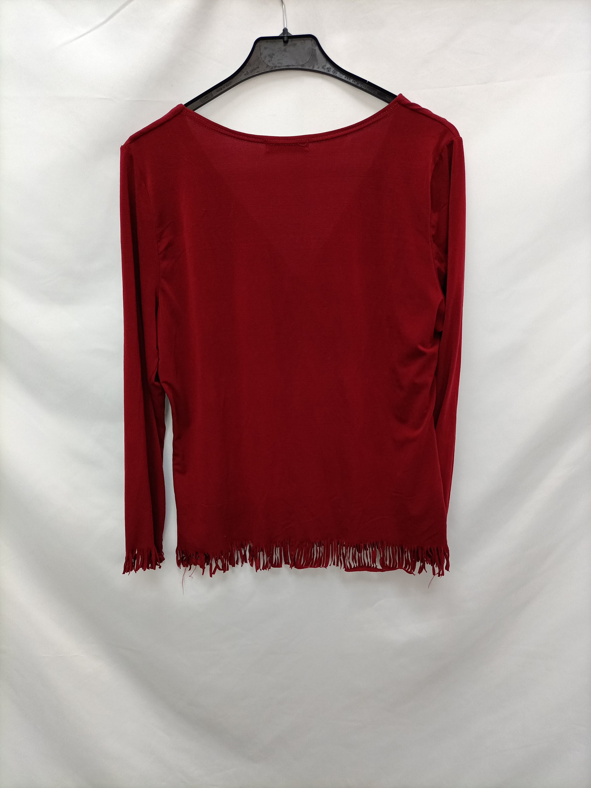 Camiseta burdeos con detalles de flecos. Fluido y elastico. Largo 56 cm