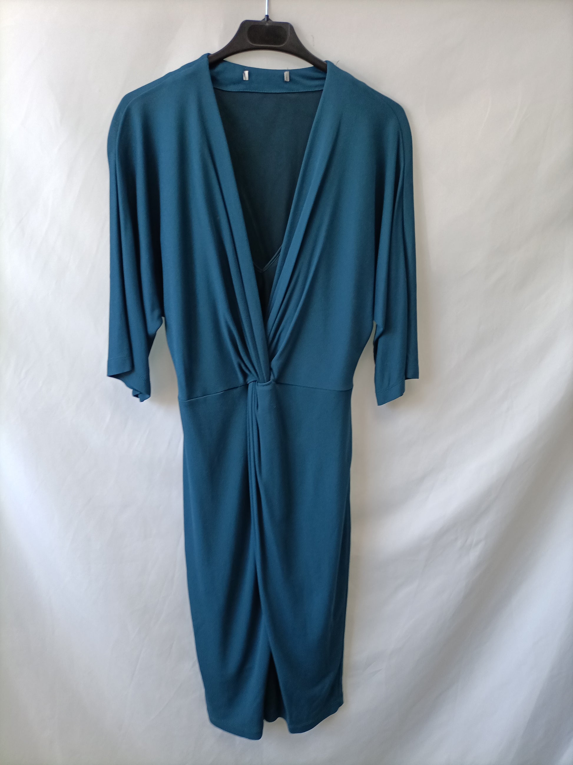Vestido mido azul verdoso con detalle de nudo en la parte delantera. Elastico. largo 108 cm