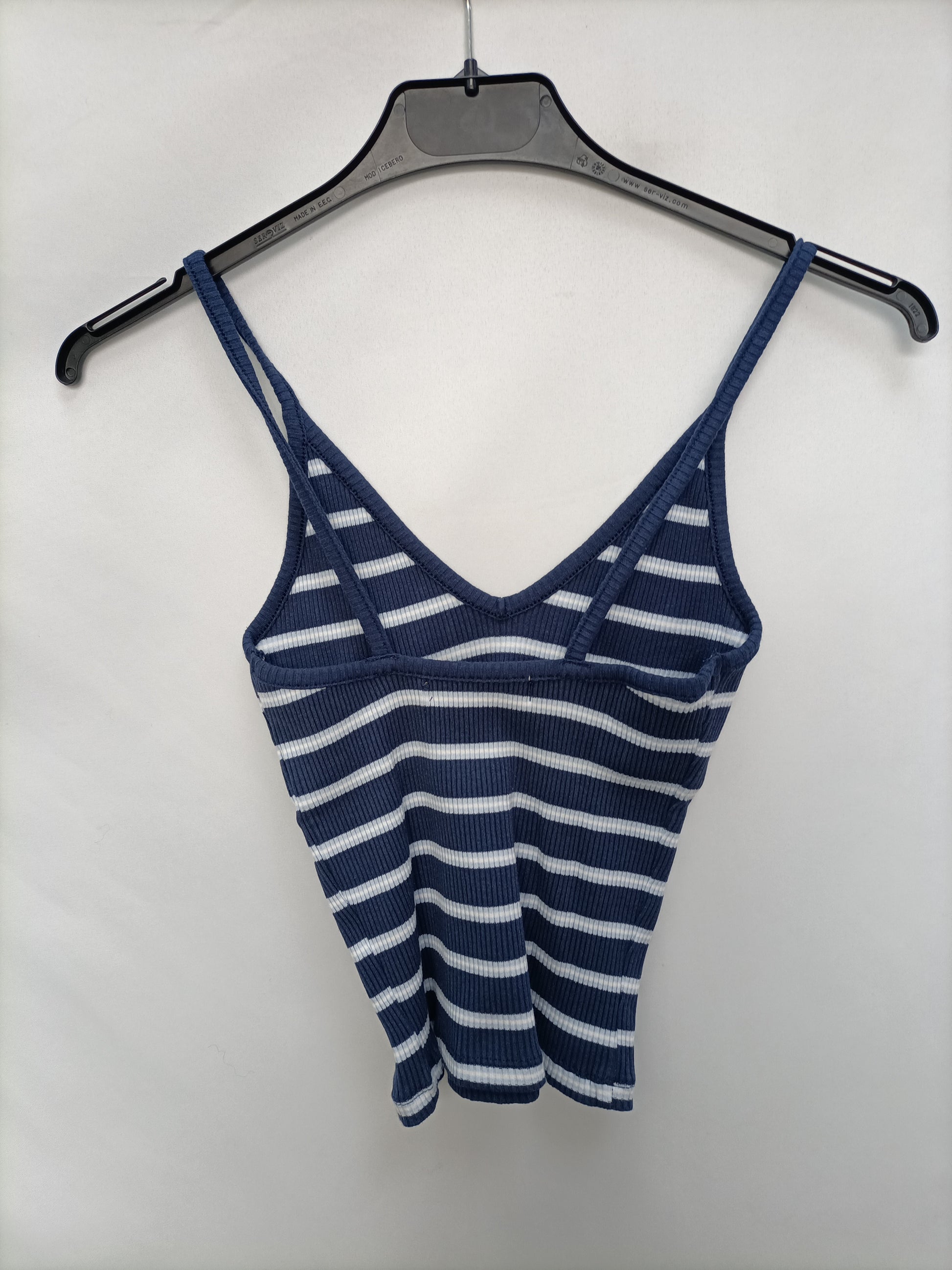 Croptop azul de rayas de tejido de canalé elástico. Ajustado. Largo 42 cm