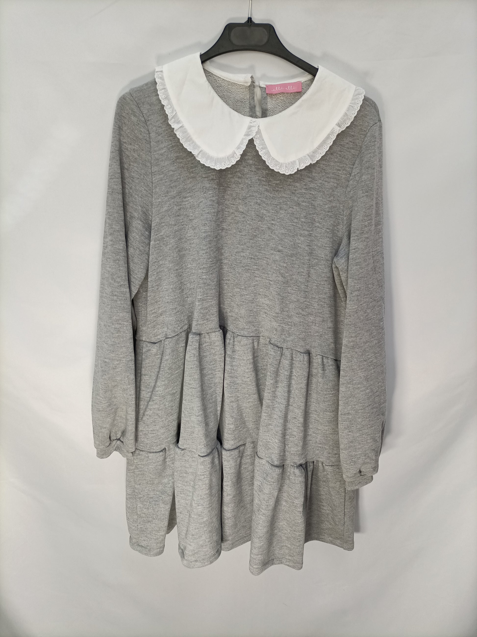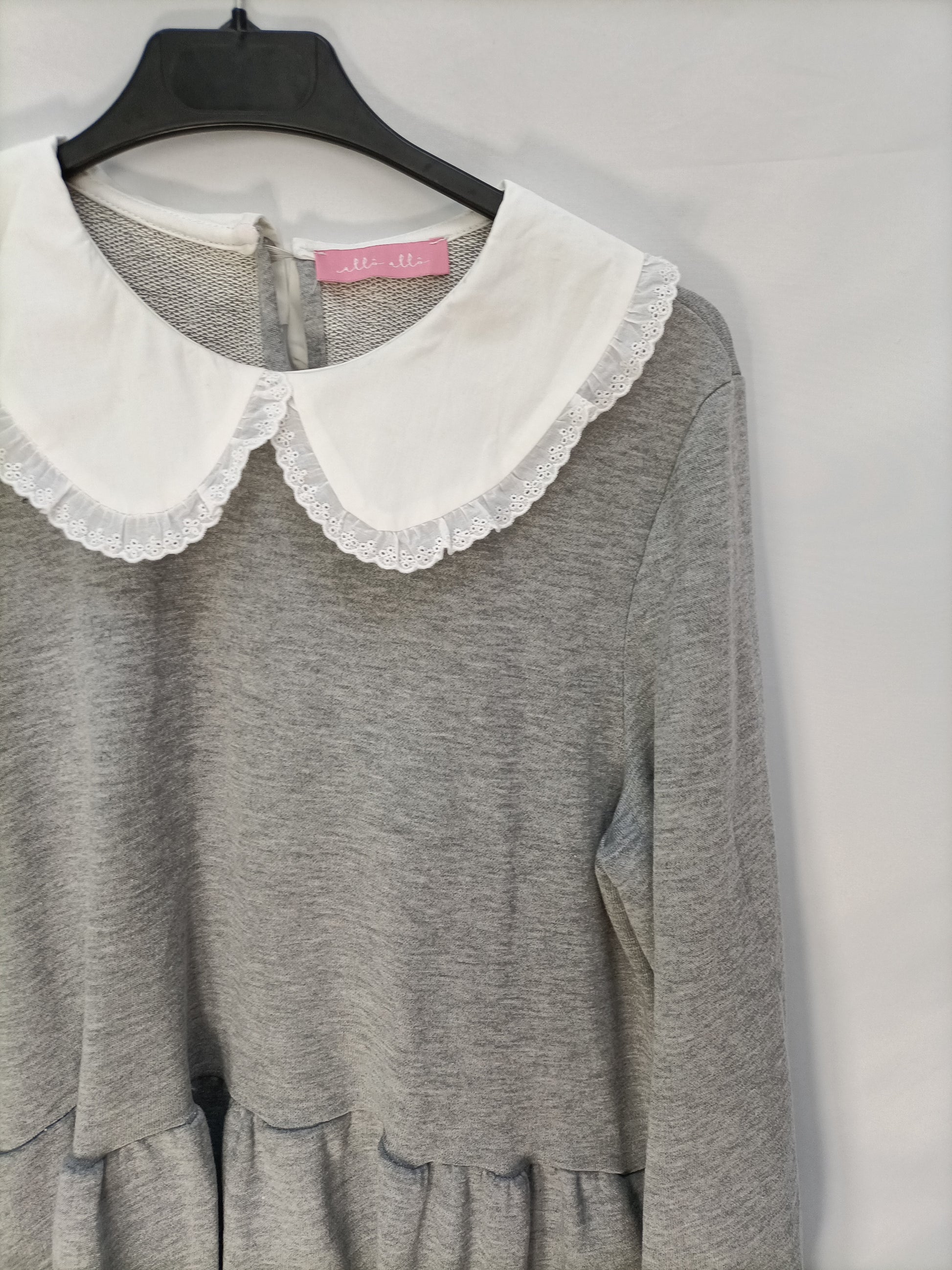 Vestido corto gris con cuello nde bebé blanco. Elastico. De sisa a sisa 48 cm largo 85 cm
