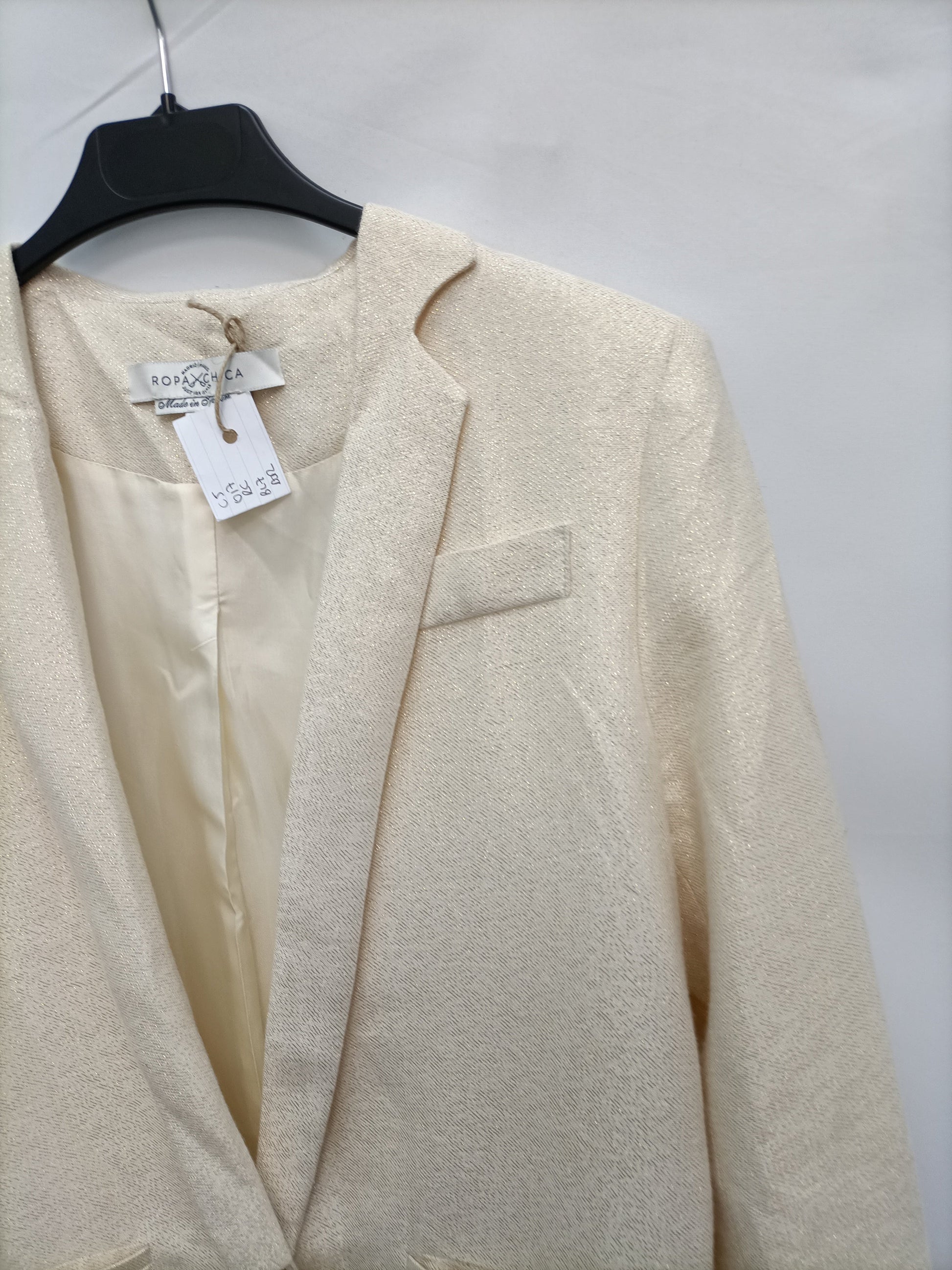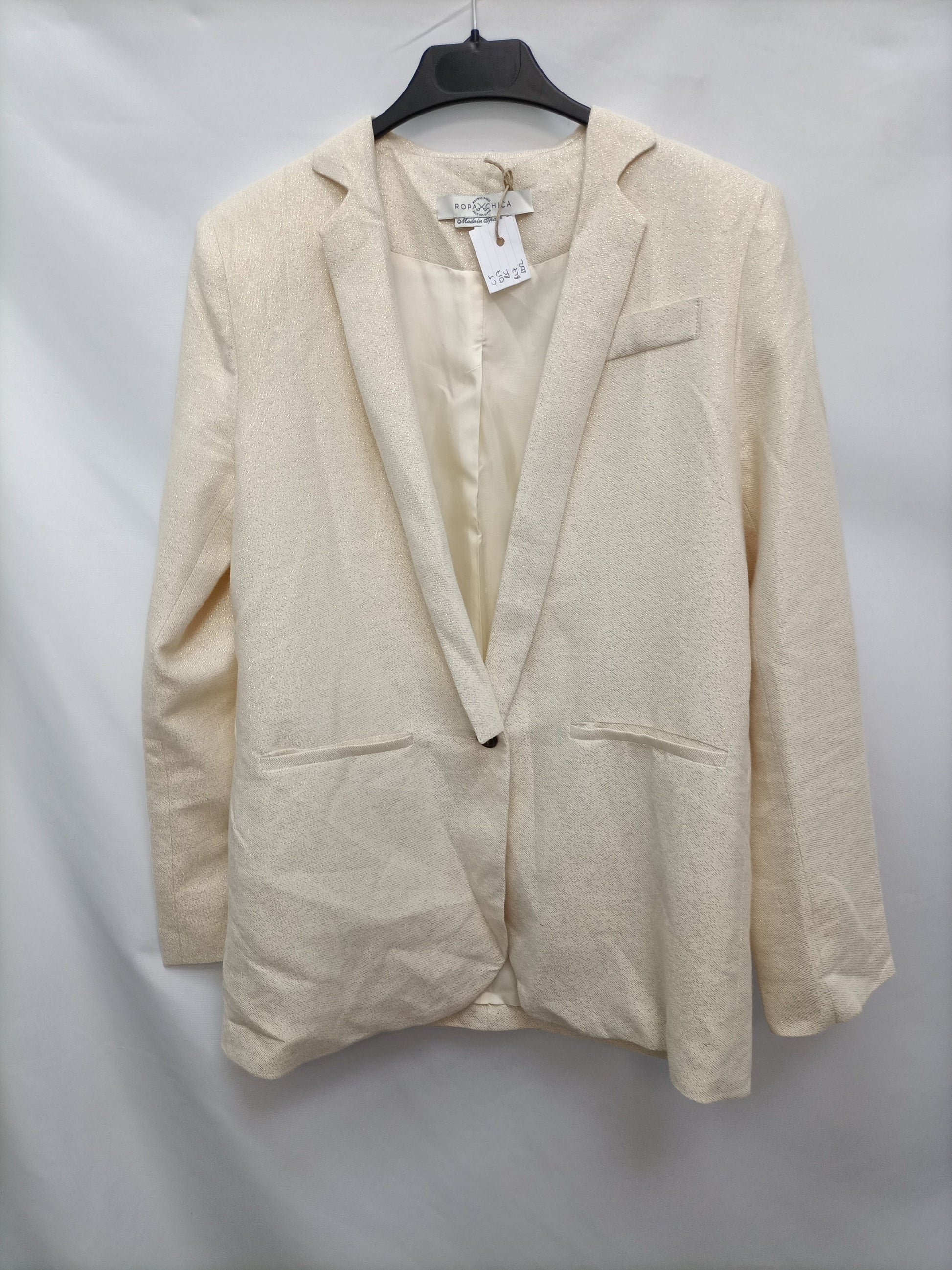Blazer beige con reflejos dorados de vestir. Fluida se abrocha con un botón. No elastica. De sisa a sisa 46 cm largo 72 cm.