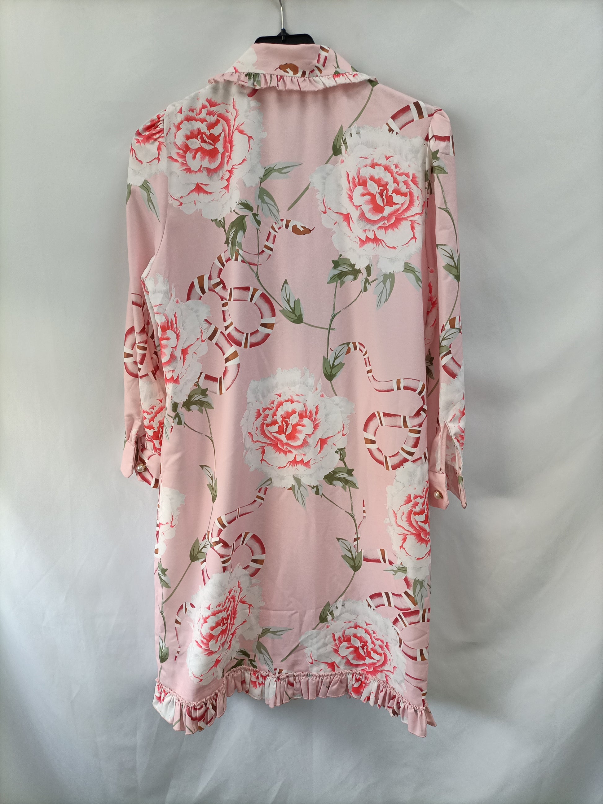 Vestido corto rosa con flores y botones estilo perla. Cuello de bebé. No elástico. De sisa a sisa 48 cm largo 93 cm