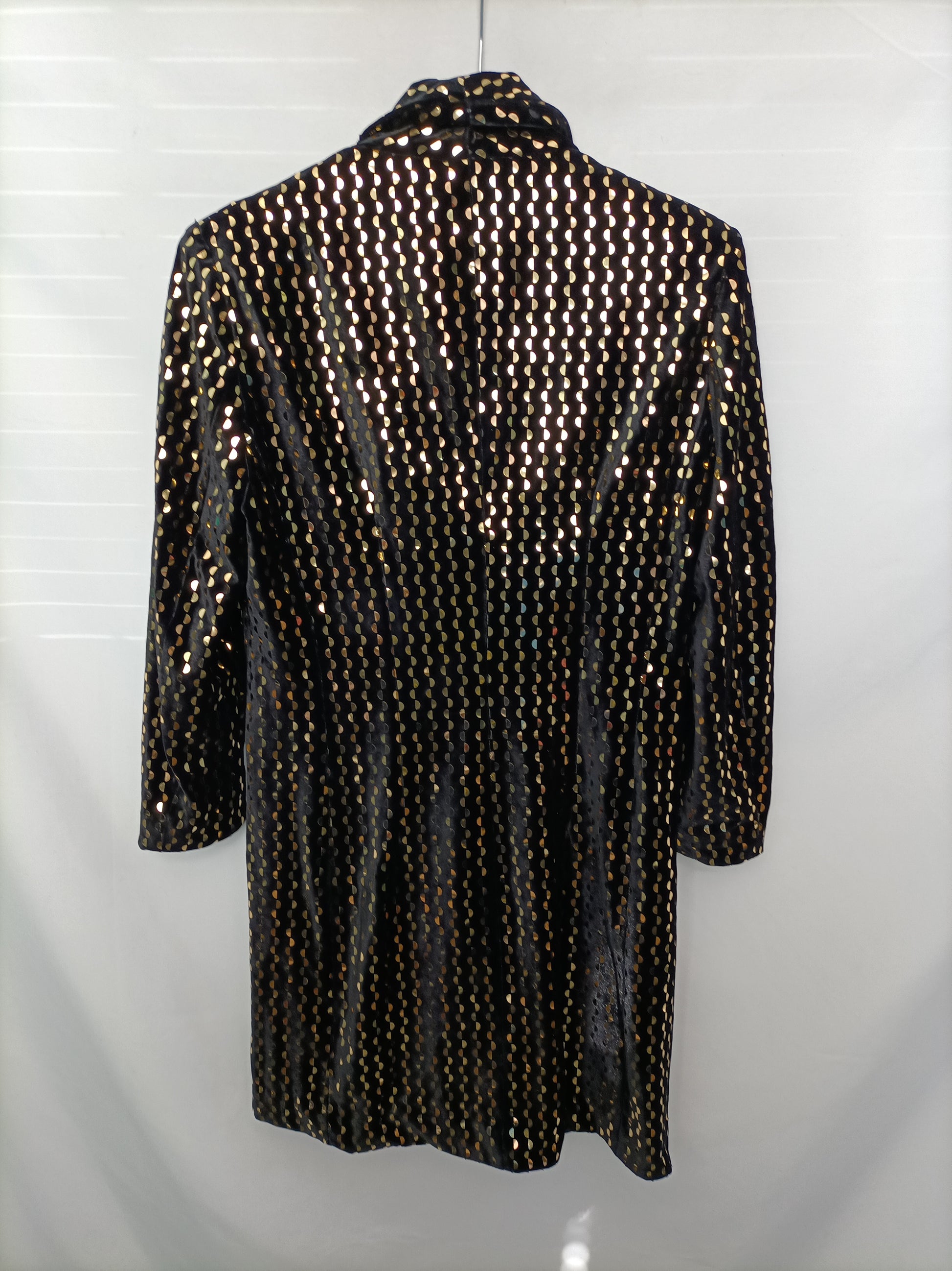 Abrigo estilo blazer negro con detalles dorados. Cruzado y fluido. Semielastico. De sisa a sisa 45 m largo 92 cm