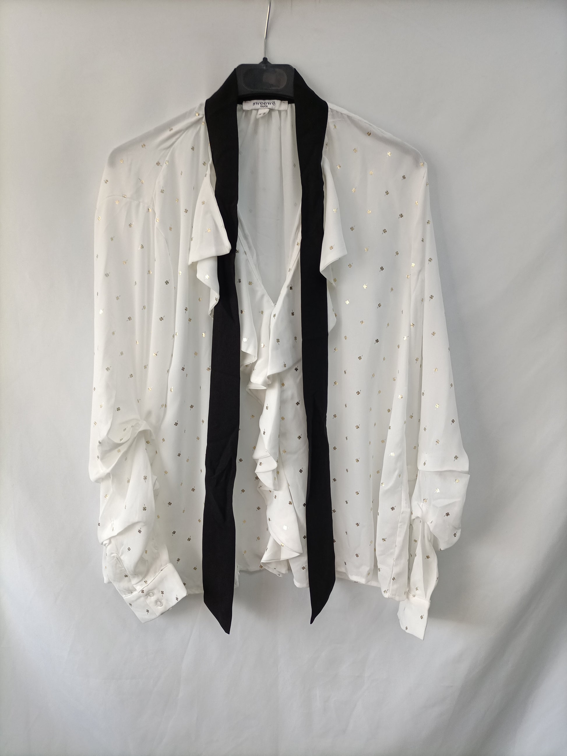 Blusa blanca con tréboles dorados. Volante y Lazada. No elastica. De sisa a sisa 57 Largo 66 cm
