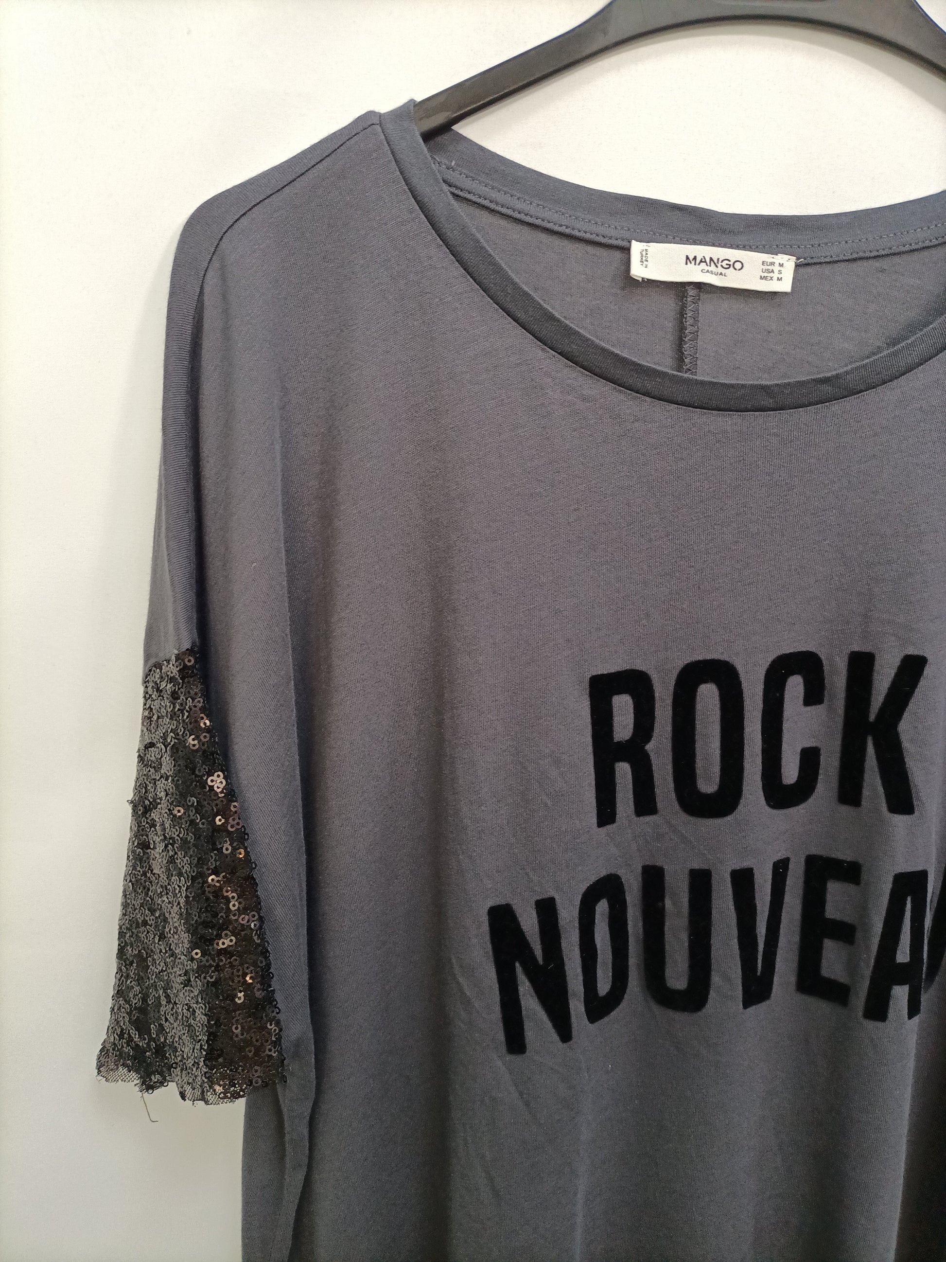 Camiseta letras con detalle de lentejuelas en las mangas. Elastica. Oversized. largo 62 cm
