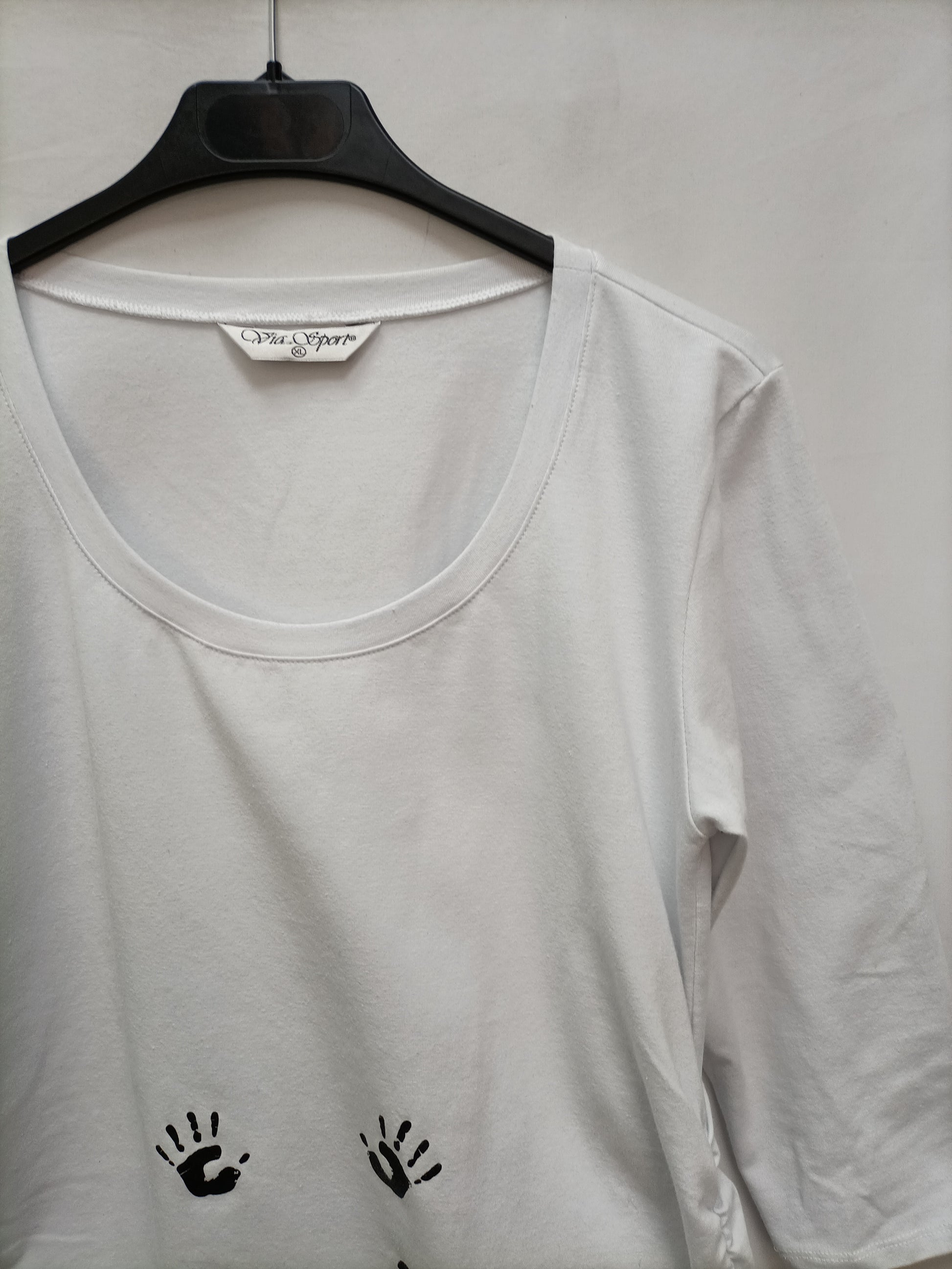 Camiseta blanca fruncida por lo laterales. Elástico. largo 69 cm.