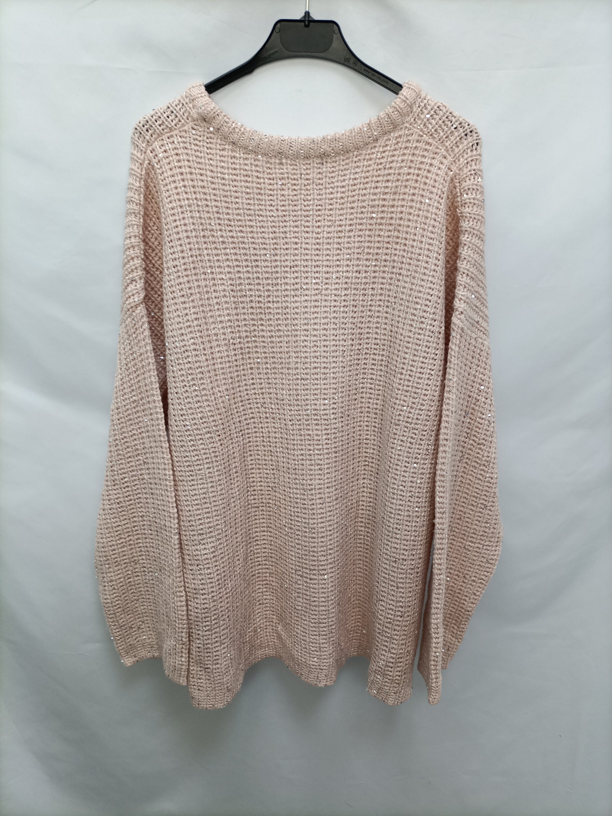 Jersey rosa estilo oversized con detalle de letejuelas plateadas. largo 70 cm