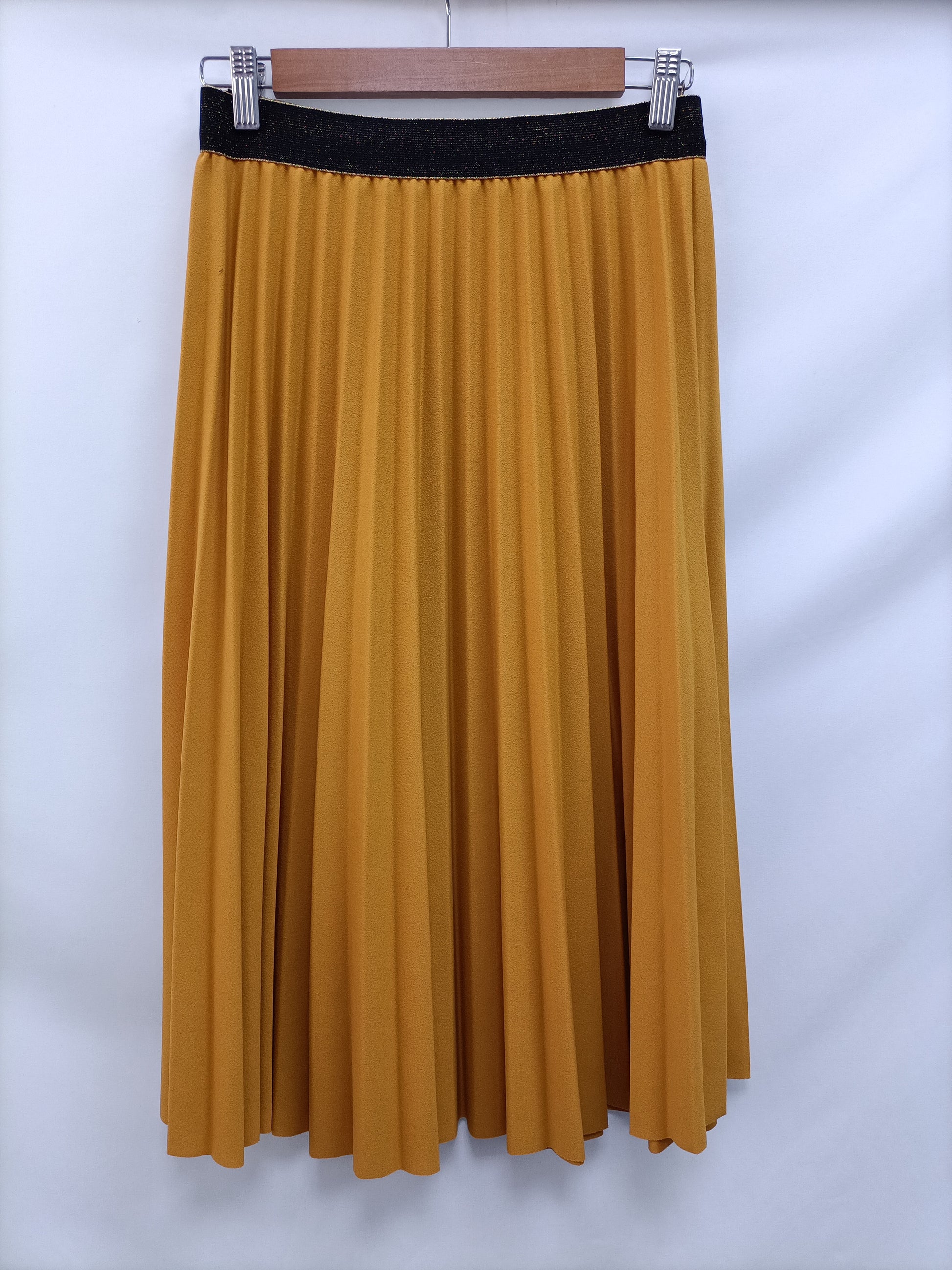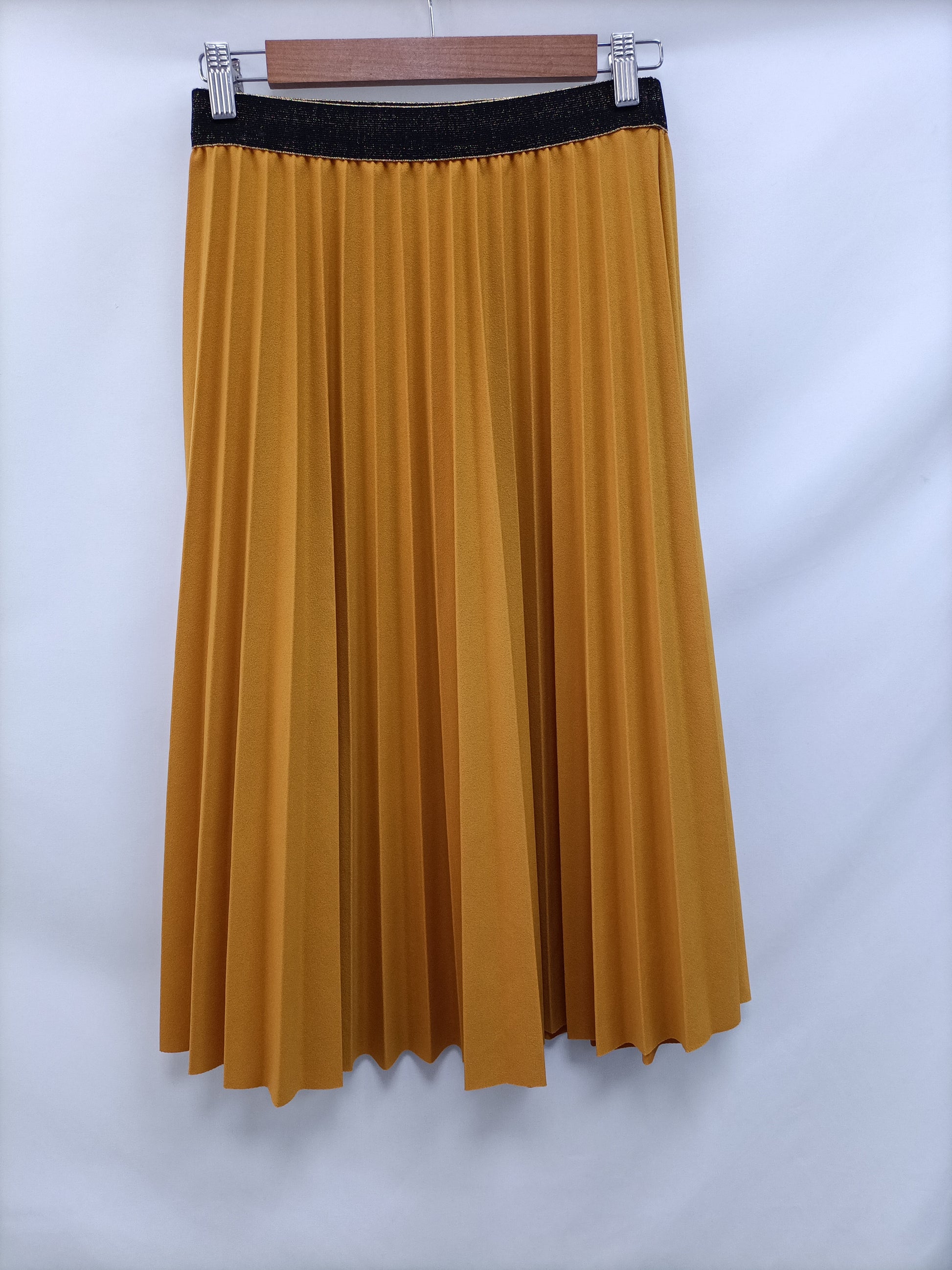 Falda midi mostaza con la cintura elástica. Largo 70 cm