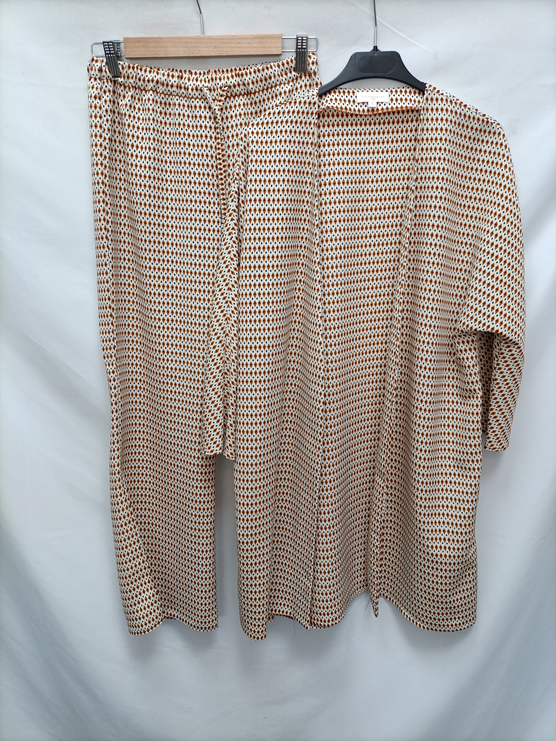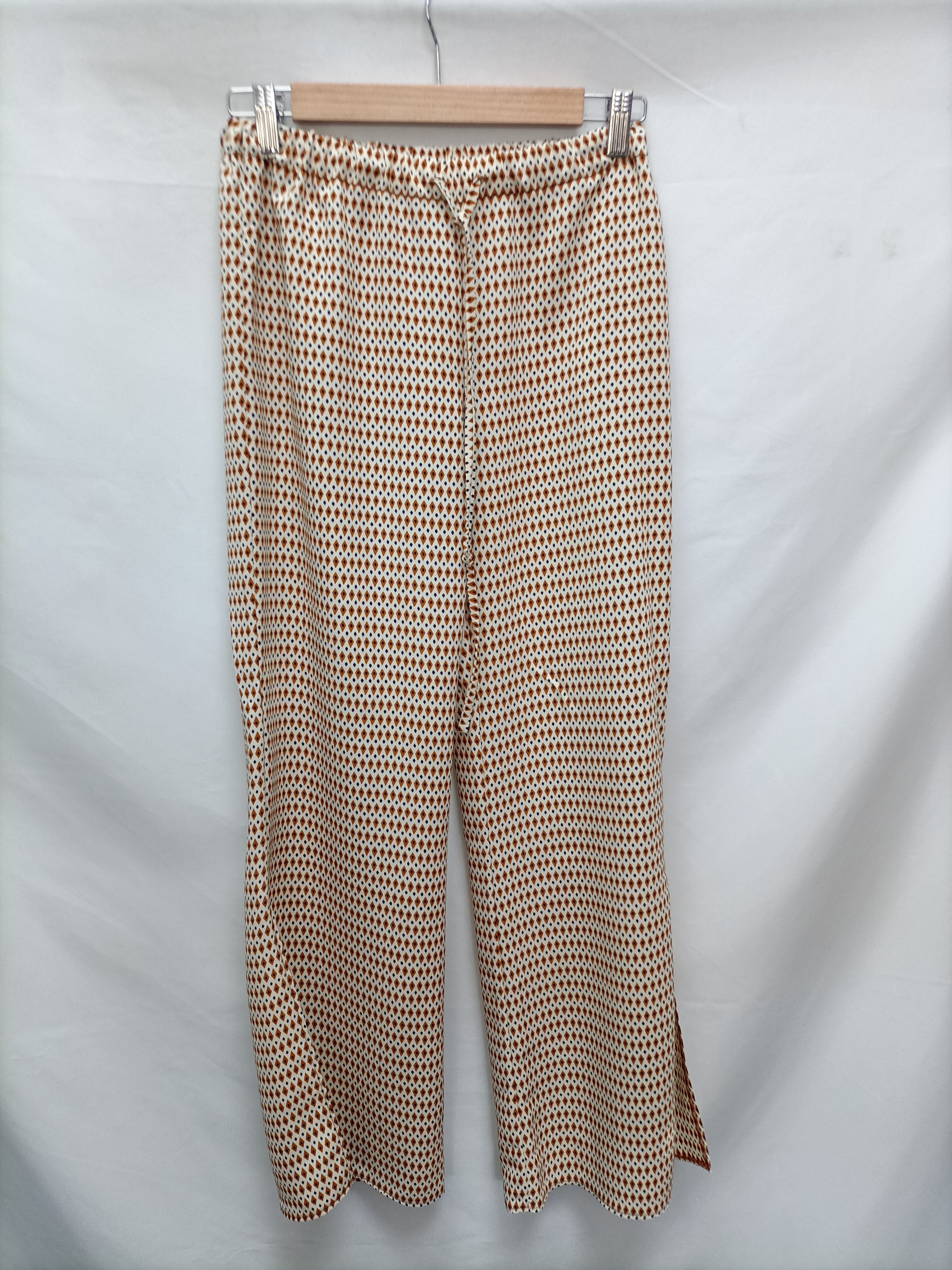 Pantalón fluido beige con estampado de rombos en tonos ocre. Cintura elástica y detalle de aperturas laterales. largo 96 cm
