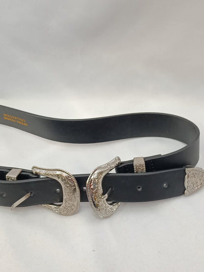 Cinturon negro doble hebilla plateada. Largo 83 cm