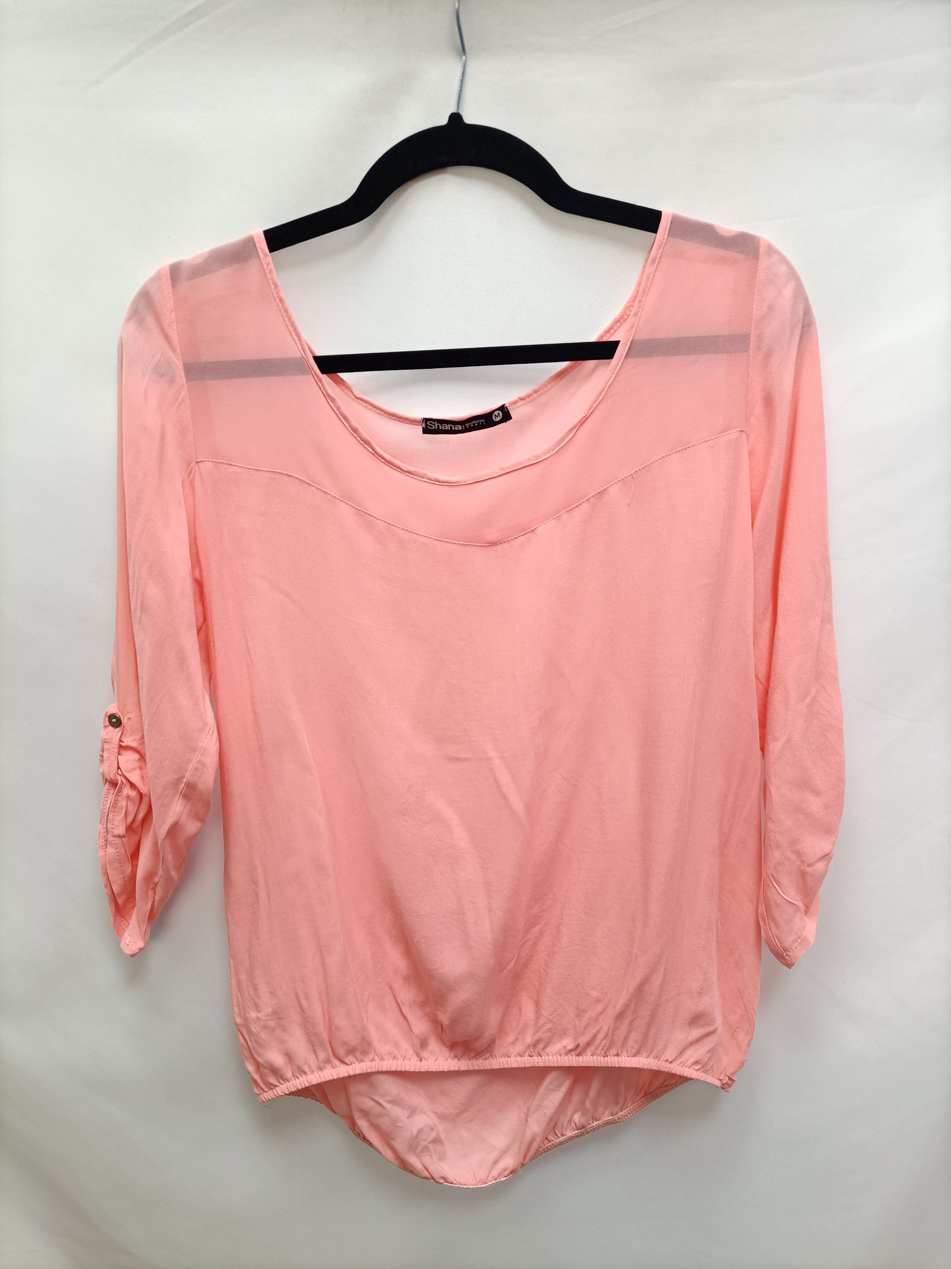 Blusa fluida rosa con el Escote semitransparente y elastico en la cintura. Largo 59 cm