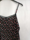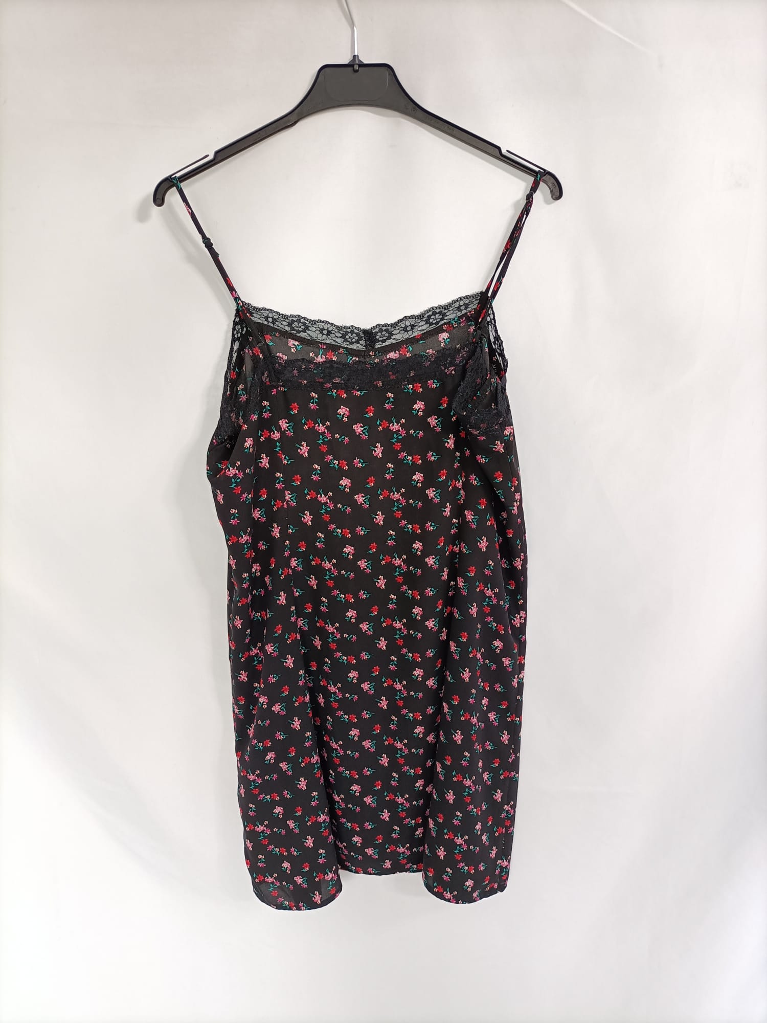 Hym. 42. Vestido negro lencero con florecitas rosas. Tirantes ajustables. No elástico. Detalle de encaje. De sisa a sisa 50 cm largo 86 cm
