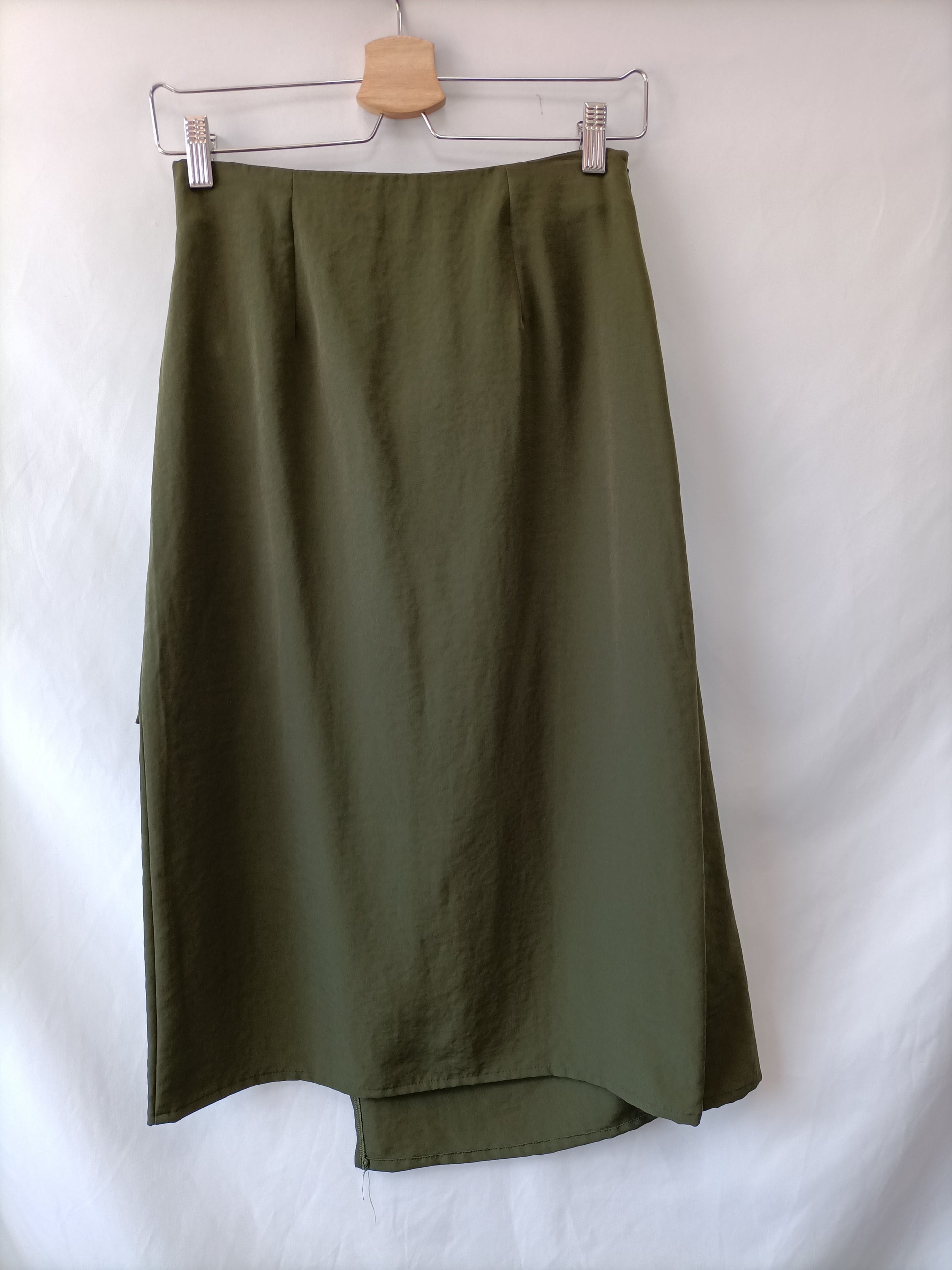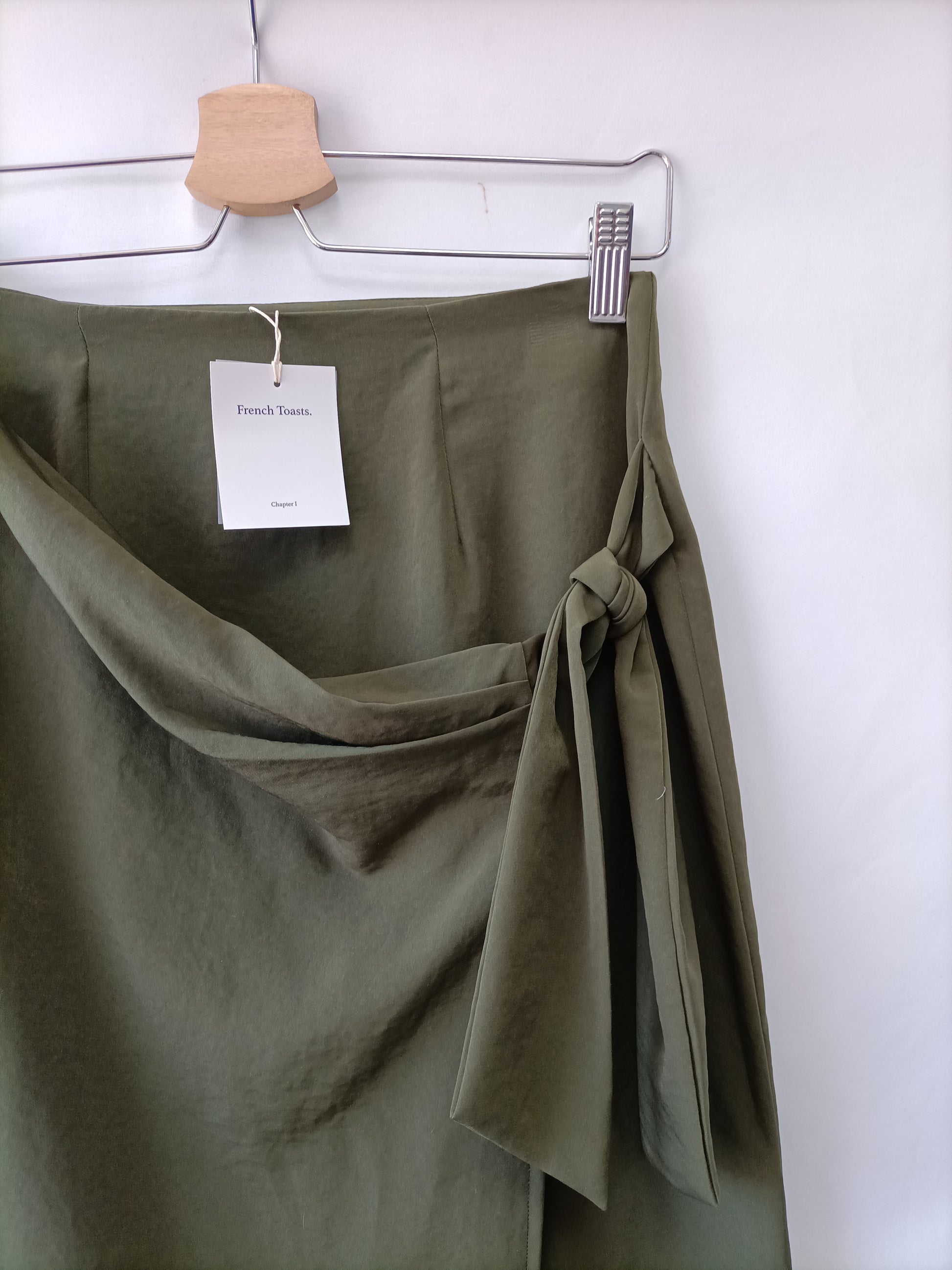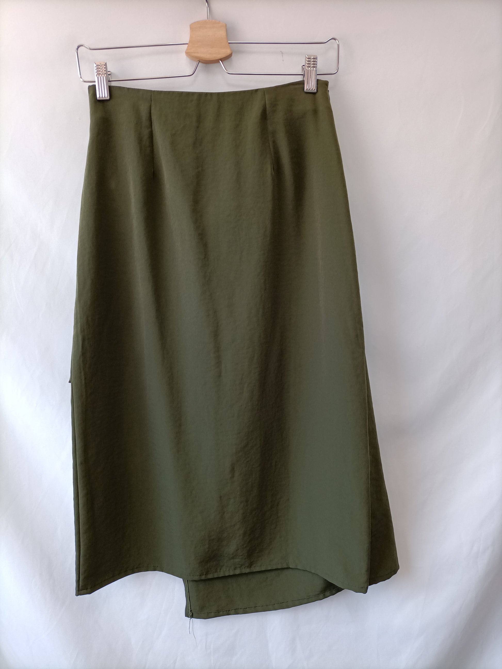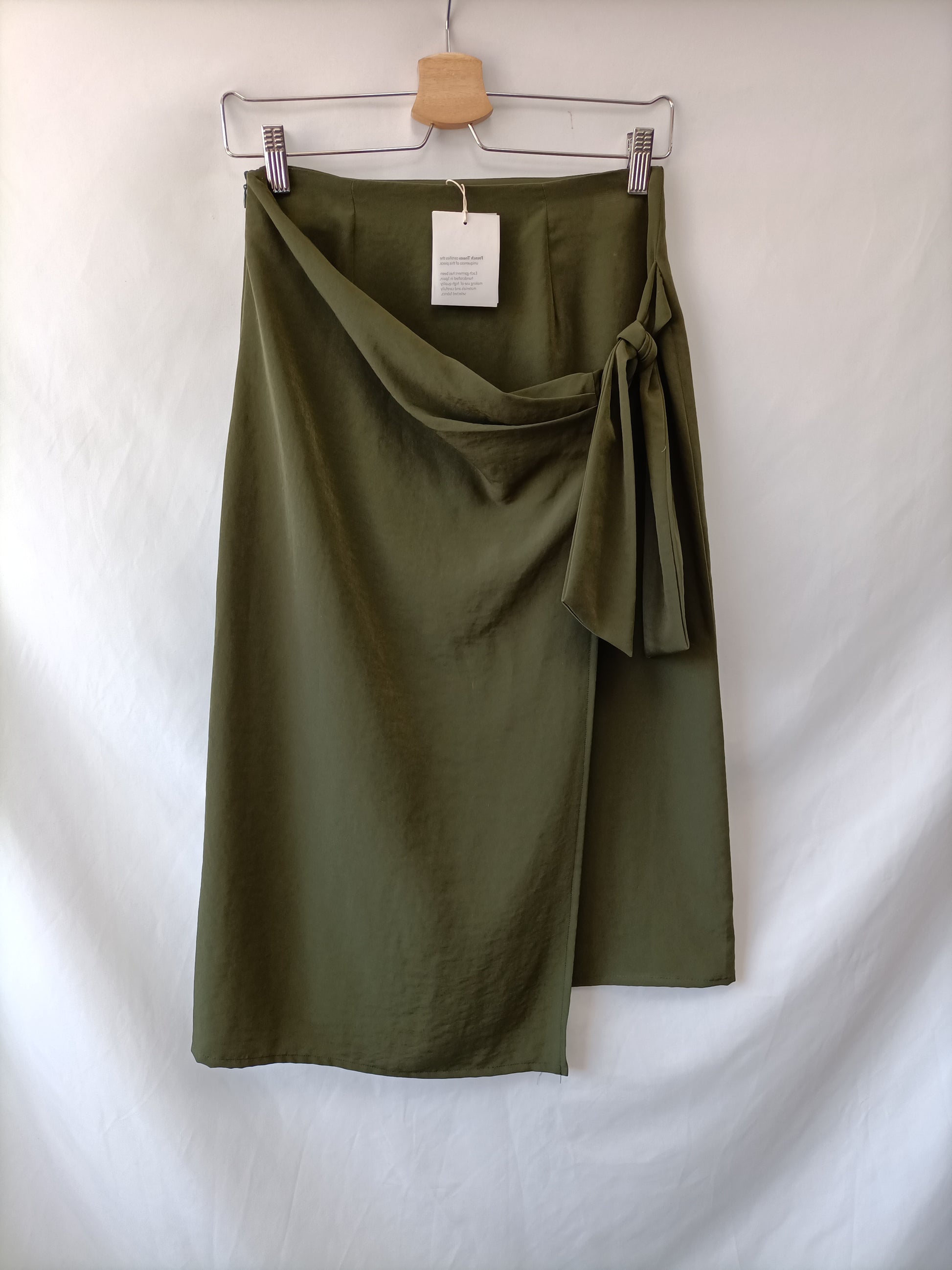 NUEVO CON ETIQUETA. Falda midi verde efecto cruzado. Lazada lateral. No elástica. Cintura 34 cm largo 71 cm