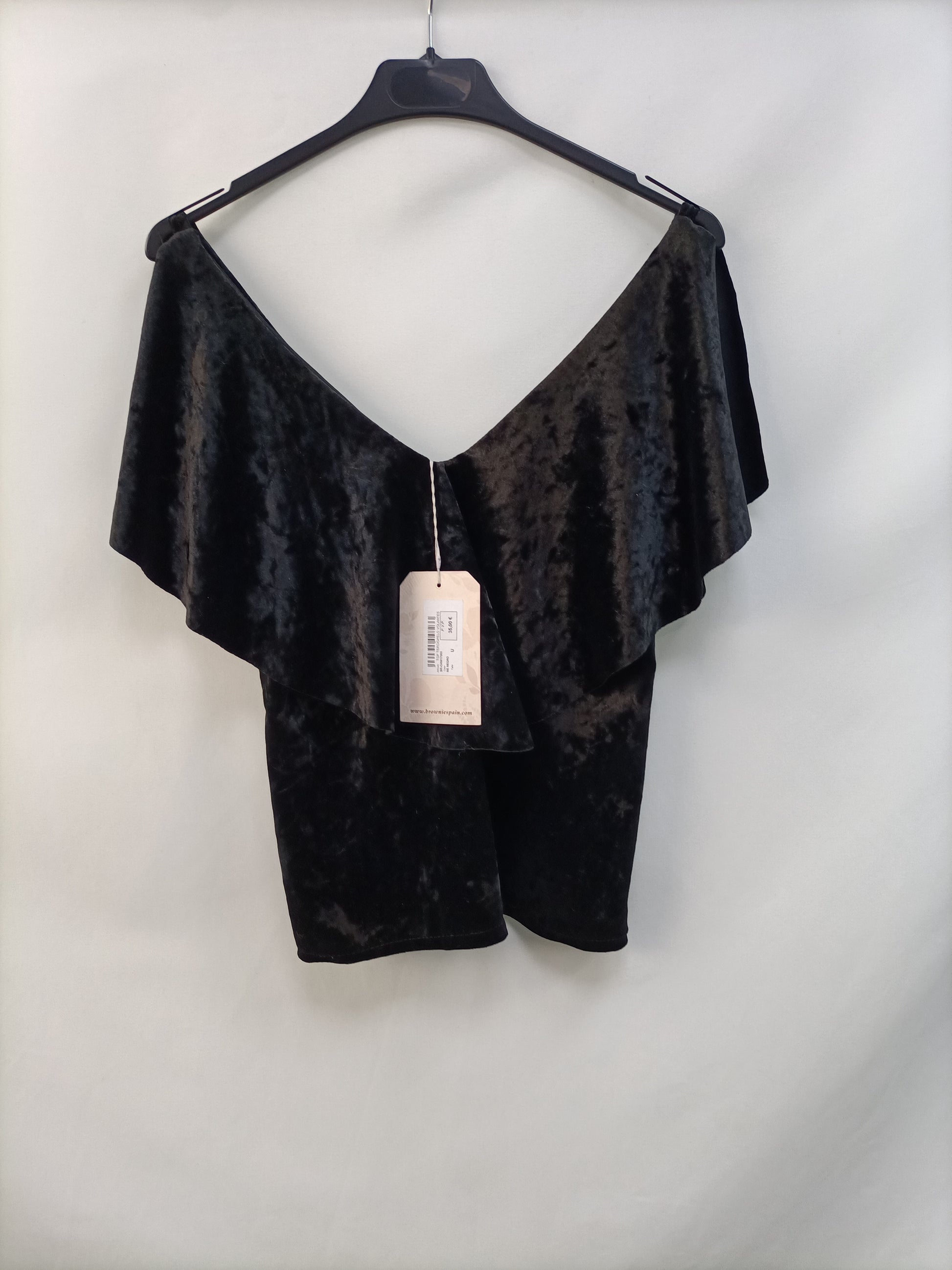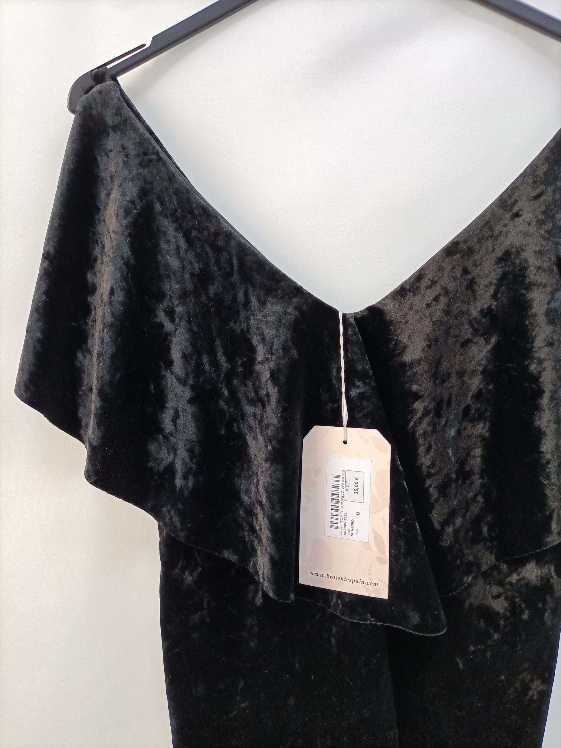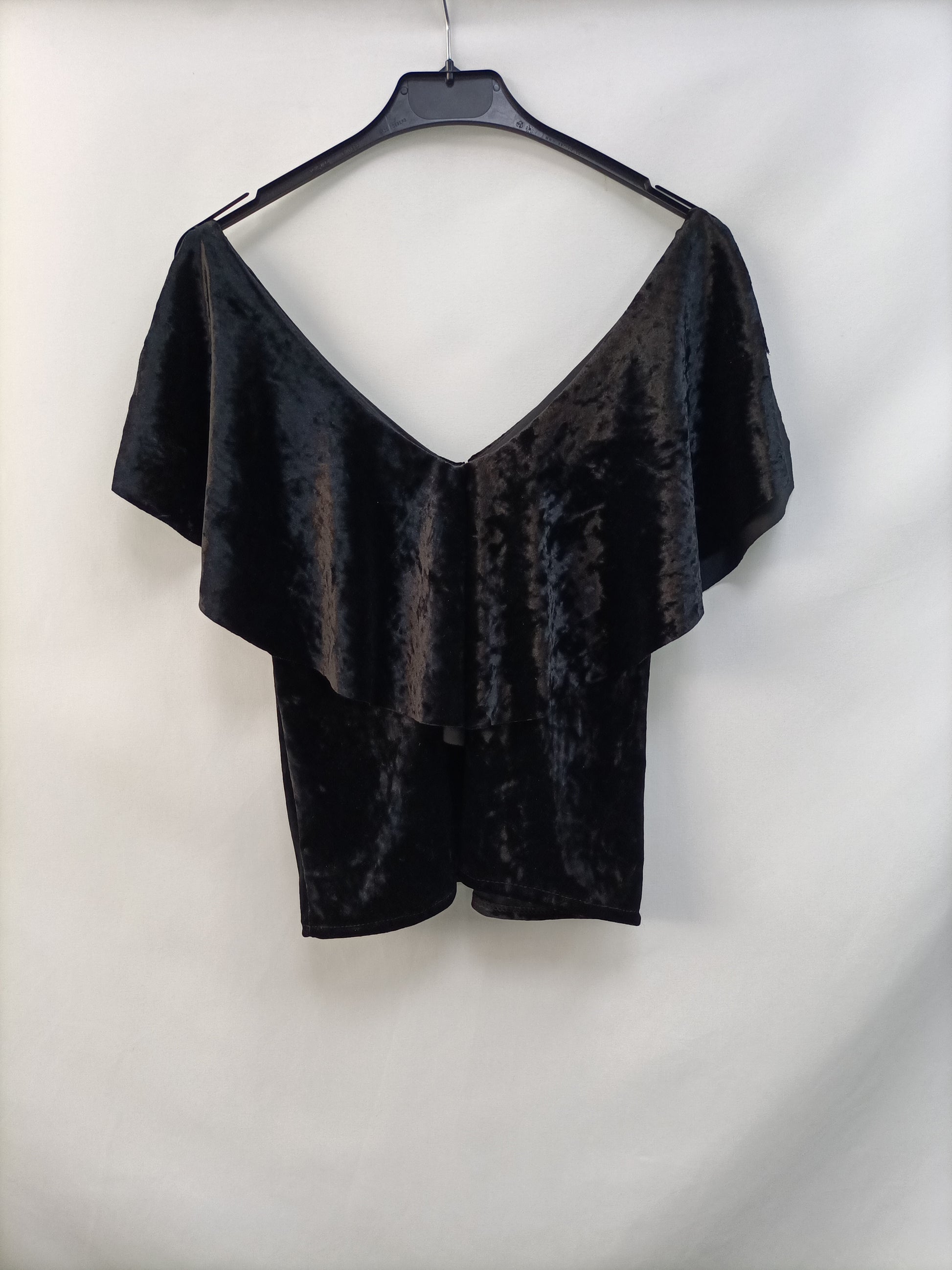 NUEVO CON ETIQUETA. Top negro de terciopelo con volante elástico. Largo 50 cm