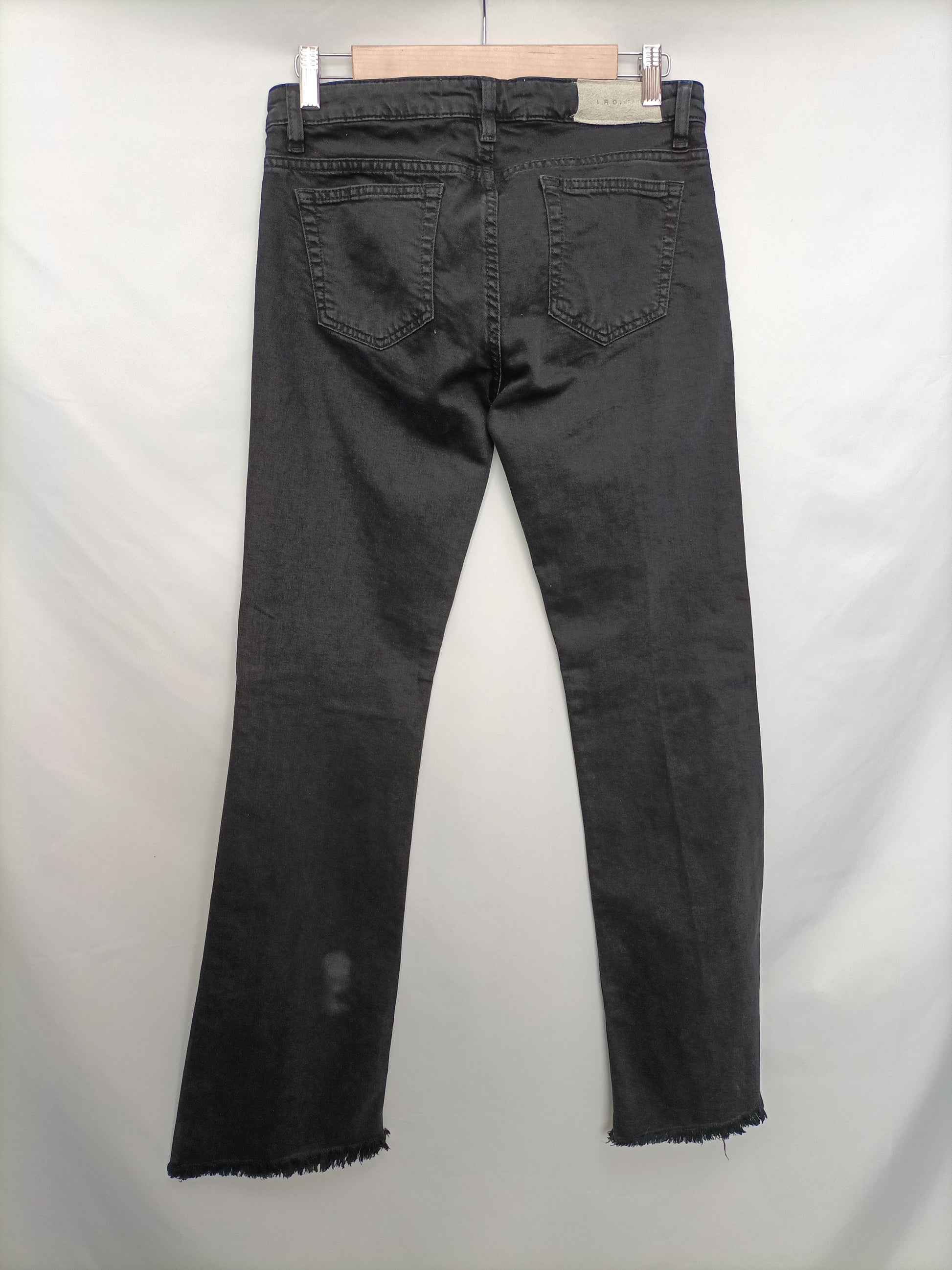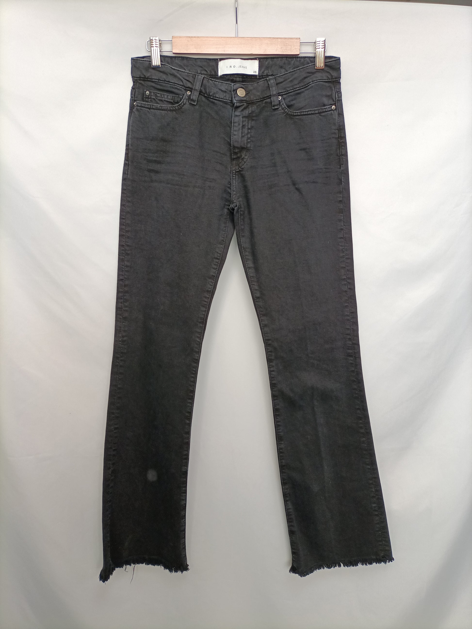 Pantalón denim negro de campana. deshilachado por debajo. Semielastico. Cintura 38 cm largo 108 cm