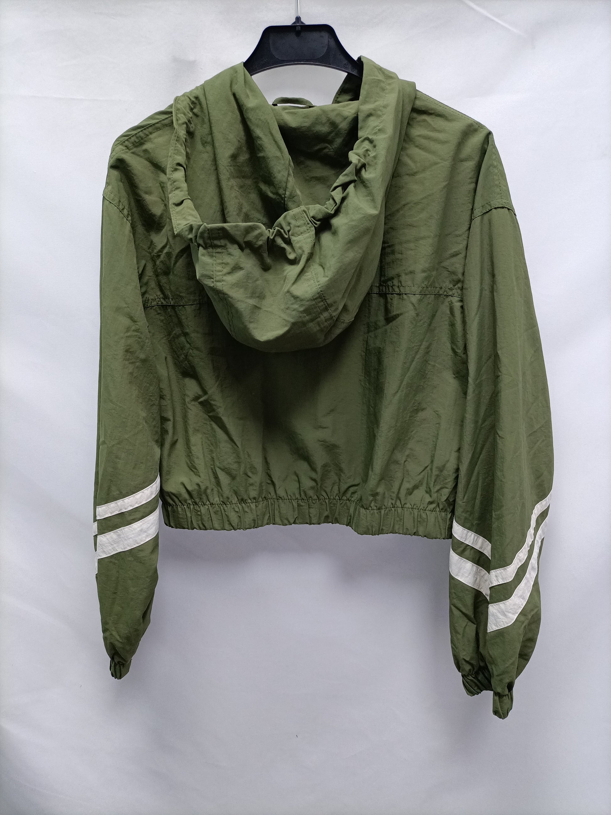 Chaqueta verde estilo impermeable cortita con detalle de rayas en las mangas. Elastico en la cintura. De sisa a sisa 53 cm largo 47 cm