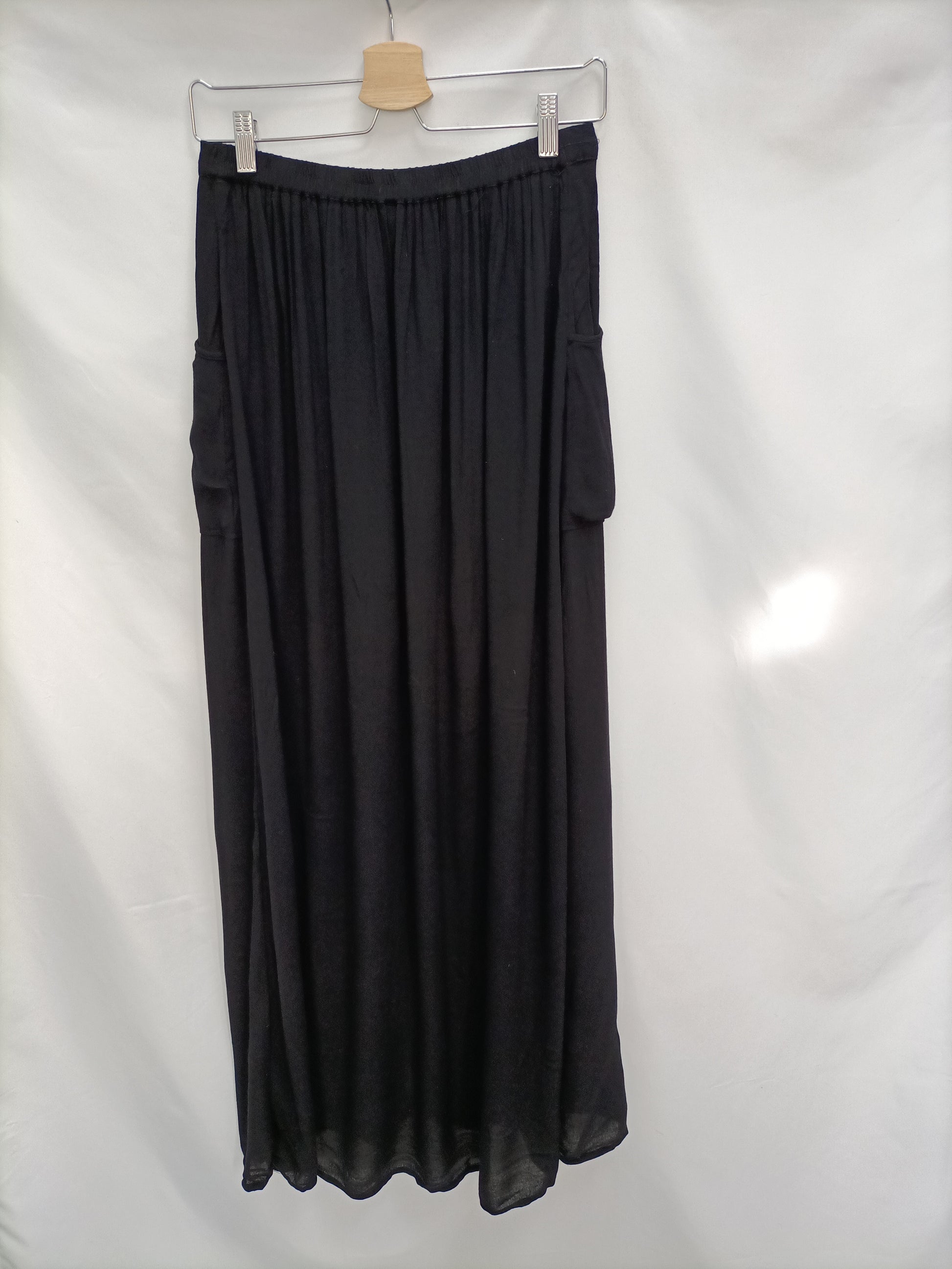 Falda fluida larga negra Abotonada. Cintira elástica. Largo 109 cm
