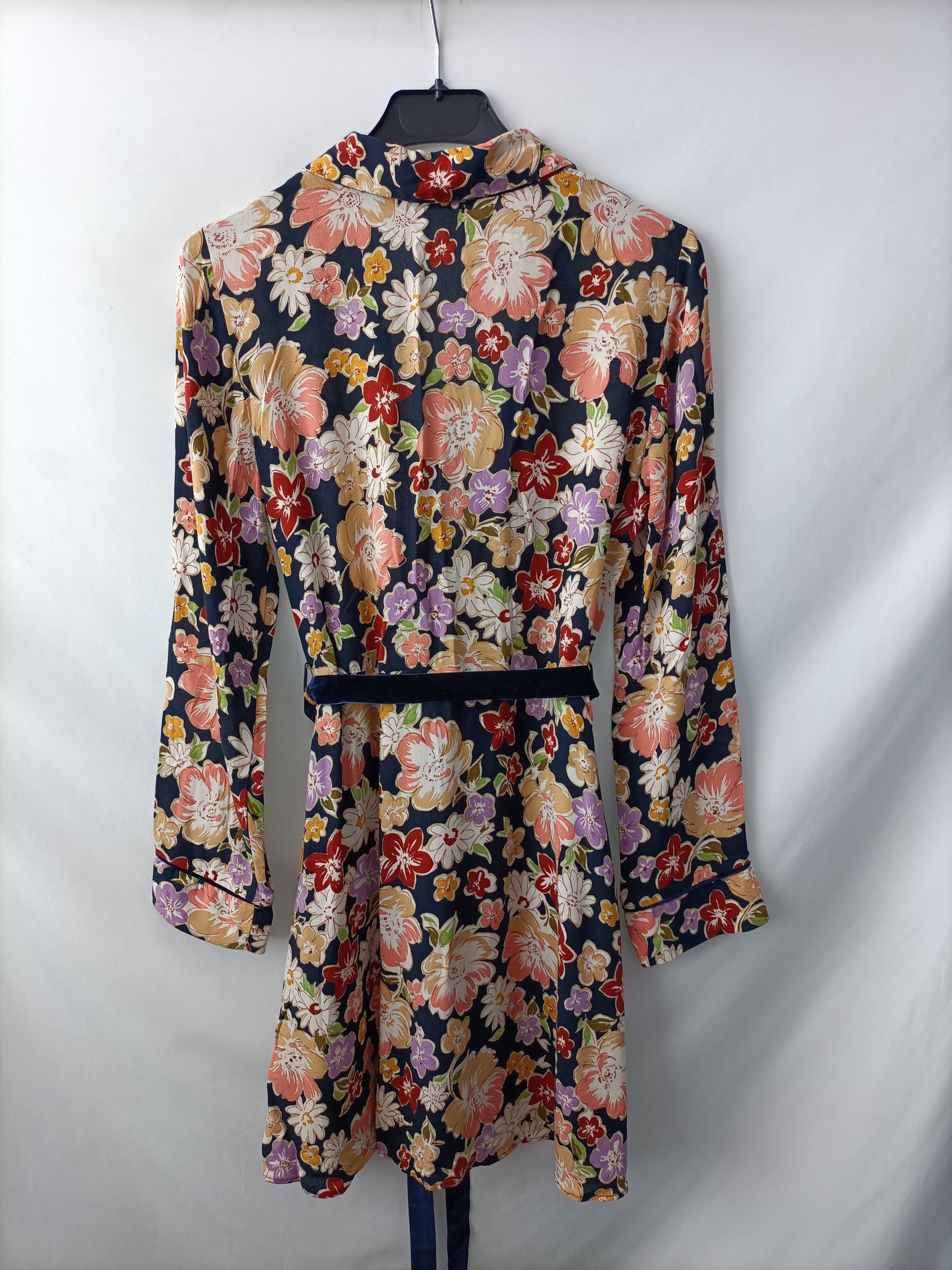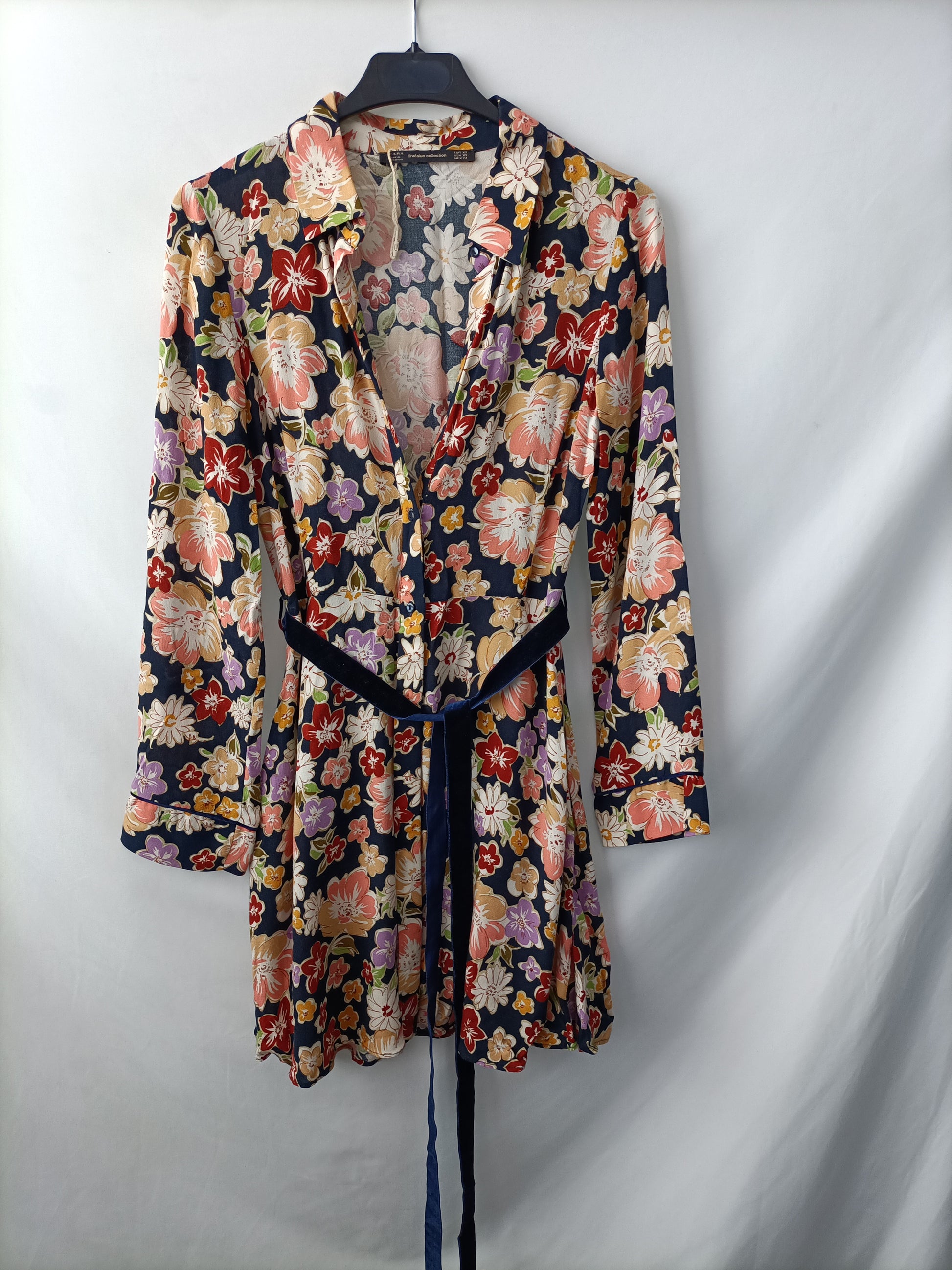 Vestido camisero azul con flores. Cinturón de terciopelo. De sisa a sisa 43 cm largo 84 cm