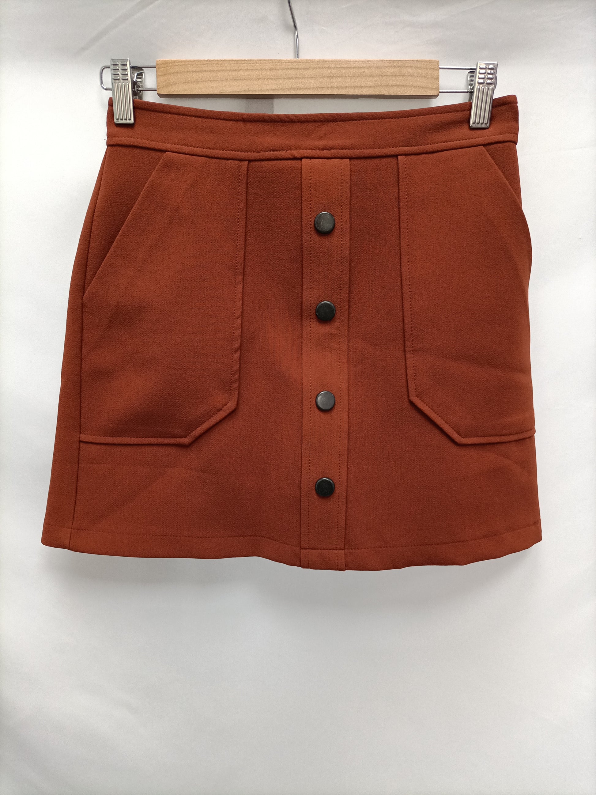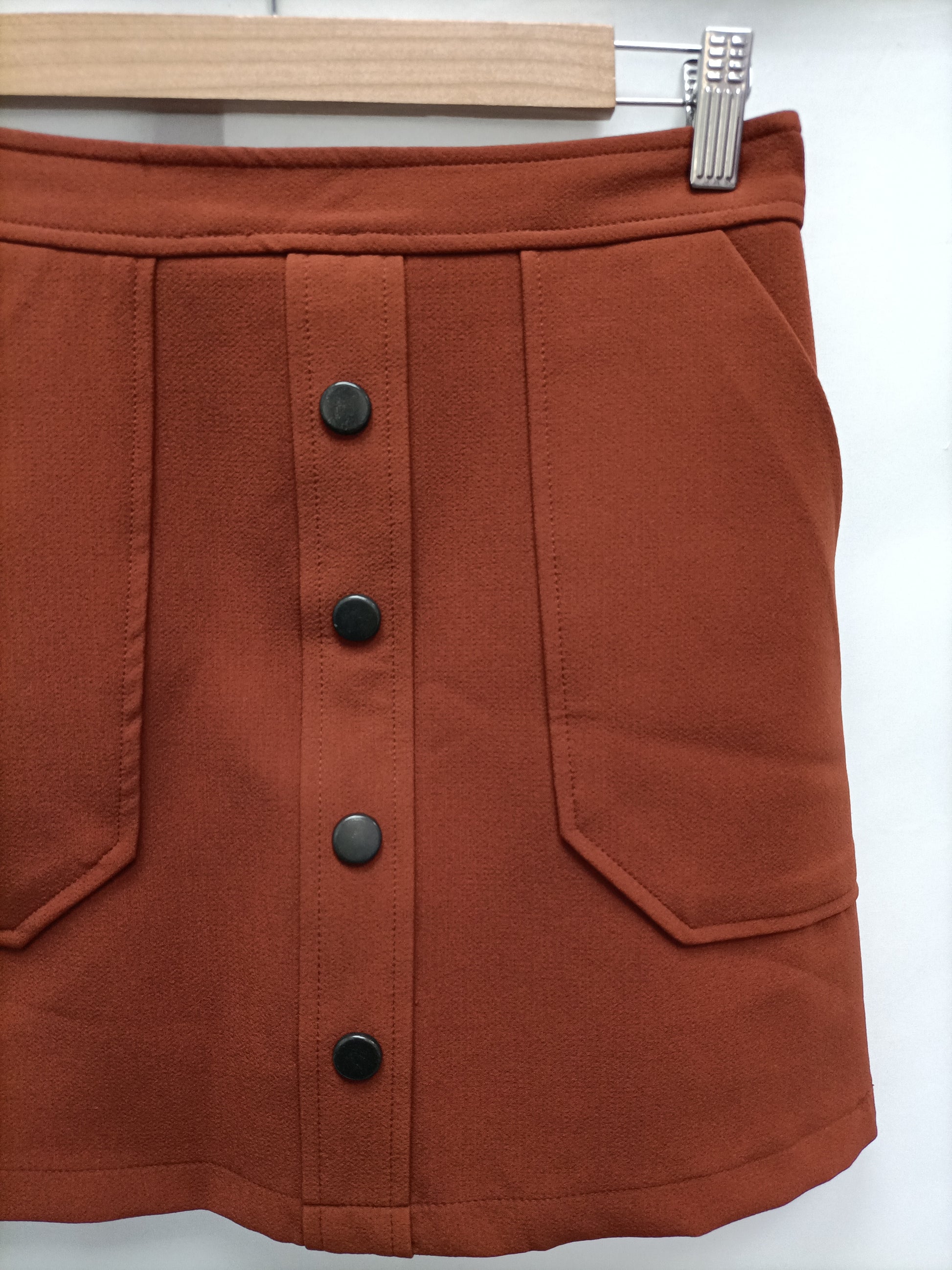 Falda corta color teja con botones delanteros de adorno. no elastica. Cintura 36 cm largo 39 cm.