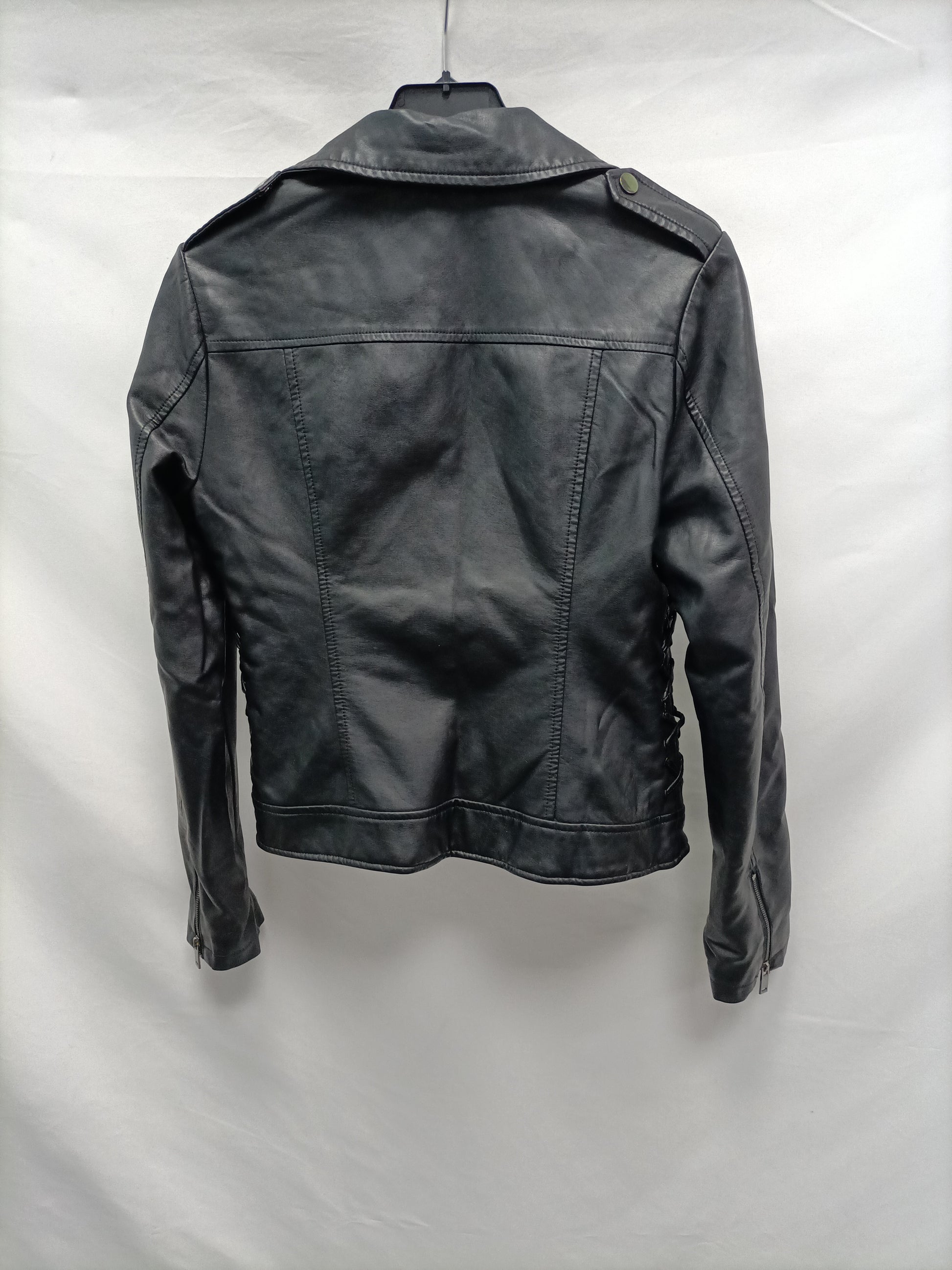 Cazadora estilo Biker negra de polipiel. Detalle de cuerdas en los laterales. Se abrocha con cremallera y no es elástica. De sisa a sisa 41cm largo 57 cm