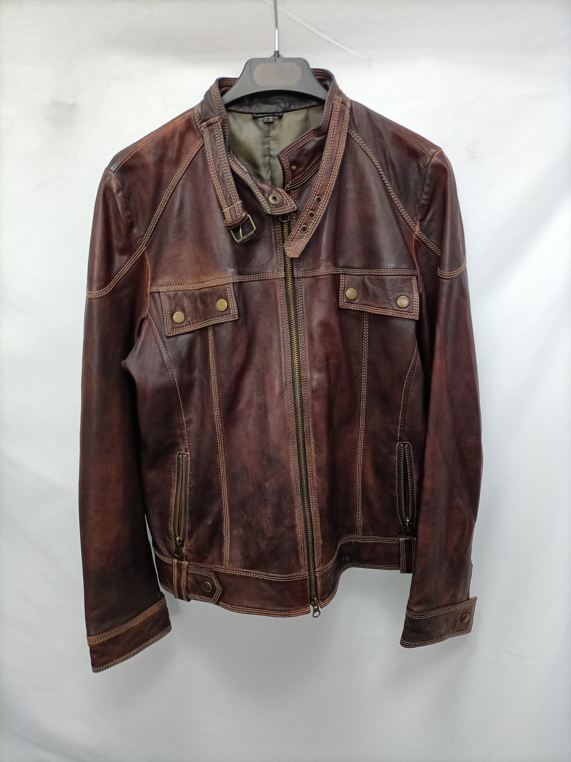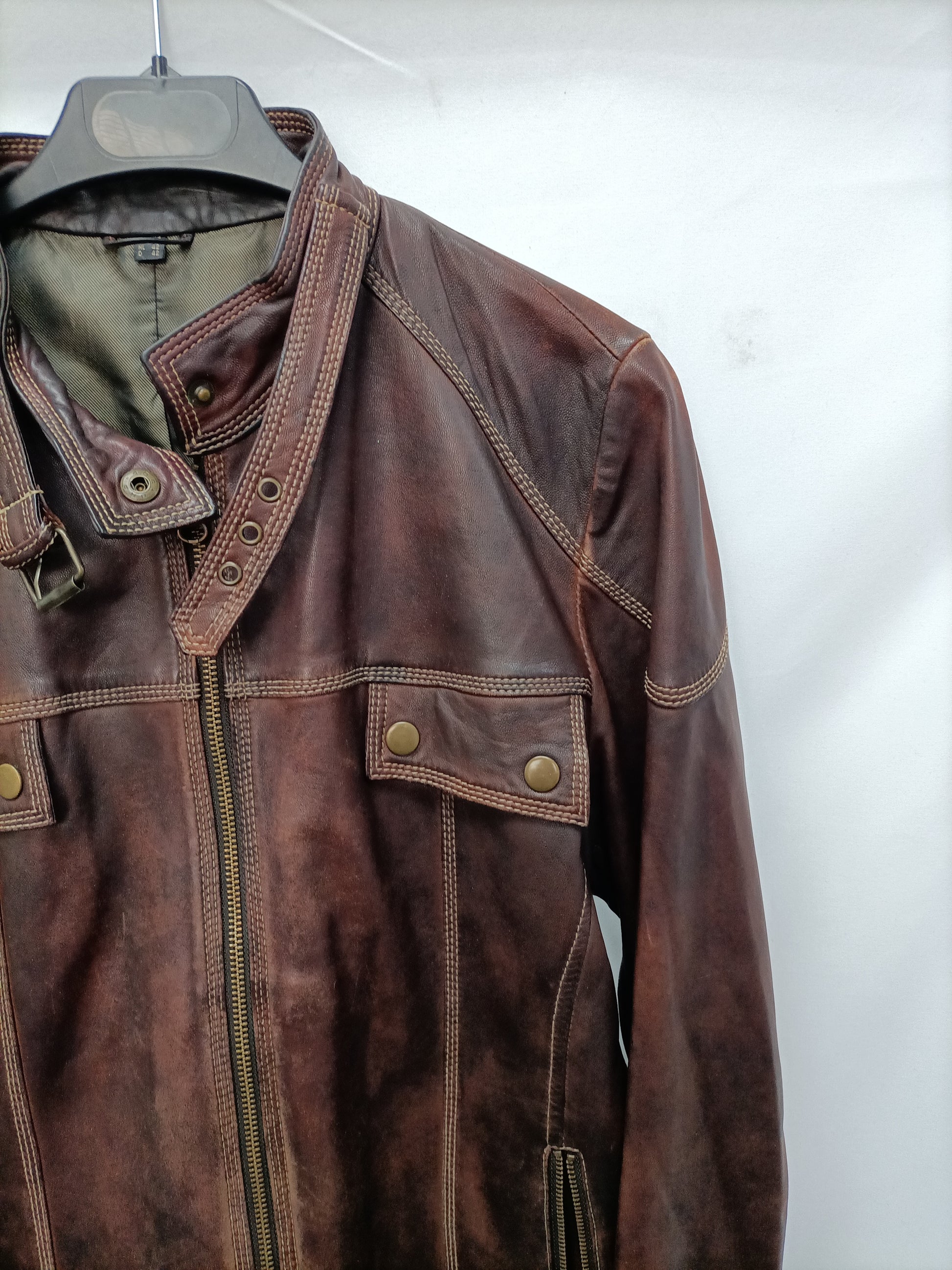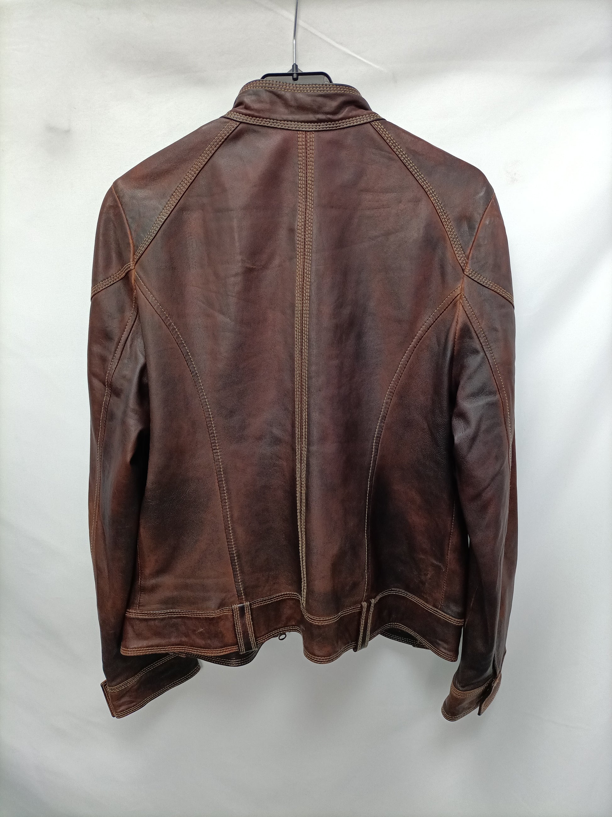 Cazadora marrón efecto desgastado estilo piel. No elástica. De sisa a sisa 52 cm largo 59 cm
