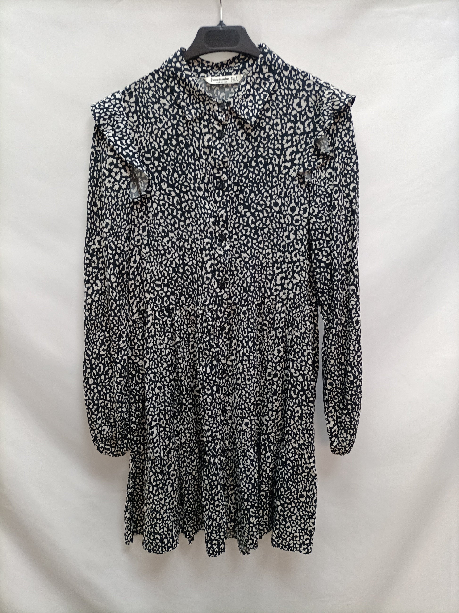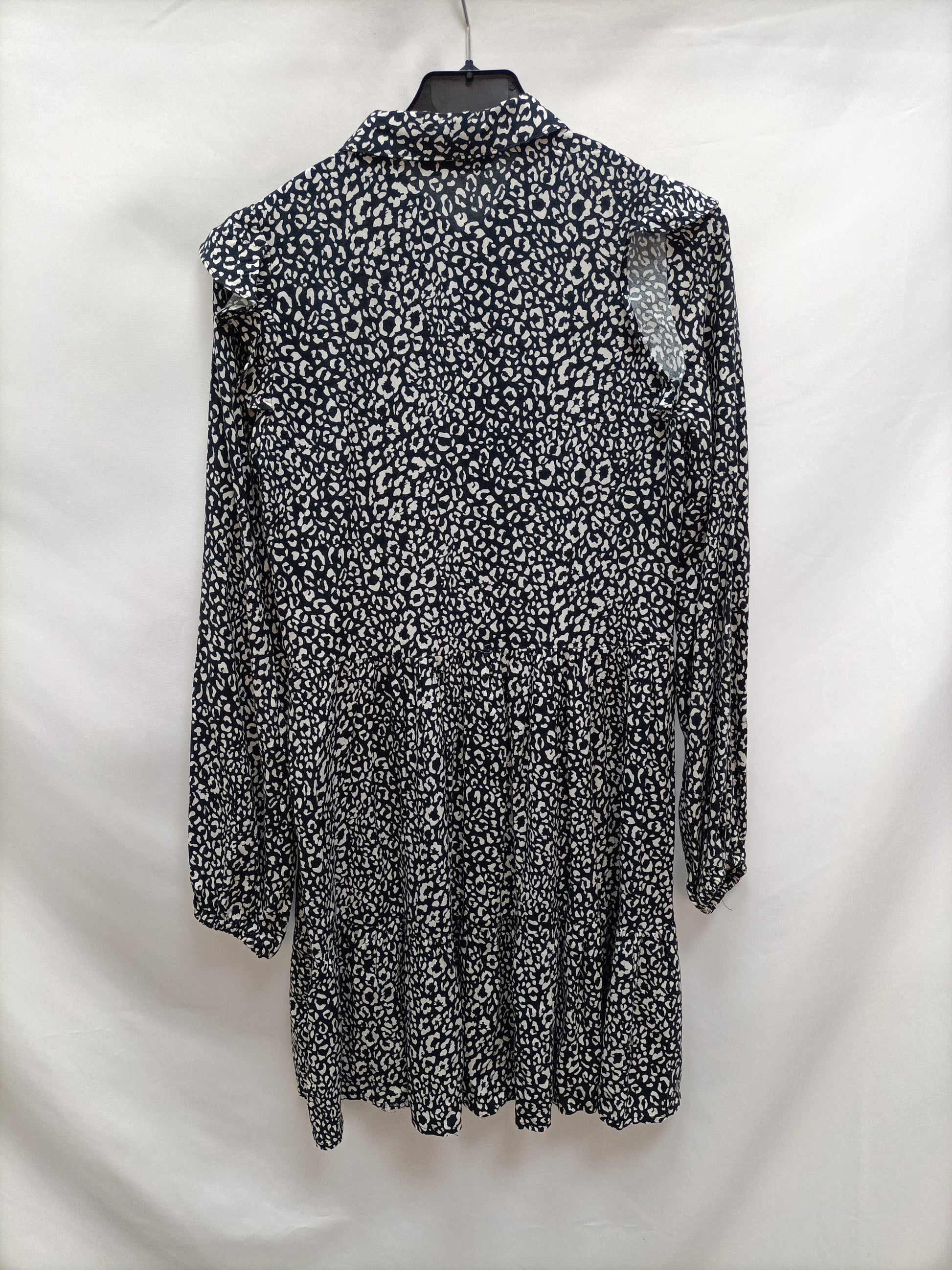 Vestido corto estilo camisero Abotonado animal print. Volantes en las mangas. No elástico. De sisa a sisa 42 cm largo 89 cm