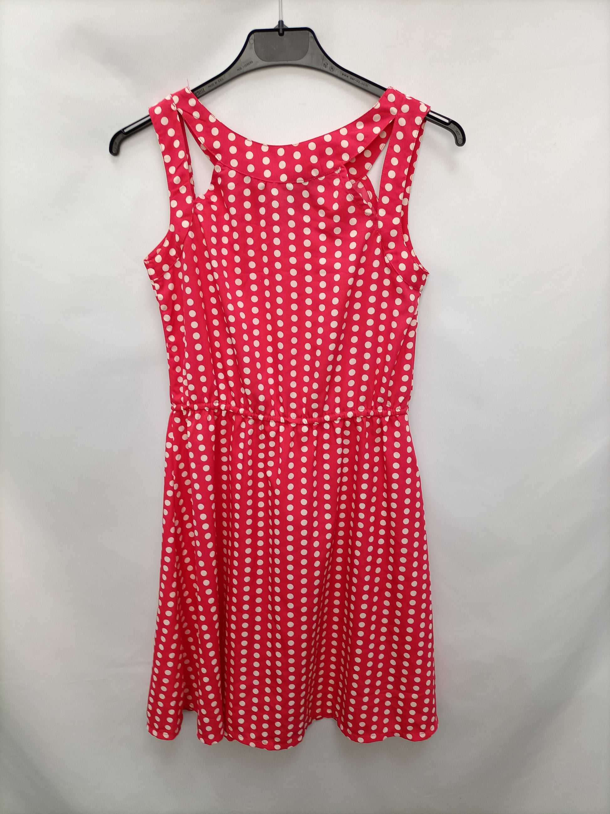 Vestido corto rosa con lunares blancos. No elástico. De sisa a sisa 41 cm largo 84 cm