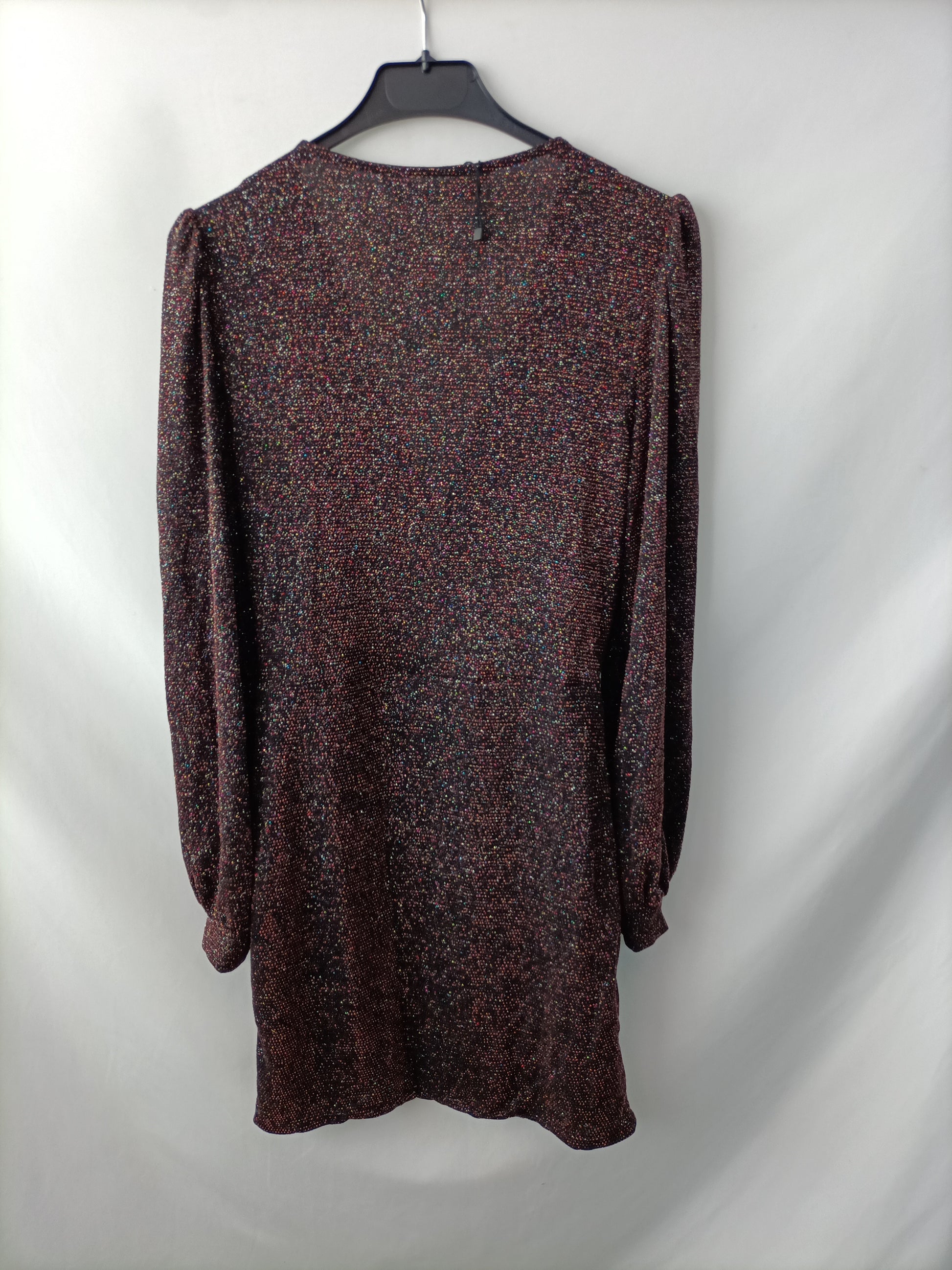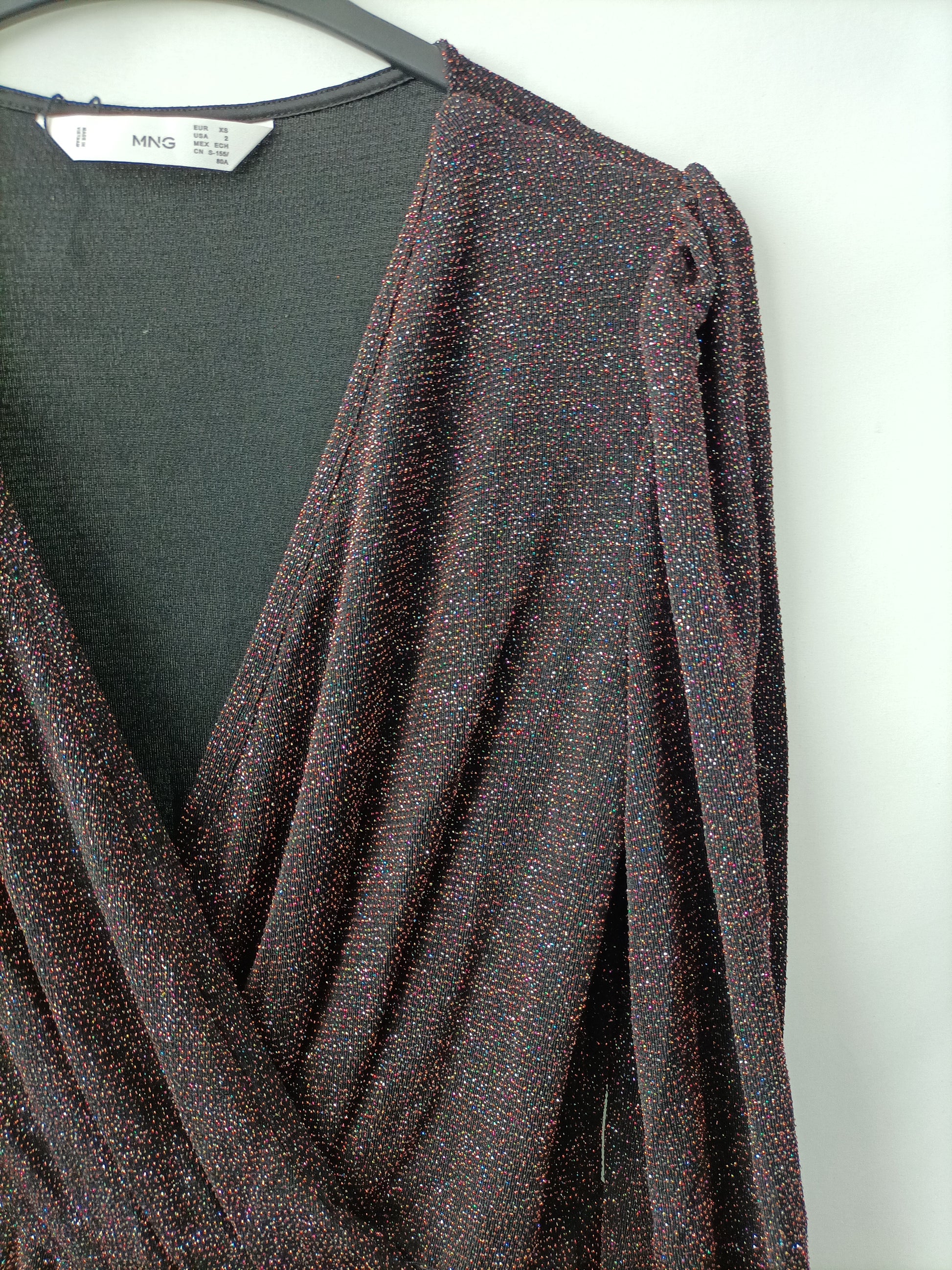 Vestido corto negro con purpurina de colores. Escote cruzado. Muy elástico. Largo 79 cm.