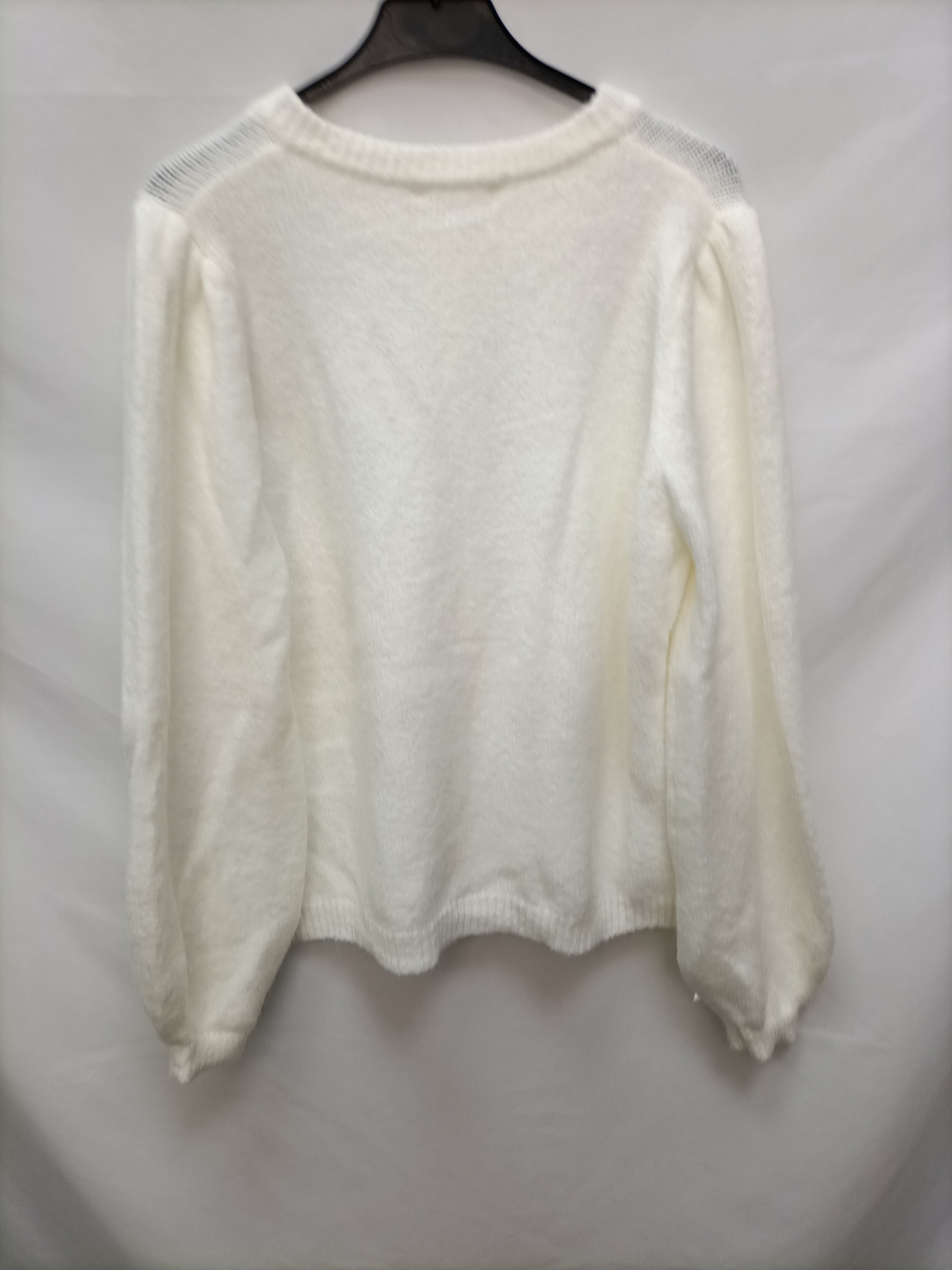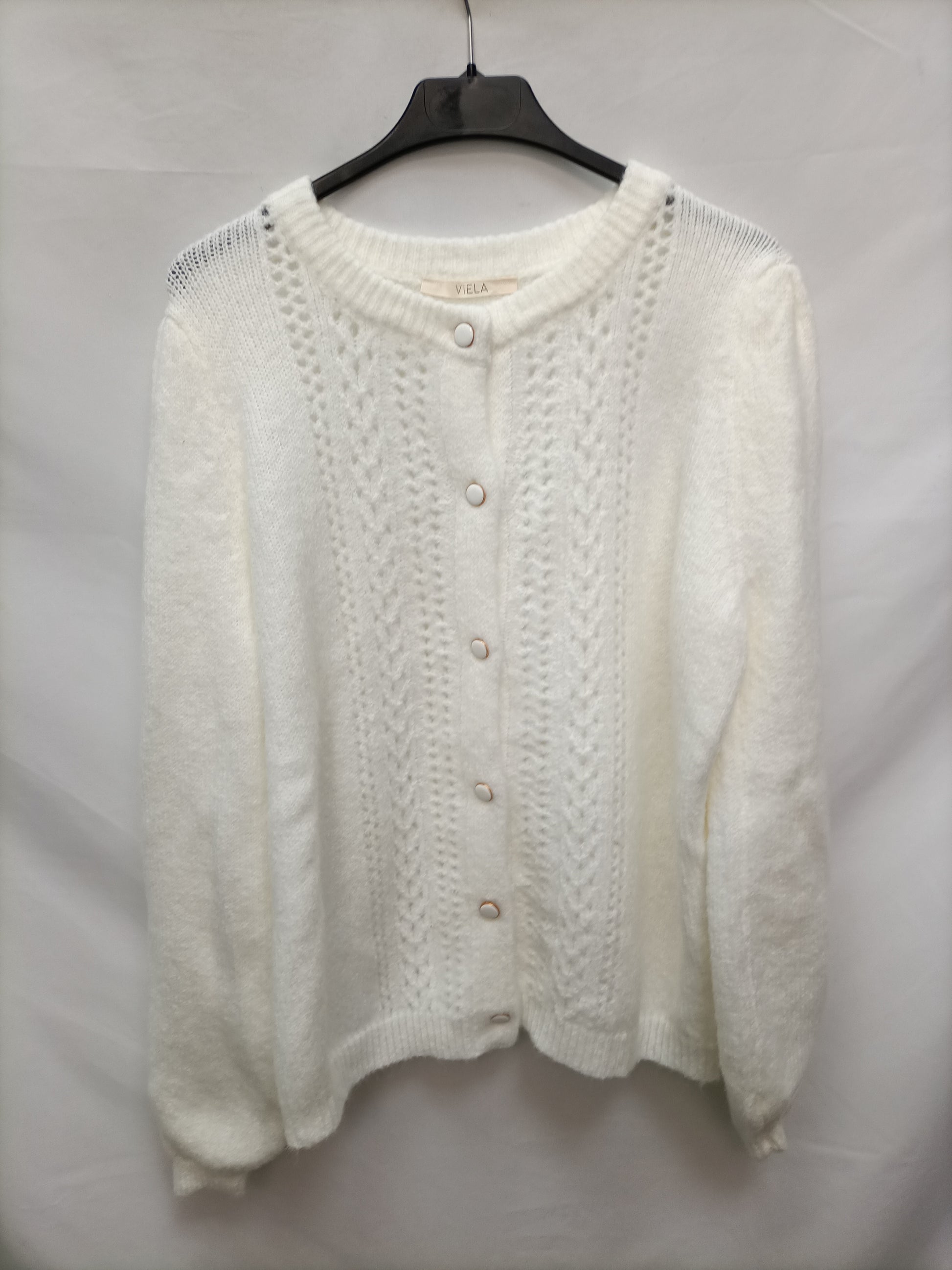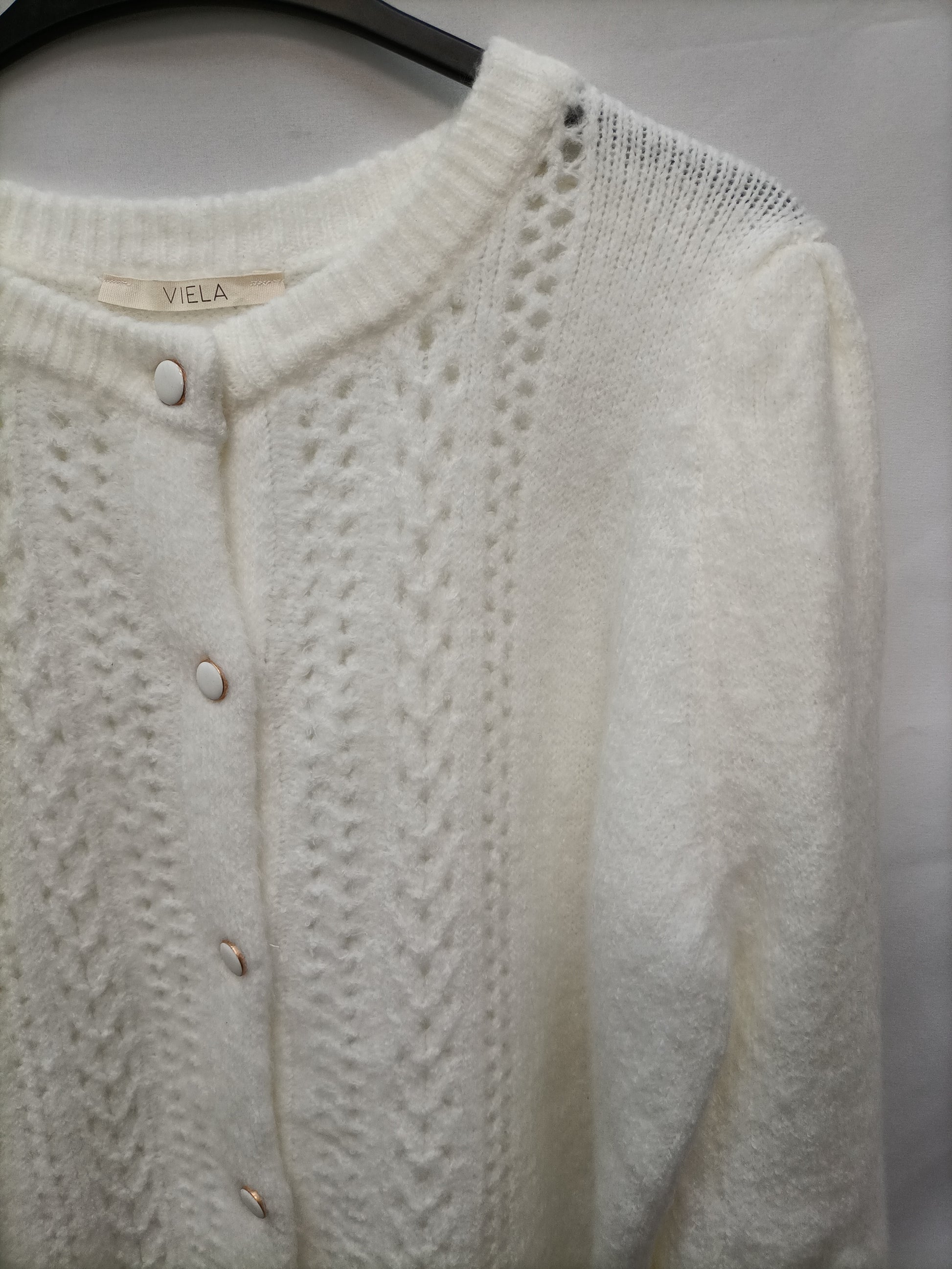 Rebeca blanco roto troquelada con botones de clip blancos. Elastico. Con las mangas ligeramente Abullonadas. largo 59 cm