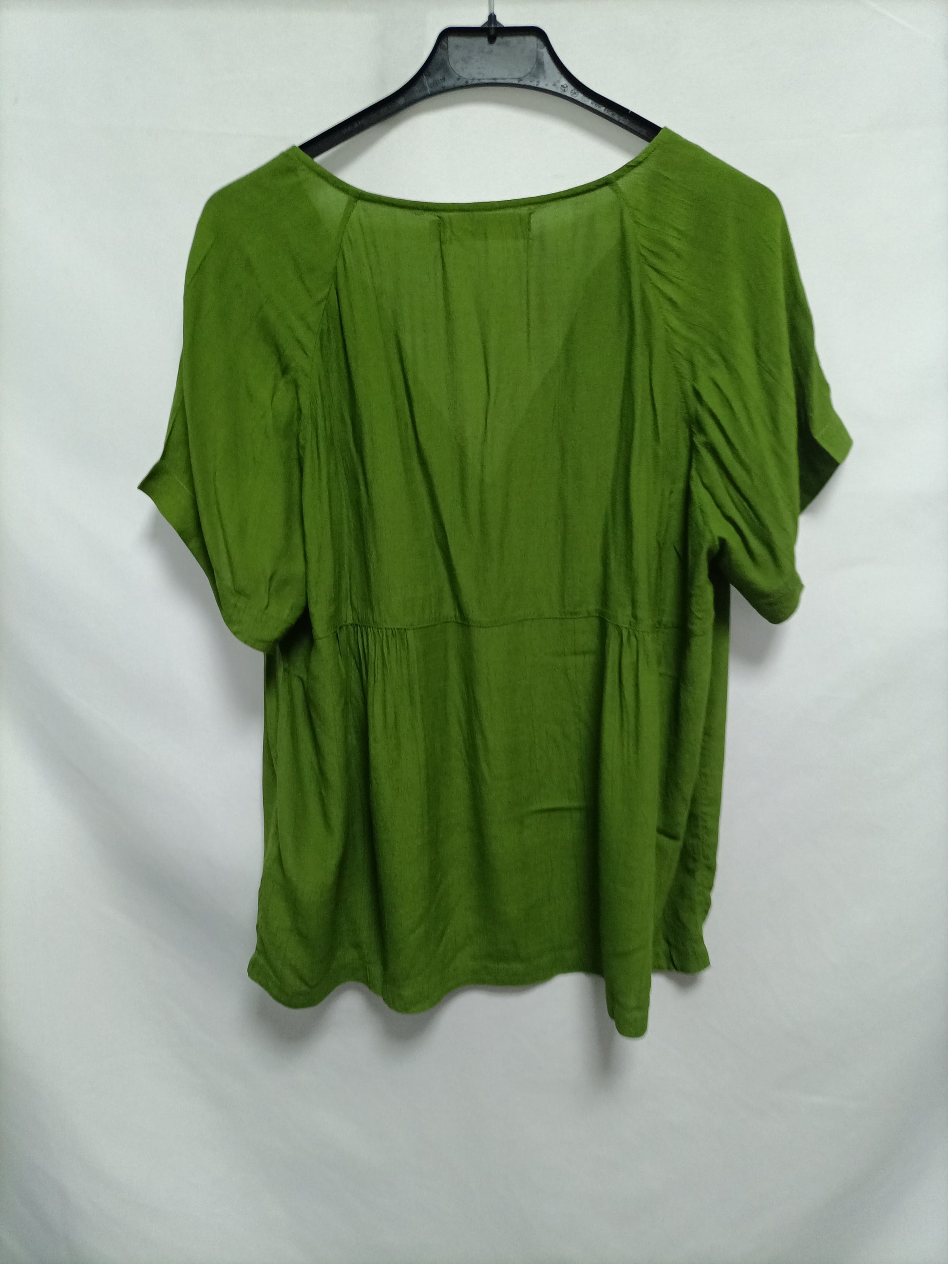 Blusa fluda verde con botoncitos en el escote. No elástica. De sisa a sisa 43 cm Largo 62 cm