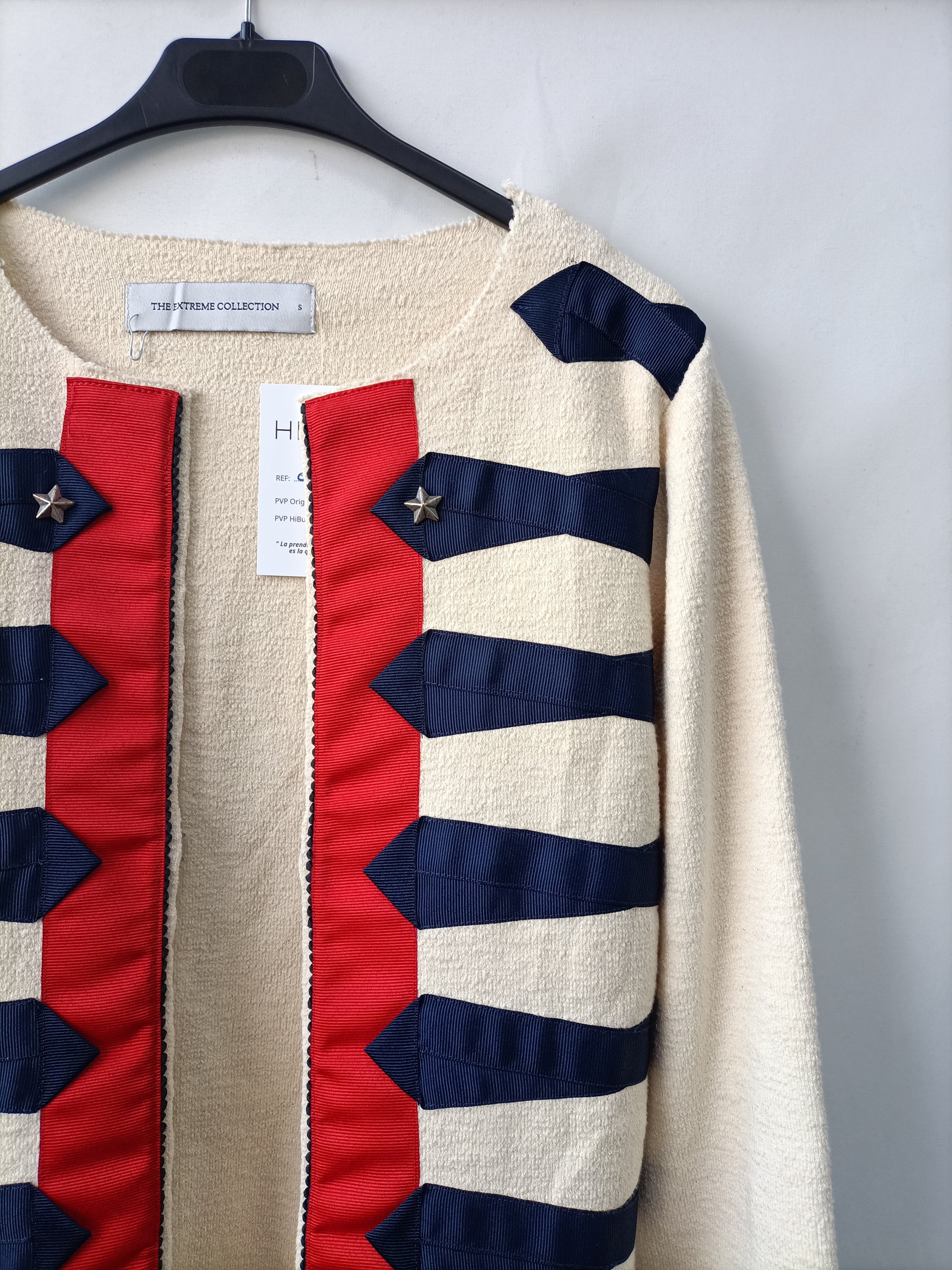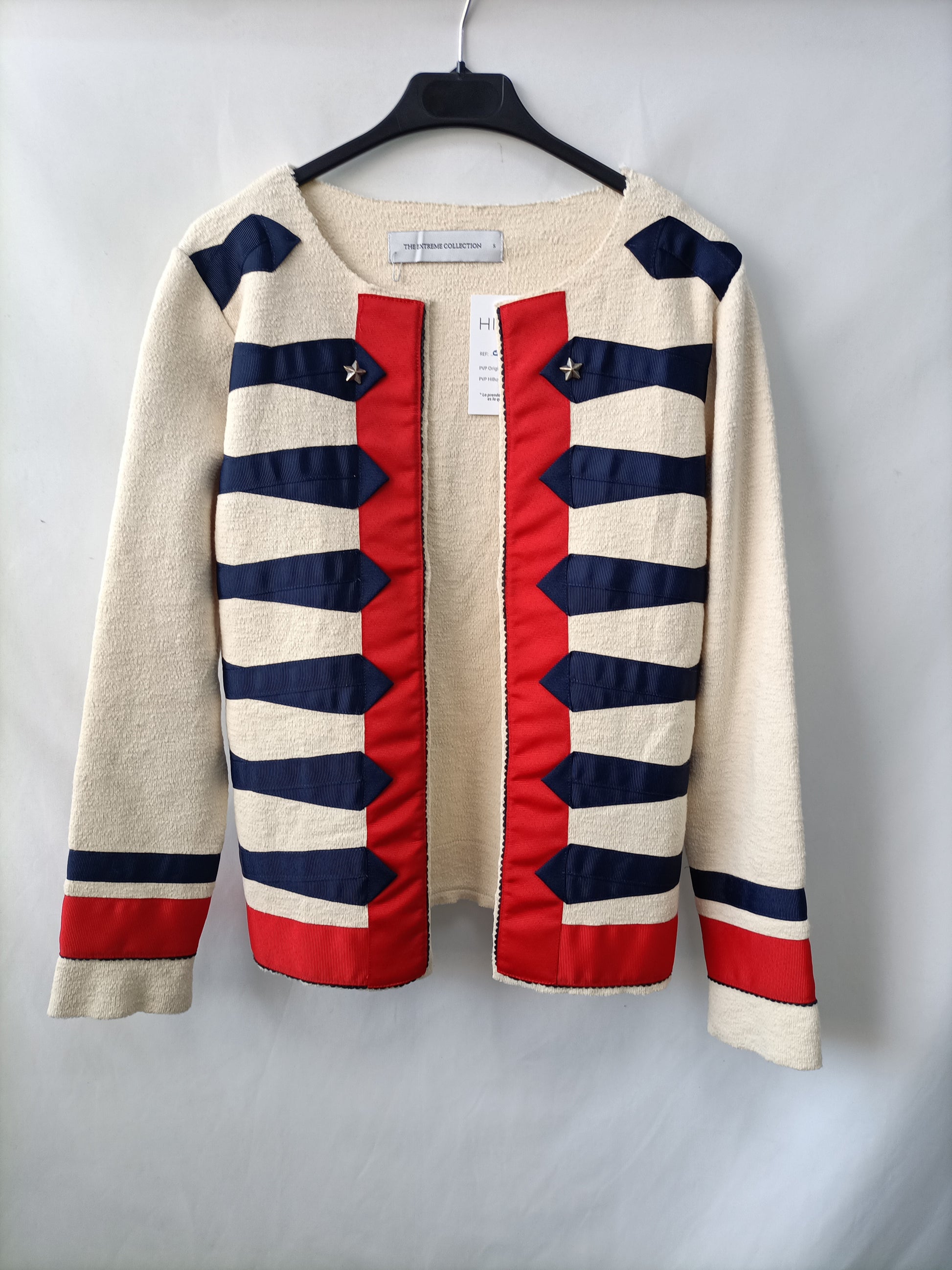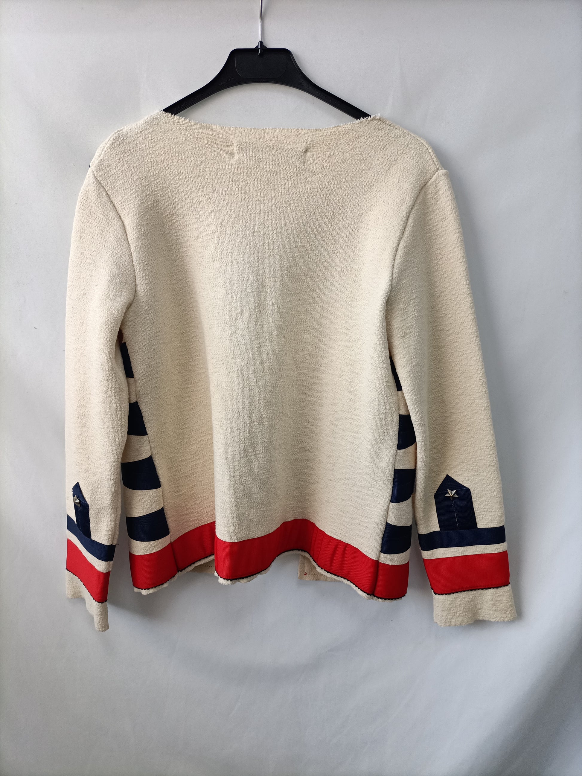 Chaqueta beige de punto con detalles en rojo y azul. Se abrocha con corchetes. Largo 55 cm